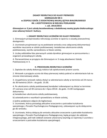 ZASADY REKRUTACJI DO KLASY PIERWSZEJ GIMNAZJUM NR 3 w ZESPOLE SZKÓŁ Z DODATKOWĄ NAUKĄ JĘZYKA BIAŁORUSKIEGO IM. J.KOSTYCEWICZA W BIELSKU PODLASKIM r. szk. 2014/2015 Gimnazjum nr 3 jest szkołą bezobwodową z dodatkową nauką języka białoruskiego oraz własnej historii i kultury. I. ZASADY REKRUTACJI UCZNIÓW DO KLASY PIERWSZEJ 1. Gimnazjum przeprowadza rekrutację uczniów w oparciu o zasadę powszechnej dostępności. 2. Uczniowie przyjmowani są na podstawie wniosku oraz załączonej dokumentacji wyników nauczania w szkole podstawowej: świadectwa ukończenia szkoły podstawowej, wyniku sprawdzianu w klasie szóstej. 3. Liczbę oddziałów klas pierwszych ustala dyrektor gimnazjum w porozumieniu z organem prowadzącym szkołę. 4. Pierwszeństwo w przyjęciu do Gimnazjum nr 3 mają absolwenci Szkoły Podstawowej nr 3. II. PROCEDURA REKRUTACJI UCZNIÓW 1. Zapisów do szkoły dokonują rodzice lub opiekunowie prawni ucznia. 2. Wniosek o przyjęcie ucznia do klasy pierwszej należy pobrać w sekretariacie lub na stronie internetowej szkoły. 3. Uzupełniony wniosek należy złożyć w sekretariacie szkoły w terminie od 24 marca do 30 kwietnia 2014 r. do godz. 15.00. 4. Po ukończeniu szkoły podstawowej kandydaci zobowiązani są złożyć w terminie: 27 czerwca oraz od 30 czerwca do 1 lipca 2014r. do godz. 15.00 następujące dokumenty: a) świadectwo ukończenia szkoły podstawowej, b) zaświadczenie o wynikach sprawdzianu w klasie szóstej, c) jedno podpisane zdjęcie do legitymacji. 5. Uczniowie, którzy posiadają aktualne orzeczenie o potrzebie kształcenia specjalnego z Poradni Psychologiczno-Pedagogicznej, zobowiązani są do dołączenia go do wniosku. 6. Uczniowie, którzy dołączą do wniosku aktualne orzeczenie o potrzebie kształcenia specjalnego z Poradni Psychologiczno-Pedagogicznej, będą przyjęci do oddziału integracyjnego, jeśli taki oddział zostanie utworzony (wymóg co najmniej 3 uczniów z orzeczeniami o potrzebie kształcenia specjalnego). 7. W przypadku większej liczby uczniów, posiadających orzeczenie, o przyjęciu do klasy integracyjnej decyduje dyrektor szkoły. 8. O przyjęciu ucznia do gimnazjum w trakcie roku szkolnego, w tym do klasy pierwszej, decyduje dyrektor. Jeżeli przyjęcie ucznia wymaga przeprowadzenia zmian organizacyjnych pracy szkoły powodujących dodatkowe skutki finansowe, dyrektor szkoły może przyjąć ucznia po uzyskaniu zgody organu prowadzącego. III. ZASADY REKRUTACJI Komisja rekrutacyjna powołana przez dyrektora Gimnazjum nr 3 przeprowadza postępowanie rekrutacyjne na podstawie kryterium przyjęć uczniów. Maksymalna ilość punktów możliwych do uzyskania przez kandydatów do klasy pierwszej gimnazjum wynosi 150 pkt. : 1. sprawdzian umiejętności po klasie VI-tej - 40 pkt., 2. za oceny końcowe na świadectwie ukończenia szkoły podstawowej z następujących zajęć edukacyjnych: jęz. polski, matematyka, historia, przyroda, jęz. obcy. – 75 pkt. – ocena celująca – 15 pkt. – ocena bardzo dobra – 13 pkt. – ocena dobra – 10 pkt. – ocena dostateczna – 6 pkt. 3. Inne osiągnięcia uczniów( zapisane na świadectwie)maksymalnie: – 35 pkt. – ukończenie szkoły podstawowej z wyróżnieniem – 10 pkt. – tytuł finalisty konkursów przedmiotowych o zasięgu: · ogólnopolskim – 10 pkt. · wojewódzkim – 8 pkt. – tytuł laureata konkursów artystycznych ( muzycznych, plastycznych, recytatorskich i innych) oraz zawodów sportowych o zasięgu: · wojewódzkim – 5 pkt. · powiatowym – 4 pkt. – co najmniej bardzo dobra ocena z języka białoruskiego – 10 pkt. 4. Laureaci konkursów przedmiotowych o zasięgu wojewódzkim i ponadwojewódzkim przyjmowani są do klasy pierwszej gimnazjum niezależnie od kryteriów wyżej wymienionych. 5. W przypadku równorzędnych wyników punktowych przyjmuje się w pierwszej kolejności kandydatów: · których rodzeństwo uczy się w Zespole Szkół, · uczniów z wyższą oceną z zachowania. IV. ZASADY PRZYDZIAŁU UCZNIÓW DO KLAS 1. Przydziału uczniów do poszczególnych klas pierwszych dokonuje się losowo, uwzględniając średnią ocen uzyskanych na świadectwie ukończenia klasy VI: 1. grupa I – średnia ocen 5,50 i wyżej 2. grupa II – średnia ocen 5,49 - 5,00 3. grupa III – średnia ocen 4,99 - 4,50 4. grupa IV – średnia ocen 4,49 - 4,00 5. grupa V – średnia ocen 3,99 - 3,50 6. grupa VI – średnia ocen 3,49 - 3,00 2. Do każdej z planowanych klas wybiera się losowo jednakową liczbę uczniów z każdej grupy. V. TERMINY POSTĘPOWANIA REKRUTACYJNEGO Ustala się następujące terminy postępowania rekrutacyjnego: 1. Postępowanie rekrutacyjne trwa w terminie od 2 lipca do 3 lipca 2014 r. do godz. 15:00. 2. Ogłoszenie, zatwierdzonej przez dyrektora, listy uczniów przyjętych i listy uczniów nieprzyjętych do gimnazjum następuje w dniu 4 lipca 2014 r. o godz. 15.00. Lista zostanie wywieszona na tablicy ogłoszeń w budynku szkoły. 3. Po zakończeniu pracy komisji rekrutacyjnej i zakończonym postępowaniu odwoławczym listy uczniów przydzielonych do poszczególnych oddziałów zatwierdza dyrektor szkoły. 4. Zatwierdzone listy uczniów przydzielonych do poszczególnych oddziałów będą ogłoszone po 25 sierpnia 2014 r. VI. POSTĘPOWANIE ODWOŁAWCZE Ustala się następujące postępowanie odwoławcze: 1. W terminie 7 dni od dnia podania do publicznej wiadomości listy kandydatów przyjętych i kandydatów nieprzyjętych, rodzic lub opiekun prawny może wystąpić do komisji rekrutacyjnej z wnioskiem o sporządzenie uzasadnienia odmowy przyjęcia kandydata do gimnazjum. 2. Uzasadnienie odmowy sporządza się w terminie 5 dni od dnia wystąpienia przez rodzica kandydata nieprzyjętego do gimnazjum, uzasadnienie zawiera przyczyny odmowy przyjęcia, w tym najniższą liczbę punktów, która uprawniała do przyjęcia oraz liczbę punktów, którą kandydat uzyskał w postępowaniu rekrutacyjnym. 3. Rodzic lub opiekun prawny k