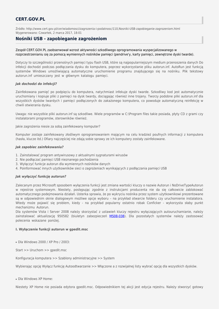 CERT.GOV.PL Źródło: http://www.cert.gov.pl/cer/wiadomosci/zagrozenia-i-podatnosc/110,Nosniki-USB-zapobieganie-zagrozeniom.html Wygenerowano: Czwartek, 2 marca 2017, 18:01 Nośniki USB - zapobieganie zagrożeniom Zespół CERT.GOV.PL zaobserwował wzrost aktywności szkodliwego oprogramowania wyspecjalizowanego w rozprzestrzenianiu się za pomocą wymiennych nośników pamięci (pendrive'y, karty pamięci, zewnętrzne dyski twarde). Dotyczy to szczególności przenośnych pamięci typu flash USB, które są najpopularniejszym medium przenoszenia danych Do infekcji dochodzi podczas podłączania dysku do komputera, poprzez wykorzystanie pliku autorun.inf. AutoRun jest funkcją systemów Windows umożliwiającą automatyczne uruchomienie programu znajdującego się na nośniku. Plik tekstowy autorun.inf umieszczany jest w głównym katalogu pamięci. Jak dochodzi do infekcji? Zainfekowana pamięć po podpięciu do komputera, natychmiast infekuje dyski twarde. Szkodliwy kod jest automatycznie uruchomiany i kopiuje pliki z pamięci na dysk twardy, dociągając również inne trojany. Tworzy podobne pliki autorun.inf dla wszystkich dysków twardych i pamięci podłączonych do zakażonego komputera, co powoduje automatyczną reinfekcję w chwili otwierania dysku. Uwaga: nie wszystkie pliki autorun.inf są szkodliwe. Wiele programów w C:\Program files takie posiada, płyty CD z grami czy instalatorami programów, sterowników również. Jakie zagrożenia niesie za sobą zainfekowany komputer? Komputer zostaje zainfekowany złośliwym oprogramowaniem mającym na celu kradzież poufnych informacji z komputera (hasła, klucze itd.) Ofiary najczęściej nie zdają sobie sprawy ze ich komputery zostały zainfekowane. Jak zapobiec zainfekowaniu? 1. 2. 3. 4. Zainstalować program antywirusowy z aktualnymi sygnaturami wirusów Nie podłączać pamięci USB nieznanego pochodzenia Wyłączyć funkcje autorun dla wymiennych nośników danych Poinformować innych użytkowników sieci o zagrożeniach wynikających z podłączania pamięci USB Jak wyłączyć funkcję autorun? Zalecanym przez Microsoft sposobem wyłączenia funkcji jest zmiana wartości kluczy o nazwie Autorun i NoDriveTypeAutorun w rejestrze systemowym. Niestety, postępując zgodnie z instrukcjami producenta nie da się całkowicie zablokować automatycznego podejmowania działań. Usterka sprawia, że po wykryciu nośnika przez system użytkownikowi prezentowane są w odpowiednim oknie dialogowym możliwe opcje wyboru – na przykład otwarcie folderu czy uruchomienie instalatora. Wtedy może pojawić się problem, kiedy - na przykład popularny ostatnio robak Conficker - wykorzysta słaby punkt mechanizmu Autorun. Dla systemów Vista i Server 2008 należy skorzystać z ustawień kluczy rejestru wyłączających autouruchamianie, należy zainstalować aktualizację 950582 (biuletyn zabezpieczeń MS08-038). Dla pozostałych systemów należy zastosować polecenia wskazane poniżej. I. Wyłączenie funkcji autorun w gpedit.msc ● Dla Windows 2000 / XP Pro / 2003: Start >> Uruchom >> gpedit.msc Konfiguracja komputera >> Szablony administracyjne >> System Wybierając opcję Wyłącz funkcję Autoodtwarzanie >> Włączone a z rozwijalnej listy wybrać opcję dla wszystkich dysków. ● Dla Windows XP Home: Niestety XP Home nie posiada edytora gpedit.msc. Odpowiednikiem tej akcji jest edycja rejestru. Należy stworzyć gotowy plik do zaimportowania, który wyłącza Autoodtwarzanie dla wszystkich dysków. W tym celu należy stworzyć plik w edytorze tekstowym o treści: Windows Registry Editor Version 5.00 [HKEY_CURRENT_USER\Software\Microsoft\Windows\CurrentVersion\Policies\Explorer] “NoDriveTypeAutoRun”=dword:0x000000FF Zapisać plik jako FIX.REG. Uruchomić plik i zrestartować komputer. II. Zmodyfikowanie wartości NoDriveTypeAutoRun Aby wyłączyć wybrane funkcje autouruchamiania, należy zmodyfikować wartość NoDriveTypeAutoRun w następującym podkluczu rejestru: HKEY_LOCAL_MACHINE\Software\Microsoft\Windows\CurrentVersion\Policies\Explorer\ Wartość NoDriveTypeAutoRun należy ustawić na 0xFF co spowoduje wyłączenie autoodtwarzania na wszystkich typach dysków. III. Wyłączenie funkcji autorun.inf w rejestrze Należy stworzyć plik w edytorze tekstowym o treści: REGEDIT4 [HKEY_LOCAL_MACHINE\SOFTWARE\Microsoft\Windows NT\CurrentVersion\IniFileMapping\Autorun.inf] @="@SYS:DoesNotExist" Zapisać plik jako regauto.reg. Uruchomić plik i zrestartować komputer. Wpis w rejestrze powinien wyglądać następująco: Ze względu na buforowanie informacji podłączonych wcześniej dysków, należy wykasować dla każdego użytkownika klucze w rejestrze przy wpisie MountPoints2: HKEY_CURRENT_USER\Software\Microsoft\Windows\CurrentVersion\Explorer\MountPoints2 Zespół CERT.GOV.PL zaleca: ● ● ● Zainstalowanie oprogramowania antywirusowego i aktualizowanie na bieżąco sygnatur wirusów Nie podłączanie dysku USB do komputera niewiadomego pochodzenia Wyłączenie funkcji autoodtwarzania dla nośników wymiennych. Wiecej informacji: http://support.microsoft.com/kb/953252 http://support.microsoft.com/kb/967715 http://www.us-cert.gov/cas/techalerts/TA09-020A.html http://www.cert.org/blogs/vuls/2008/04/the_dangers_of_windows_autorun.html http://www.publicsafety.gc.ca/prg/em/ccirc/2008/tr08-004-eng.aspx http://www.microsoft.com/technet/security/Bulletin/MS08-038.mspx http://www.heise-online.co.uk/security/Microsoft-s-instructions-for-disabling-AutoRun-don-t-work--/news/112469 autorun, Conficker, USB, Windows, trojan, biuletyn RG Ocena: 3.7/5 (9)