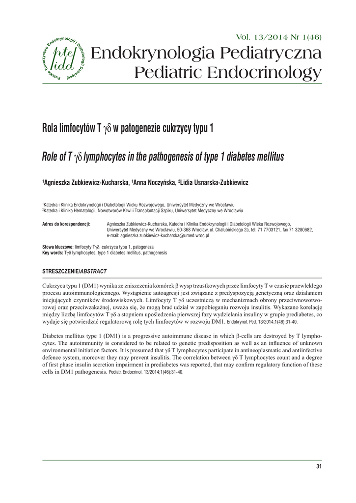 Zubkiewicz-Kucharska A. i inni: Rola limfocytów T γδ w patogenezie cukrzycy typu 1 Vol. 13/2014 Nr 1(46) Endokrynologia Pediatryczna Pediatric Endocrinology Rola limfocytów T γδ w patogenezie cukrzycy typu 1 Role of T γδ lymphocytes in the pathogenesis of type 1 diabetes mellitus Agnieszka Zubkiewicz-Kucharska, 1Anna Noczyńska, 2Lidia Usnarska-Zubkiewicz 1 Katedra i Klinika Endokrynologii i Diabetologii Wieku Rozwojowego, Uniwersytet Medyczny we Wrocławiu Katedra i Klinika Hematologii, Nowotworów Krwi i Transplantacji Szpiku, Uniwersytet Medyczny we Wrocławiu 1 2 Adres do korespondencji: Agnieszka Zubkiewicz-Kucharska, Katedra i Klinika Endokrynologii i Diabetologii Wieku Rozwojowego, Uniwersytet Medyczny we Wrocławiu, 50-368 Wrocław, ul. Chałubińskiego 2a, tel. 71 7703121, fax 71 3280682, e-mail: [email protected] Słowa kluczowe: limfocyty Tγδ, cukrzyca typu 1, patogeneza Key words: Tγδ lymphocytes, type 1 diabetes mellitus, pathogenesis STRESZCZENIE/ABSTRACT Cukrzyca typu 1 (DM1) wynika ze zniszczenia komórek β wysp trzustkowych przez limfocyty T w czasie przewlekłego procesu autoimmunologicznego. Wystąpienie autoagresji jest związane z predyspozycją genetyczną oraz działaniem inicjujących czynników środowiskowych. Limfocyty T γδ uczestniczą w mechanizmach obrony przeciwnowotworowej oraz przeciwzakaźnej, uważa się, że mogą brać udział w zapobieganiu rozwoju insulitis. Wykazano korelację między liczbą limfocytów T γδ a stopniem upośledzenia pierwszej fazy wydzielania insuliny w grupie prediabetes, co wydaje się potwierdzać regulatorową rolę tych limfocytów w rozwoju DM1. Endokrynol. Ped. 13/2014;1(46):31-40. Diabetes mellitus type 1 (DM1) is a progressive autoimmune disease in which β-cells are destroyed by T lymphocytes. The autoimmunity is considered to be related to genetic predisposition as well as an influence of unknown environmental initiation factors. It is presumed that γδ T lymphocytes participate in antineoplasmatic and antiinfective defence system, moreover they may prevent insulitis. The correlation between γδ T lymphocytes count and a degree of first phase insulin secretion impairment in prediabetes was reported, that may confirm regulatory function of these cells in DM1 pathogenesis. Pediatr. Endocrinol. 13/2014;1(46):31-40. 31 Praca przeglądowa Wstęp Mimo że historia badań nad rolą limfocytów Tγδ w cukrzycy typu 1 rozpoczęła się w połowie lat dziewięćdziesiątych ubiegłego wieku, to ich znaczenie w patogenezie chorób autoimmunologicznych, w tym cukrzycy typu 1, pozostaje nadal słabo poznane, a wyniki przedstawianych badań są niejednolite. Populacja limfocytów Tγδ w odpowiedzi immunologicznej może działać zarówno pro-, jak i przeciwzapalnie. Wiąże się to z różnicami w budowie łańcucha gamma i delta receptora TCR, determinującymi funkcję komórki: cytotoksyczną lub regulatorową, ale również powinowactwem omawianych limfocytów do różnych tkanek [1,2]. Opisywane są zaburzenia funkcji limfocytów Tγδ i wielkości ich populacji we krwi obwodowej oraz nacieczenie narządów przez te komórki w rozmaitych chorobach z autoagresji, m.in. w stwardnieniu rozsianym, toczniu układowym, jak również w celiakii [3–7]. Zaburzenie mechanizmów immunologicznych w rozwoju cukrzycy typu 1 Klasyczna teoria odporności zakłada, że układ immunologiczny zabezpiecza organizm przed wszystkimi obcymi antygenami, a podstawę odpowiedzi autoimmunizacyjnej stanowi utracona zdolność układu odpornościowego do odróżnienia antygenów „własnych” od „obcych”. Z kolei według modelu sygnału zagrożenia Polly Matzinger inicjacja swoistej odpowiedzi immunologicznej zależy od rozpoznania nie tylko obcej natury antygenu, ale także warunków, w jakich dany antygen jest prezentowany komórkom immunokompetentnym. Jeśli dane warunki zostaną odebrane przez organizm jako patologiczne, sprzyjać będą powstaniu odpowiedzi immunologicznej bez względu na to, czy antygen jest własny, czy obcy. Komórki prezentujące antygen (APC, antigen presenting cells) muszą więc otrzymać dodatkowy „sygnał zagrożenia”, aby rozpocząć odpowiedź immunologiczną. W sytuacji autoagresji takim sygnałem może być nieswoisty proces zapalny towarzyszący uwalnianiu autoantygenów w wyniku zniszczenia tkanek [8]. Teoria Matzinger wpisuje się w model patogenezy cukrzycy typu 1, stworzony przez Nerupa i wsp. Zakłada on, że po uszkodzeniu wysp trzustkowych przez czynniki inicjujące autoantygeny są prezentowane przez komórki APC limfocytom T pomocniczym 32 Endokrynol. Ped., 13/2014;1(46):31-40 CD4+ (Th, T helper), co prowadzi do ich aktywacji. Aktywne limfocyty Th za pośrednictwem produkowanych przez siebie limfokin indukują apoptozę/ nekrozę komórek beta trzustki, powodując naciek wysp trzustkowych komórkami mononuklearnymi (insulitis) [9]. Według twórców tej teorii w procesie indukowania autoantygenów na powierzchni komórek β biorą udział czynniki wewnętrzne (cytokiny, wolne rodniki) lub zewnętrzne (toksyny, wirusy), jednak proces autoimmunologiczny jest inicjowany w komórkach beta wysp Langerhansa. Podkreśla się rolę defektu mechanizmów regulacyjnych, w tym nieprawidłowej selekcji autoantygenów w grasicy w powstawaniu autoagresji. Jednym z istotnych mechanizmów regulacji odpowiedzi układu immunologicznego są limfocyty T-regulatorowe (Treg). Zróżnicowana fenotypowo populacja limfocytów Treg bierze udział m.in. w odpowiedzi przeciwinfekcyjnej, przeciwnowotworowej i poszczepiennej, wytwarzaniu tolerancji na antygeny pokarmowe, bakterie saprofityczne i transplantacyjne, hamuje limfocyty autoreaktywne. Przypuszcza się, że wystąpienie cukrzycy może mieć związek z redukcją liczby limfocytów Treg oraz osłabieniem ich aktywności supresyjnej i/lub jest wynikiem pojawienia się opornych na regulację patogennych limfocytów T [10]. Według Piccirillo nieprawidłowe 