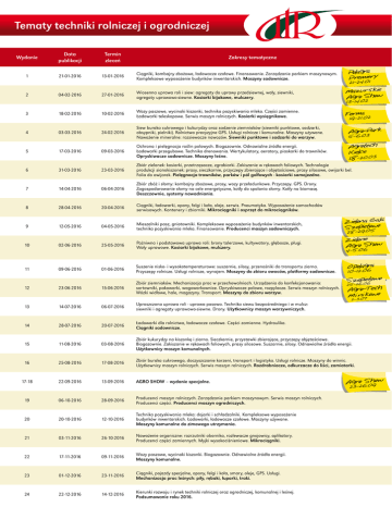 Tematy techniki rolniczej i ogrodniczej Wydanie Data publikacji Termin zleceń 1 21-01-2016 13-01-2016 2 04-02-2016 27-01-2016 Zakresy tematyczne Ciągniki, kombajny zbożowe, ładowacze czołowe. Finansowanie. Zarządzanie parkiem maszynowym. Kompleksowe wyposażenie budynków inwentarskich. Maszyny sadownicze. Polagra Premiery 21-24. 01 Wiosenna uprawa roli i siew: agregaty do uprawy przedsiewnej, wały, siewniki, agregaty uprawowo-siewne. Kosiarki bijakowe, mulczery. Mazurskie Agro Show Ferma 13 -14. 02 3 18-02-2016 10-02-2016 Wozy paszowe, wycinaki kiszonki, technika pozyskiwania mleka. Części zamienne. Ładowarki teleskopowe. Serwis maszyn rolniczych. Kosiarki wysięgnikowe. 4 03-03-2016 24-02-2016 Siew buraka cukrowego i kukurydzy oraz sadzenie ziemniaków (siewniki punktowe, sadzarki, obsypniki, pielniki). Rolnictwo precyzyjne GPS. Usługi rolnicze i komunalne. Maszyny używane. Nawożenie mineralne: rozsiewacze nawozów. Siewniki punktowe i sadzarki do warzyw. Agro-Park 5 17-03-2016 09-03-2016 Ochrona i pielęgnacja roślin polowych. Biogazownie. Odnawialne źródła energii. Ładowarki przegubowe. Technika drenowania. Wertykulatory, aeratory, piaskarki do trawników. Opryskiwacze sadownicze. Maszyny leśne. Agrotech Kielce 18-2 0. 03 6 31-03-2016 23-03-2016 Zbiór zielonek: kosiarki, przetrząsacze, zgrabiarki. Zakiszanie w rękawach foliowych. Technologie produkcji sianokiszonek: prasy, sieczkarnie, przyczepy zbierające i objętościowe, prasy silosowe, owijarki bel. Folia do owijarek. Pielęgnacja trawników, parków i pól golfowych - kosiarki samojezdne. 7 14-04-2016 06-04-2016 Zbiór zbóż i słomy: kombajny zbożowe, prasy, wozy przeładunkowe. Przyczepy. GPS. Drony. Zagospodarowanie słomy na cele energetyczne, kotły do spalania słomy. Kotły na biomasę. Deszczownie, systemy nawadniania. 8 28-04-2016 20-04-2016 Ciągniki, ładowarki, opony, felgi i koła, oleje, serwis. Pneumatyka. Wyposażenie samochodów serwisowych. Kontenery i zbiorniki. Mikrociągniki i osprzęt do mikrociągników. 9 12-05-2016 04-05-2016 Mieszalniki pasz, gniotowniki. Kompleksowe wyposażenie budynków inwentarskich, technika pozyskiwania mleka. Finansowanie. Producenci maszyn sadowniczych. a Zielona Gal o ow et i p e Sz 10 02-06-2016 25-05-2016 Pożniwna i podstawowa uprawa roli: brony talerzowe, kultywatory, głębosze, pługi. Wały uprawowe. Kosiarki bijakowe, mulczery. Zielone Agro Show 11 09-06-2016 01-06-2016 Suszenie nisko- i wysokotemperaturowe: suszarnie, silosy, przenośniki do transportu ziarna. Przyczepy rolnicze. Usługi rolnicze, wynajem. Maszyny do zbioru owoców, platformy sadownicze. 19 -2 1. 02 5-6 . 03 28-2 9. 05 4- 5. 06 Opolagra 10-12. 06 ietowo Szep06 25-26. Agro-Tech Minikowo 12 23-06-2016 15-06-2016 Zbiór ziemniaków. Mechanizacja prac w przechowalniach. Urządzenia do konfekcjonowania: sortowniki, pakowarki, wagoworkownice. Opryskiwacze polowe, rozpylacze. Serwis maszyn rolniczych. Wózki widłowe, hale, magazyny. Transport. Maszyny do zbioru warzyw. 13 14-07-2016 06-07-2016 Uproszczona uprawa roli - uprawa pasowa. Technika siewu bezpośredniego i w mulcz: siewniki i agregaty uprawowo-siewne. Drony. Użytkownicy maszyn warzywniczych. 14 28-07-2016 20-07-2016 Ładowarki dla rolnictwa, ładowacze czołowe. Części zamienne. Hydraulika. Ciągniki sadownicze. 15 11-08-2016 03-08-2016 Zbiór kukurydzy na kiszonkę i ziarno. Sieczkarnie, przystawki zbierające, przyczepy objętościowe. Biogazownie. Zakiszanie w rękawach foliowych, prasy silosowe. Suszarnie, silosy. Odnawialne źródła energii. Użytkownicy maszyn komunalnych. 16 25-08-2016 17-08-2016 Zbiór buraka cukrowego, doczyszczanie korzeni, transport i logistyka. Usługi rolnicze. Maszyny do winnic. Użytkownicy maszyn rolniczych. Serwis maszyn rolniczych. Rozdrabniacze, odkurzacze do liści, zamiatarki. 17-18 22-09-2016 13-09-2016 AGRO SHOW – wydanie specjalne. 19 06-10-2016 28-09-2016 Producenci maszyn rolniczych. Zarządzanie parkiem maszynowym. Serwis maszyn rolniczych. Producenci części. Producenci maszyn ogrodniczych. 20 20-10-2016 12-10-2016 Technika pozyskiwania mleka: dojarki i schładzalniki. Kompleksowe wyposażenie budynków inwentarskich. Ładowarki, ładowacze czołowe. Maszyny używane. Maszyny komunalne do zimowego utrzymania. 21 03-11-2016 26-10-2016 Nawożenie organiczne: rozrzutniki obornika, rozlewacze gnojowicy, aplikatory. Producenci części zamiennych. Myjki wysokociśnieniowe. Mikrociągniki. 22 17-11-2016 09-11-2016 Wozy paszowe, wycinaki kiszonki. Biogazownie. Odnawialne źródła energii. Maszyny komunalne. 23 01-12-2016 23-11-2016 Ciągniki, pojazdy specjalne, opony, felgi i koła, smary, oleje, GPS. Usługi. Mechanizacja prac leśnych: piły, rębaki, łuparki, traki. 24 22-12-2016 14-12-2016 Kierunki rozwoju i rynek techniki rolniczej oraz ogrodniczej, komunalnej i leśnej. Podsumowanie roku 2016. 2- 3. 07 Agro Sh9ow 23 -26 . 0