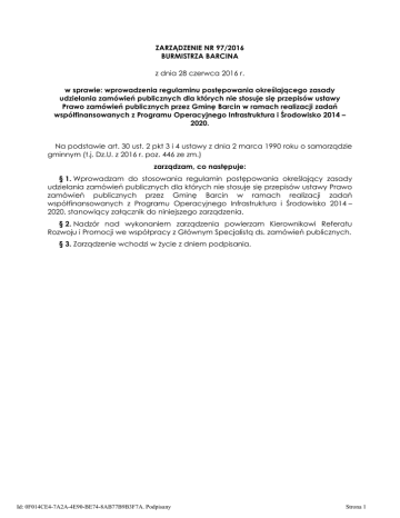 ZARZĄDZENIE NR 97/2016 BURMISTRZA BARCINA z dnia 28 czerwca 2016 r. w sprawie: wprowadzenia regulaminu postępowania określającego zasady udzielania zamówień publicznych dla których nie stosuje się przepisów ustawy Prawo zamówień publicznych przez Gminę Barcin w ramach realizacji zadań współfinansowanych z Programu Operacyjnego Infrastruktura i Środowisko 2014 – 2020. Na podstawie art. 30 ust. 2 pkt 3 i 4 ustawy z dnia 2 marca 1990 roku o samorządzie gminnym (t.j. Dz.U. z 2016 r. poz. 446 ze zm.) zarządzam, co następuje: § 1. Wprowadzam do stosowania regulamin postępowania określający zasady udzielania zamówień publicznych dla których nie stosuje się przepisów ustawy Prawo zamówień publicznych przez Gminę Barcin w ramach realizacji zadań współfinansowanych z Programu Operacyjnego Infrastruktura i Środowisko 2014 – 2020, stanowiący załącznik do niniejszego zarządzenia. § 2. Nadzór nad wykonaniem zarządzenia powierzam Kierownikowi Referatu Rozwoju i Promocji we współpracy z Głównym Specjalistą ds. zamówień publicznych. § 3. Zarządzenie wchodzi w życie z dniem podpisania. Id: 0F014CE4-7A2A-4E90-BE74-8AB77B9B3F7A. Podpisany Strona 1 Załącznik do Zarządzenia Nr 97/2016 Burmistrza Barcina z dnia 28 czerwca 2016 r. Regulamin postępowania określający zasady udzielania zamówień publicznych dla których nie stosuje się przepisów ustawy Prawo zamówień publicznych przez Gminę Barcin w ramach realizacji zadań współfinansowanych z Programu Operacyjnego Infrastruktura i Środowisko 2014 – 2020. § 1. Postanowienia ogólne 1. Regulamin niniejszy określa procedury wyboru wykonawców i zawierania umów przez Gminę Barcin w ramach realizacji zadań współfinansowanych z Programu Operacyjnego Infrastruktura Środowisko 2014-2020, zwanego dalej w regulaminie zamówień POIiŚ 2014 - 2020, dla których zgodnie z treścią art. 4 pkt. 8 ustawy z dnia 29 stycznia 2004 r. Prawo zamówień publicznych (Dz. U. z 2015 r., poz. 2164 z późniejszymi zmianami) nie stosuje się Prawa zamówień publicznych, a których wartość szacunkowa nie przekracza 30.000,00 EURO. 2. Podstawą przeliczenia wartości zamówienia jest średni kursu złotego w stosunku do euro określany przez Prezesa Rady Ministrów w drodze rozporządzenia, o którym mowa w art. 35 ust. 3 ustawy z dnia 29.01.2004 r. Prawo zamówień publicznych. 3. Do ustalania wartości przedmiotu zamówienia zastosowanie mają przepisy art. 32–35 ustawy z dnia 29.01.2004 r. Prawo zamówień publicznych. 4. Regulamin opracowano zgodnie z przepisami ustawy z dnia 29 stycznia 2004 r. Prawo zamówień publicznych (dalej zwaną ustawą PZP) oraz Wytycznymi w zakresie kwalifikowania wydatków w ramach Programu Operacyjnego Infrastruktura i Środowisko 2014-2020 (zwanych dalej Wytycznymi). 5. Każdorazowo stosowaną procedurę wyboru wykonawcy należy zweryfikować w oparciu o aktualną wersję Wytycznych. Wytyczne w aktualnej wersji stanowią informację uzupełniającą do niniejszego regulaminu. § 2. Stosowany tryb wyboru wykonawców 1. Do wyboru wykonawców zadań współfinansowanych z PO IiŚ 2014-2020, które nie spełniają kryterium określone w art. 4 pkt. 8 ustawy Prawo zamówień publicznych, ma zastosowanie tryb uproszczony zgodnie z Wytycznymi. 2. W przypadku umów o wartości netto od 2.000,00 PLN do 50.000,00 PLN ma zastosowanie procedura opisana w § 3 Regulaminu. 3. W przypadku umów o wartości netto od 50.000,00 PLN do równowartości kwoty 30.000,00 EUR ma zastosowanie procedura opisana w § 4 Regulaminu. § 3. Wydatki o szacunkowej wartości zamówienia od 2.000,00 PLN do 50.000,00 PLN netto 1. Zasady dokonywania rozeznania rynku: Id: 0F014CE4-7A2A-4E90-BE74-8AB77B9B3F7A. Podpisany Strona 1 a) Rozeznanie rynku będzie miało miejsce co najmniej poprzez upublicznienie zapytania ofertowego na stronie internetowej Gminy Barcin lub innej powszechnie dostępnej stronie przeznaczonej do umieszczania zapytań ofertowych w celu wybrania najkorzystniejszej oferty i / lub b) Skierowanie zapytania ofertowego do co najmniej 3 potencjalnych wykonawców; dopuszcza się możliwość przesłania zaproszenia także faksem lub emailem, i / lub c) Wydruk co najmniej 3 alternatywnych ofert ze strony internetowej potencjalnych wykonawców. 2. Rozeznanie uznaje się za ważne, w przypadku otrzymania co najmniej dwóch ważnych ofert w wyniku zapytania ofertowego skierowanego do potencjalnych wykonawców i co najmniej jednej ważnej oferty złożonej w odpowiedzi na ogłoszenie na stronie internetowej. 3. Wymagane jest udokumentowanie przeprowadzenia procedury rozeznania rynku dokumentami potwierdzającymi przeprowadzenie procedury rozeznania rynku skierowanymi do potencjalnych wykonawców zapytaniami ofertowymi, wydrukami tj. w szczególności ogłoszeń, złożonych ofert, wydruki ze stron internetowych przedstawiające oferty potencjalnych wykonawców, informacjami handlowymi przesłanymi przez wykonawców z własnej inicjatywy. 4. Dokumenty potwierdzające rozeznanie rynku mogą przyjąć w szczególności formę: pisma, wydruku listu elektronicznego, wydruku strony internetowej (zawierającego datę wydruku). 5. Notatka potwierdzająca przeprowadzenie rozmów potencjalnymi wykonawcami nie będzie uznawana za rozeznania rynku. telefonicznych z udokumentowanie 6. Wymagane warunki, dokumenty, zasady uzupełniania, wyjaśnienia oraz poprawy omyłek zostaną szczegółowo określone w zaproszeniu. 7. Wybór oferty: a) Wyboru złożonych ofert dokonuje komisja wyznaczona przez kierownika odpowiedniego referatu lub Burmistrza, z zachowaniem zasady uczciwej konkurencji i równego traktowania wykonawców, b) Wszystkie oferty otwierane są w miejscu i czasie wskazanym w zapytaniu ofertowym, c) Z czynności otwarcia sporządzany jest protokół, który następnie zatwierdzany jest przez Burmistrza, d) Po wyborze oferty zawiadamia się wykonawców, którzy złożyli oferty, podając nazwę i adres w