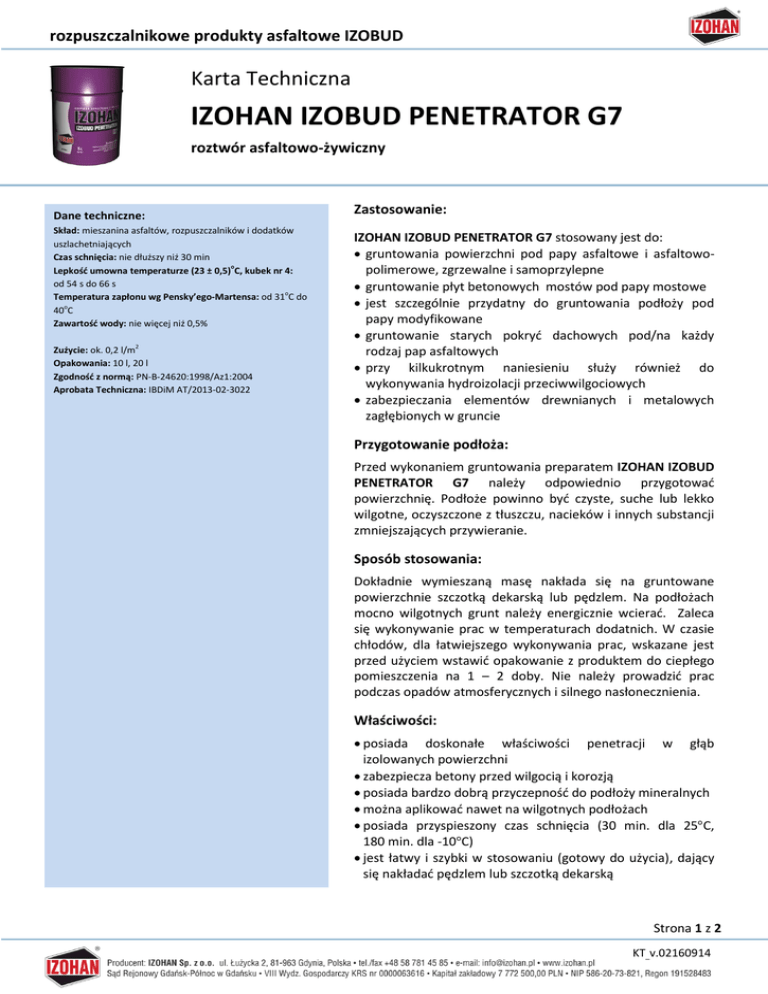 rozpuszczalnikowe produkty asfaltowe IZOBUD Karta Techniczna IZOHAN IZOBUD PENETRATOR G7 roztwór asfaltowo-żywiczny Dane techniczne: Skład: mieszanina asfaltów, rozpuszczalników i dodatków uszlachetniających Czas schnięcia: nie dłuższy niż 30 min Lepkość umowna temperaturze (23 ± 0,5)oC, kubek nr 4: od 54 s do 66 s Temperatura zapłonu wg Pensky’ego-Martensa: od 31oC do 40oC Zawartość wody: nie więcej niż 0,5% Zużycie: ok. 0,2 l/m2 Opakowania: 10 l, 20 l Zgodność z normą: PN-B-24620:1998/Az1:2004 Aprobata Techniczna: IBDiM AT/2013-02-3022 Zastosowanie: IZOHAN IZOBUD PENETRATOR G7 stosowany jest do: gruntowania powierzchni pod papy asfaltowe i asfaltowopolimerowe, zgrzewalne i samoprzylepne gruntowanie płyt betonowych mostów pod papy mostowe jest szczególnie przydatny do gruntowania podłoży pod papy modyfikowane gruntowanie starych pokryć dachowych pod/na każdy rodzaj pap asfaltowych przy kilkukrotnym naniesieniu służy również do wykonywania hydroizolacji przeciwwilgociowych zabezpieczania elementów drewnianych i metalowych zagłębionych w gruncie Przygotowanie podłoża: Przed wykonaniem gruntowania preparatem IZOHAN IZOBUD PENETRATOR G7 należy odpowiednio przygotować powierzchnię. Podłoże powinno być czyste, suche lub lekko wilgotne, oczyszczone z tłuszczu, nacieków i innych substancji zmniejszających przywieranie. Sposób stosowania: Dokładnie wymieszaną masę nakłada się na gruntowane powierzchnie szczotką dekarską lub pędzlem. Na podłożach mocno wilgotnych grunt należy energicznie wcierać. Zaleca się wykonywanie prac w temperaturach dodatnich. W czasie chłodów, dla łatwiejszego wykonywania prac, wskazane jest przed użyciem wstawić opakowanie z produktem do ciepłego pomieszczenia na 1 – 2 doby. Nie należy prowadzić prac podczas opadów atmosferycznych i silnego nasłonecznienia. Właściwości: Sposób stosowania cd posiada doskonałe właściwości penetracji w głąb izolowanych powierzchni zabezpiecza betony przed wilgocią i korozją posiada bardzo dobrą przyczepność do podłoży mineralnych można aplikować nawet na wilgotnych podłożach posiada przyspieszony czas schnięcia (30 min. dla 25°C, 180 min. dla -10°C) jest łatwy i szybki w stosowaniu (gotowy do użycia), dający się nakładać pędzlem lub szczotką dekarską Strona 1 z 2 KT_v.02160914 rozpuszczalnikowe produkty asfaltowe IZOBUD Przechowywanie: Termin przechowywania w oryginalnych, zamkniętych opakowaniach 365 dni od daty produkcji. Uwagi: Nie należy stosować wyrobu wewnątrz pomieszczeń przeznaczonych na stały pobyt ludzi i branży żywnościowej oraz do materiałów smołowych. Wszystkie wymienione parametry odnoszą się do temperatury +23oC i 55% wilgotności względnej powietrza. Wyrób zawiera rozpuszczalniki organiczne. Przy pracy należy nosić odzież, okulary i rękawice ochronne. Wyrób należy stosować w miejscach przewiewnych, z dala od ognia. Wyrób należy chronić przed dostępem dzieci. Narzędzia zabrudzone podczas wykonywania prac izolacyjnych można czyścić rozpuszczalnikami benzynowymi. Udzielamy gwarancji odnośnie jakości naszych materiałów w ramach naszych warunków sprzedaży i dostawy. Dla budowli o specjalnych wymaganiach, których nie obejmuje niniejsza instrukcja, udostępniamy naszym Klientom własną fachową służbę doradczą. Z chwilą wydania przez nas nowej karty technicznej niniejsza instrukcja traci swą ważność. Strona 2 z 2 KT_v.02160914