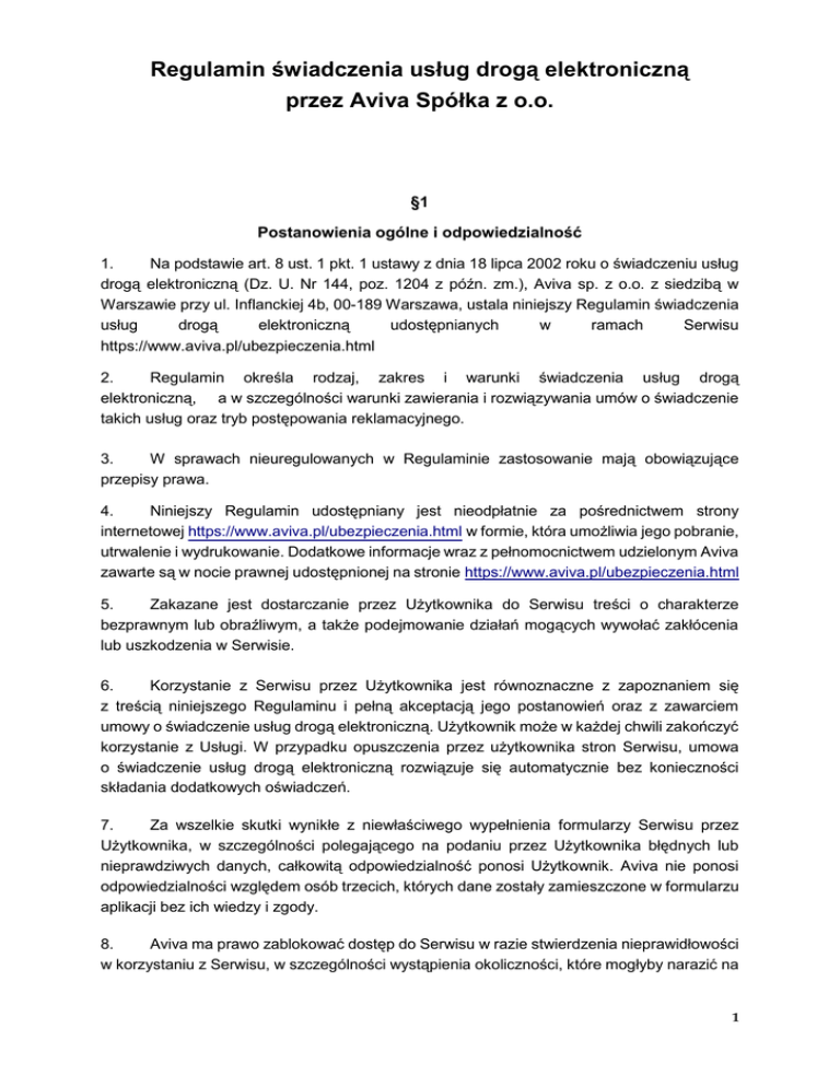 Regulamin świadczenia usług drogą elektroniczną przez Aviva
