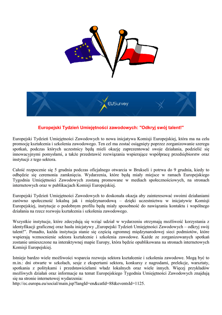 Europejski Tydzień Umiejętności zawodowych: "Odkryj swój talent!" Europejski Tydzień Umiejętności Zawodowych to nowa inicjatywa Komisji Europejskiej, która ma na celu promocję kształcenia i szkolenia zawodowego. Ten cel ma zostać osiągnięty poprzez zorganizowanie szeregu spotkań, podczas których uczestnicy będą mieli okazję zaprezentować swoje działania, podzielić się innowacyjnymi pomysłami, a także przedstawić rozwiązania wspierające współpracę przedsiębiorstw oraz instytucji z tego sektora. Całość rozpocznie się 5 grudnia podczas oficjalnego otwarcia w Brukseli i potrwa do 9 grudnia, kiedy to odbędzie się ceremonia zamknięcia. Wydarzenia, które będą miały miejsce w ramach Europejskiego Tygodnia Umiejętności Zawodowych zostaną promowane w mediach społecznościowych, na stronach internetowych oraz w publikacjach Komisji Europejskiej. Europejski Tydzień Umiejętności Zawodowych to doskonała okazja aby zainteresować swoimi działaniami zarówno społeczność lokalną jak i międzynarodową – dzięki uczestnictwu w inicjatywie Komisji Europejskiej, instytucje o podobnym profilu będą miały sposobność do nawiązania kontaktu i wspólnego działania na rzecz rozwoju kształcenia i szkolenia zawodowego. Wszystkie instytucje, które zdecydują się wziąć udział w wydarzeniu otrzymają możliwość korzystania z identyfikacji graficznej oraz hasła inicjatywy „Europejski Tydzień Umiejętności Zawodowych – odkryj swój talent!”. Ponadto, każda instytucja stanie się częścią ogromnej międzynarodowej sieci podmiotów, które wspierają wzmocnienie sektora kształcenie i szkolenia zawodowe. Każde ze zorganizowanych spotkań zostanie umieszczone na interaktywnej mapie Europy, która będzie opublikowana na stronach internetowych Komisji Europejskiej. Istnieje bardzo wiele możliwości wsparcia rozwoju sektora kształcenie i szkolenia zawodowe. Mogą być to m.in.: dni otwarte w szkołach, sesje z ekspertami sektora, konkursy z nagrodami, prelekcje, warsztaty, spotkania z politykami i przedstawicielami władz lokalnych oraz wiele innych. Więcej przykładów możliwych działań oraz informacje na temat Europejskiego Tygodnia Umiejętności Zawodowych znajdują się na stronie internetowej wydarzenia: http://ec.europa.eu/social/main.jsp?langId=en&catId=88&eventsId=1125. Centrum Kształcenia Zawodowego i Ustawicznego w STRZAŁKOWIE zgłosiło swój udział w inicjatywie Komisji Europejskiej chcąc promować swoje działania z zakresu szkolenia zawodowego i działania z pro orientacji zawodowej. Działania CKZiU będą miały miejsce w dniach od 05 grudnia do 09 grudnia 2016roku pod nazwą: „Od przedszkola do mechanizatora” - orientacja i zainteresowanie zawodowe od najmłodszych lat. Wpisując się w hasło Pedagogiki Montessori: „Pomóż mi zrobić to samodzielnie”, uznajemy prawo dziecka w dążeniu do samodzielnego i nieskrępowanego rozwoju, w warunkach właściwej pomocy nauczyciela. Dzieci, które uzyskały pomoc rozwijają się i chcą się uczyć. Dzięki właściwej pomocy dorosłych każde dziecko może się uczyć i chce się uczyć wszystkiego czego tylko może i tak szybko, jak tylko możliwe. Pierwsze lata życia charakteryzują się ogromną zdolnością do przyswajania informacji a gotowość do zdobywania wiedzy, jest większa niż kiedykolwiek później. Od najmłodszych lat życia dziecka, proces uczenia się postępuje z wielką prędkością i jeśli go docenimy, będzie przebiegał w niewiarygodnie szybkim tempie. Pragniemy nieść pomoc każdemu dziecku w rozwijaniu jego indywidualnych cech osobowościowych i jego zainteresowań w sposób dostosowany do posiadanych możliwości (prawidłowości dojrzewania, uzdolnień, sprawności itp.) w zgodzie z obiektywnymi regułami społecznymi. Każde dziecko posiada swoje przejściowe stany gotowości receptywnej ukierunkowane na odbiór określonego rodzaju bodźców, charakteryzujące się łatwością przyswajania i opanowania konkretnych umiejętności. Gotowość tę należy rozumieć jako etapy rozwojowe maksymalnej chłonności w uczeniu się i nabywaniu konkretnych kompetencji bez zbędnego wysiłku. Motorem ich powstawania jest zainteresowanie dziecka. Ponieważ każde dziecko jest inne, inne są także zainteresowania każdego z nich. Dla zrealizowania swojego celu pracownię szkolenia zawodowego przekształcimy w dużą salę zabaw związanych z techniką rolniczą: sterowanie i symulacja pracy modelami ciągników i maszyn rolniczych, zawody w sterowaniu ciągnikami, wykonywanie rysunków ciągników i maszyn rolniczych, układanie obrazów kostkowych, jazdy nowoczesnymi ciągnikami rolniczymi z opiekunami po poligonie.