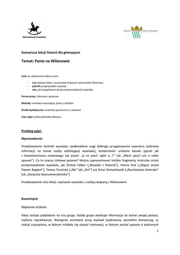 Scenariusz lekcji historii dla gimnazjum Temat: Panie na Wilanowie Cele: po zakończeniu lekcji uczeń: − − − zna ciekawe fakty z życiorysów kolejnych właścicielek Wilanowa, potrafi przeprowadzić wywiad, wie, jak przygotować się do przeprowadzenia wywiadu. Forma pracy: zbiorowa i grupowa Metody: rozmowa nauczająca, praca z tekstem Środki dydaktyczne: materiały pomocnicze z tekstami Czas zajęć: jedna jednostka lekcyjna Przebieg zajęć: Wprowadzenie Przedstawienie techniki wywiadu: podkreślenie wagi dobrego przygotowania reportera (zebranie informacji na temat osoby udzielającej wywiadu), konieczności unikania banału (pytań jak z kwestionariusza osobowego lub pytań: „A co pan/i sądzi o…?” lub „Niech pan/i coś o sobie opowie”). Co to znaczy ciekawe pytanie? Można zaprezentować krótkie fragmenty mistrzów sztuki przeprowadzania wywiadu, jak Oriana Fallaci („Wywiad z historią”), Hanna Kral („Zdążyć przed Panem Bogiem”), Teresa Torańska („My” lub „Oni”) czy Artur Domosławski („Zbuntowana Ameryka” lub „Gorączka latynoamerykańska”). Przedstawienie celu lekcji: napisanie wywiadu z osobą związaną z Wilanowem. Rozwinięcie Napisanie artykułu Klasa zostaje podzielona na trzy grupy. Każda grupa analizuje informacje na temat swojej postaci, wybiera najciekawsze. Następnie uczniowie piszą wywiad (wybrawszy uprzednio konwencję, tj. rodzaj czasopisma, w którym miałaby się ukazać rozmowa), w którym postać opowie o wybranych 1 przez grupę aspektach swojego życia. Na koniec grupy wymieniają się wywiadami, tak aby każda grupa stworzyła jeden wywiad i jeden przeczytała. Grupa I – Maria Kazimiera Sobieska (materiał pomocniczy nr 1) Grupa II – Elżbieta Sieniawska (materiał pomocniczy nr 2) Grupa III – Izabela Lubomirska (materiał pomocniczy nr 3) Zakończenie Uwagi dotyczące przeczytanych wywiadów: czego chcielibyście jeszcze się dowiedzieć o tych postaciach, a czego zabrakło w wywiadach? Czy wiadomości te znajdują się w materiale pomocniczym? Jak Wilanów wpisuje się w życiorysy tych kobiet? Czy odegrał w nich ważną, czy poślednią rolę? Czy był tylko rezydencją, czy celem/środkiem do jakiegoś celu? Materiał pomocniczy nr 1 Maria Kazimiera Sobieska. Portret (Wilanów, nr inw. Wil. 1950), krótka notka faktograficzna, informacje o dworze Ludwika XIV (rola metres królewskich i innych kobiet w polityce), fragmenty listów Jana III Sobieskiego do Marysieńki oraz Marysieńki do Jana III Sobieskiego, ciekawostki z życia królowej. Materiał pomocniczy nr 2 Elżbieta Sieniawska. Portret (Wilanów, nr inw. Wil. 1166), krótka notka biograficzna, mapka z zaznaczonymi terenami należącymi do Sieniawskiej, informacja o ojcu (Herakliusz Lubomirski), ciekawostki z życia Sieniawskiej. Materiał pomocniczy nr 3 Izabela Lubomirska. Portret (Wilanów, nr inw. Wil. 1698 ), krótka notka biograficzna, mapka Wilanowa z zaznaczonymi budynkami dodanymi za czasów Lubomirskiej, (łazienka – znaczenie w tamtych czasach), rozległe interesy (m.in. zakup mebli z czasów rewolucji francuskiej, kontakty z marszandami w Europie, wspomaganie finansowe muzeum Stanisława Kostki Potockiego), familia, ciekawostki. 2 Bibliografia: PSB tom XVII – Izabela Lubomirska PSB tom XXXVII/1 zeszyt 152 – Elżbieta Sieniawska Fijałkowski W., Łazienka wilanowska marszałkowej Izabeli Lubomirskiej, [w]: Muzeum i twórca. Studia z historii sztuki i kultury ku czci prof. dr Stanisława Lorentza, pod red. K. Michałowskiego, Warszawa 1969. Gierowski J.A., Między saski absolutyzmem a złotą wolnością, Wrocław 1853 Komaszyński M., Maria Kazimiera d’Arquien Sobieska królowa Polski 1641–1716, Kraków – Wrocław 1983 Majewska-Maszkowska B., Mecenat artystyczny Izabeli z Czartoryskich Lubomirskiej 1736–1816, Wrocław – Warszawa – Kraków – Gdańsk 1976 Muszyńska-Hoffmanowa H., Panie na Wilanowie , Warszawa 1983 Webgrafia: Maria Kazimiera d’Arquien de la Grange Sobieska: http://wielkisobieski.pl/index.php?option=com_content&task=view&id=166&Itemid=4 Elżbieta Sieniawska: http://swiadectwo1.republika.pl/sieniawska.html http://www.wilanow-palac.art.pl/index.php?enc=226 Izabela Lubomirska: http://czartoryski.fm.interia.pl/izabella2.htm http://buduar-herbaciarnia-rokoko.frix.pl/post/162369/ksiezna-izabela-lubomirska-blekitna-markizardquo 3
