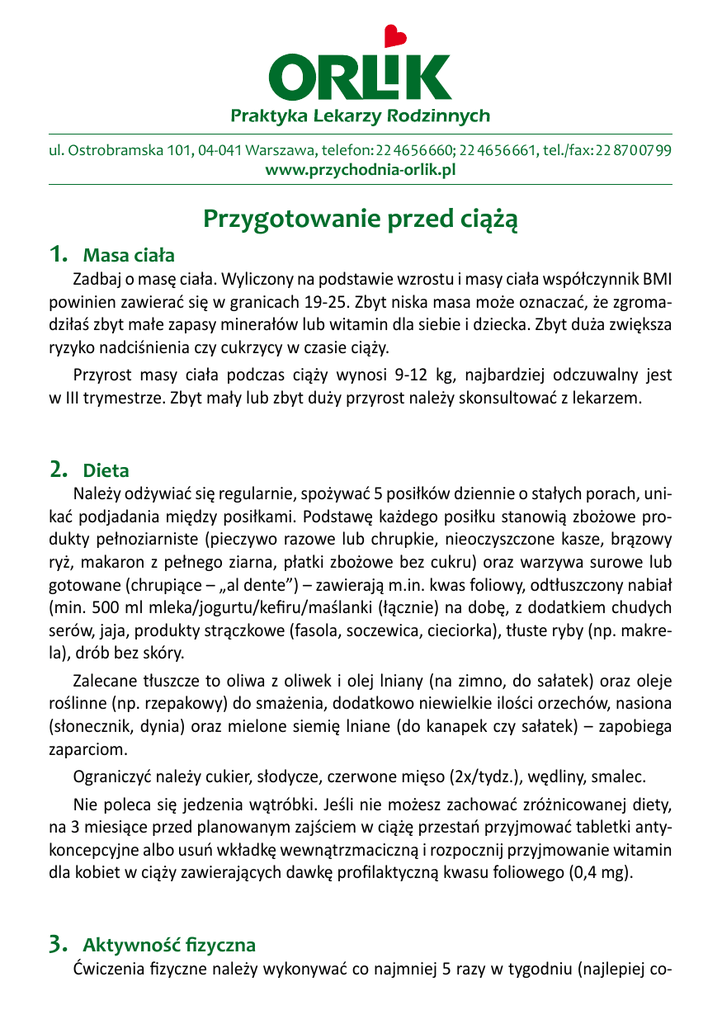 ul. Ostrobramska 101, 04-041 Warszawa, telefon: 22 46 56 660; 22 46 56 661, tel./fax: 22 870 07 99 www.przychodnia-orlik.pl Przygotowanie przed ciążą 1. Masa ciała 2. Dieta 3. Aktywność fizyczna Zadbaj o masę ciała. Wyliczony na podstawie wzrostu i masy ciała współczynnik BMI powinien zawierać się w granicach 19-25. Zbyt niska masa może oznaczać, że zgromadziłaś zbyt małe zapasy minerałów lub witamin dla siebie i dziecka. Zbyt duża zwiększa ryzyko nadciśnienia czy cukrzycy w czasie ciąży. Przyrost masy ciała podczas ciąży wynosi 9-12 kg, najbardziej odczuwalny jest w III trymestrze. Zbyt mały lub zbyt duży przyrost należy skonsultować z lekarzem. Należy odżywiać się regularnie, spożywać 5 posiłków dziennie o stałych porach, unikać podjadania między posiłkami. Podstawę każdego posiłku stanowią zbożowe produkty pełnoziarniste (pieczywo razowe lub chrupkie, nieoczyszczone kasze, brązowy ryż, makaron z pełnego ziarna, płatki zbożowe bez cukru) oraz warzywa surowe lub gotowane (chrupiące – „al dente”) – zawierają m.in. kwas foliowy, odtłuszczony nabiał (min. 500 ml mleka/jogurtu/kefiru/maślanki (łącznie) na dobę, z dodatkiem chudych serów, jaja, produkty strączkowe (fasola, soczewica, cieciorka), tłuste ryby (np. makrela), drób bez skóry. Zalecane tłuszcze to oliwa z oliwek i olej lniany (na zimno, do sałatek) oraz oleje roślinne (np. rzepakowy) do smażenia, dodatkowo niewielkie ilości orzechów, nasiona (słonecznik, dynia) oraz mielone siemię lniane (do kanapek czy sałatek) – zapobiega zaparciom. Ograniczyć należy cukier, słodycze, czerwone mięso (2x/tydz.), wędliny, smalec. Nie poleca się jedzenia wątróbki. Jeśli nie możesz zachować zróżnicowanej diety, na 3 miesiące przed planowanym zajściem w ciążę przestań przyjmować tabletki antykoncepcyjne albo usuń wkładkę wewnątrzmaciczną i rozpocznij przyjmowanie witamin dla kobiet w ciąży zawierających dawkę profilaktyczną kwasu foliowego (0,4 mg). Ćwiczenia fizyczne należy wykonywać co najmniej 5 razy w tygodniu (najlepiej co- dziennie) przez min. 30 min. Wysiłek fizyczny musi zwiększać tętno do ok. 120 uderzeń na minutę lub prowadzić do zmęczenia. Najczęściej zalecane są szybkie spacery (np. marsz z kijkami, tzw. Nordic Walking, jazda na rowerze stacjonarnym, pływanie). Każdy wysiłek należy rozpoczynać rozgrzewką. Jeśli dotąd nie ćwiczyłaś regularnie zacznij od niewielkich wysiłków, powoli (np. co tydzień) zwiększaj ich intensywność. Przed rozpoczęciem ćwiczeń skonsultuj się ze swoim lekarzem. Zapoznaj się z dostępnymi ćwiczeniami dla kobiet w ciąży lub zapisz się na zajęcia fitness pod kontrolą instruktora. 4. Zaprzestań palenia tytoniu i picia alkoholu 5. Zbadaj się 6. Szczepienia Nie ma bezpiecznej dawki alkoholu, którą można spożywać podczas ciąży. Nawet jednorazowe spożycie alkoholu może prowadzić do uszkodzenia nienarodzonego dziecka. Zawarte w dymie papierosowym toksyny działają szkodliwie nie tylko przez okres ciąży i karmienia, lecz przez cały okres dzieciństwa. Jeśli podejrzewasz, że możesz mieć trudność z powstrzymaniem się od ww substancji, skonsultuj się z lekarzem. Wspólnie łatwiej będzie ustalić plan działania. Odwiedź lekarza i upewnij się, że nie chorujesz na nadciśnienie tętnicze czy cukrzycę. Wyjaśnij z lekarzem swoje dotychczasowe niezdiagnozowane dolegliwości, szczególnie jeśli występują zapalenia układu moczowego, bóle kręgosłupa, obrzęki i żylaki podudzi, nadwaga i otyłość. Jeśli przyjmujesz na stałe leki (nawet te bez recepty, ziołowe lub suplementy) powiedz lekarzowi o swoich planach prokreacyjnych. Wykonaj podstawowe badania krwi wg zaleceń lekarza (m.in. morfologia, badanie ogólne moczu, glukoza, stężenie witaminy D3). Wskazane jest też badanie w kierunku przeciwciał przeciw toksoplazmozie i cytomegalii (wirus CMV). Kobiety, które nie mają przeciwciał ochronnych powinny stosować się do specjalnych zaleceń podczas ciąży. Przed zajściem w ciążę warto wykluczyć obecność niektórych zakażeń, m.in. wirusem HIV i wirusami zapalenia wątroby typu B i C; Jest to istotne, gdyż zakażenie może pozostawać bezobjawowe przez wiele lat, więc możesz nie być świadoma choroby. Niektóre z badań nie są refundowane, ale i tak warto wiedzieć wcześniej! Z pomocą książeczki zdrowia (własność rodziców) lub karty szczepień (przechowywana w szkole lub przychodni wykonującej szczepienia) ustal jakie szczepienia zostały wykonane. Jeśli potrzeba zaszczep się przeciwko odrze, śwince, różyczce (przechoro- wanie nie jest przeciwwskazaniem do szczepienia, tym bardziej, że nie można być pewnym, czy przed wielu laty postawiono właściwe rozpoznanie), WZW typu B oraz grypie. Jeśli minęło ponad 10 lat od ostatniego szczepienia przeciw tężcowi, błonicy i krztuścowi należy podać dawkę przypominającą. Warto rozważyć także szczepienie przeciwko ospie wietrznej jeśli nie ma pewności, że wystąpiła w dzieciństwie. Jeśli w czasie ciąży planujesz podróże zagraniczne – zapytaj lekarza, czy wskazane będzie wykonanie dodatkowych szczepień. Na uzupełnienie szczepień zarezerwuj co najmniej 4 miesiące. 7. Unikaj stosowania leków bez konsultacji z lekarzem W trakcie ciąży przyjmowanie nowych leków konsultuj z lekarzem lub farmaceutą. Nawet leki kupowane bez recepty mogą być groźne dla płodu. Leki należy stosować najkrócej, jak to tylko możliwe, w najniższych skutecznych dawkach. Do bezpiecznych leków należą: paracetamol (bóle, przeziębienie), leki działające miejscowo (Tantum Verde – aerozol do gardła; roztwór soli morskiej – aerozol do nosa). W razie potrzeby bezpiecznie można podawać wybrane antybiotyki i niektóre inne leki. Choroba może być bowiem groźniejsza dla matki i dziecka niż leczenie. Jeśli czujesz się chora, nie zwlekaj z wizyt
