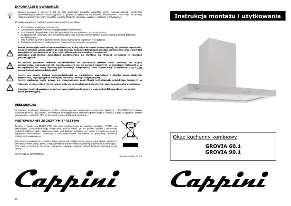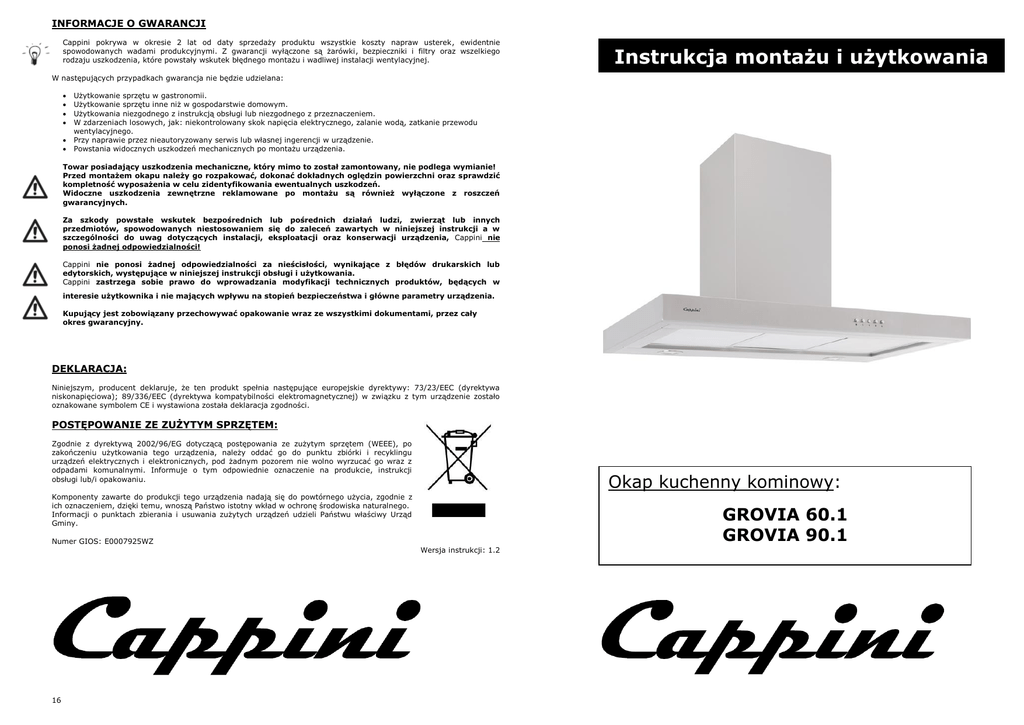 INFORMACJE O GWARANCJI Cappini pokrywa w okresie 2 lat od daty sprzedaży produktu wszystkie koszty napraw usterek, ewidentnie spowodowanych wadami produkcyjnymi. Z gwarancji wyłączone są żarówki, bezpieczniki i filtry oraz wszelkiego rodzaju uszkodzenia, które powstały wskutek błędnego montażu i wadliwej instalacji wentylacyjnej. Instrukcja montażu i użytkowania W następujących przypadkach gwarancja nie będzie udzielana: Użytkowanie sprzętu w gastronomii. Użytkowanie sprzętu inne niż w gospodarstwie domowym. Użytkowania niezgodnego z instrukcją obsługi lub niezgodnego z przeznaczeniem. W zdarzeniach losowych, jak: niekontrolowany skok napięcia elektrycznego, zalanie wodą, zatkanie przewodu wentylacyjnego. Przy naprawie przez nieautoryzowany serwis lub własnej ingerencji w urządzenie. Powstania widocznych uszkodzeń mechanicznych po montażu urządzenia. Towar posiadający uszkodzenia mechaniczne, który mimo to został zamontowany, nie podlega wymianie! Przed montażem okapu należy go rozpakować, dokonać dokładnych oględzin powierzchni oraz sprawdzić kompletność wyposażenia w celu zidentyfikowania ewentualnych uszkodzeń. Widoczne uszkodzenia zewnętrzne reklamowane po montażu są również wyłączone z roszczeń gwarancyjnych. Za szkody powstałe wskutek bezpośrednich lub pośrednich działań ludzi, zwierząt lub innych przedmiotów, spowodowanych niestosowaniem się do zaleceń zawartych w niniejszej instrukcji a w szczególności do uwag dotyczących instalacji, eksploatacji oraz konserwacji urządzenia, Cappini nie ponosi żadnej odpowiedzialności! Cappini nie ponosi żadnej odpowiedzialności za nieścisłości, wynikające z błędów drukarskich lub edytorskich, występujące w niniejszej instrukcji obsługi i użytkowania. Cappini zastrzega sobie prawo do wprowadzania modyfikacji technicznych produktów, będących w interesie użytkownika i nie mających wpływu na stopień bezpieczeństwa i główne parametry urządzenia. Kupujący jest zobowiązany przechowywać opakowanie wraz ze wszystkimi dokumentami, przez cały okres gwarancyjny. DEKLARACJA: Niniejszym, producent deklaruje, że ten produkt spełnia następujące europejskie dyrektywy: 73/23/EEC (dyrektywa niskonapięciowa); 89/336/EEC (dyrektywa kompatybilności elektromagnetycznej) w związku z tym urządzenie zostało oznakowane symbolem CE i wystawiona została deklaracja zgodności. POSTĘPOWANIE ZE ZUŻYTYM SPRZĘTEM: Zgodnie z dyrektywą 2002/96/EG dotyczącą postępowania ze zużytym sprzętem (WEEE), po zakończeniu użytkowania tego urządzenia, należy oddać go do punktu zbiórki i recyklingu urządzeń elektrycznych i elektronicznych, pod żadnym pozorem nie wolno wyrzucać go wraz z odpadami komunalnymi. Informuje o tym odpowiednie oznaczenie na produkcie, instrukcji obsługi lub/i opakowaniu. Okap kuchenny kominowy: Komponenty zawarte do produkcji tego urządzenia nadają się do powtórnego użycia, zgodnie z ich oznaczeniem, dzięki temu, wnoszą Państwo istotny wkład w ochronę środowiska naturalnego. Informacji o punktach zbierania i usuwania zużytych urządzeń udzieli Państwu właściwy Urząd Gminy. GROVIA 60.1 GROVIA 90.1 Numer GIOS: E0007925WZ Wersja instrukcji: 1.2 16 Spis treści Serwis 4 Ilustracja urządzenia Wskazania bezpieczeństwa 5 5 Obsługa okapu Panel obsługi Jaki stopień wydajności należy wybrać? Włączanie i wyłączanie silnika okapu Włączanie i wyłączanie oświetlenia 6 6 6 6 6 Konserwacja i czyszczenie Okresy międzykonserwacyjne Czyszczenie okapu Czyszczenie metalowego filtra tłuszczowego 7 7 7 7 Wymiana filtra z węglem aktywnym 8 Wymiana lampy halogenowej 9 Tryb pracy z wyciągiem lub z wewnętrznym obiegiem powietrza Rysunek wymiarowy urządzenia 10 10 Wskazówki dla poprawnej instalacji okapu Przyłącze elektryczne 11 11 Zestawienie dostarczonych części 12 Montaż okapu Montaż ścienny 13 13 Montaż przewodu odprowadzającego Wykonanie przyłącza sieciowego Montaż maskownicy Uruchomienie 14 14 14 14 Dane techniczne Informacje o gwarancji Deklaracja Postępowanie ze zużytym sprzętem Dane techniczne: Napięcie: 220 – 240 V Częstotliwość: 50 Hz Moc silnika: 240 W Ilość stopni prędkości 3 Oświetlenie: 2 x 20 W Moc maksymalna: 340 W Klasa bezpieczeństwa: I Wydajność: 510 m3/h* Średnica wylotu: Ø 150 mm + redukcja Ø 120 mm ______ __15 16 16 16 *Błędne podłączenie przewodu wentylacyjnego powoduje spadek wydajności urządzenia, każde załamanie rury o 90 stopni powoduje spadek wydajności o około 10%. Każdy dodatkowy metr rury lub płaskiego kanału powoduje spadek wydajności o kolejne 5%. Zredukowanie średnicy przewodu poprzez redukcję pola przekroju poprzecznego - powoduje spadek wydajności urządzenia. Aby zachować fabryczne parametry urządzenia, należy tak planować montaż aby nie zmniejszać pola powierzchni wylotu turbiny okapu. Zamontowanie filtra węglowego w okapie obniża jego wydajność o około 25-30%. Każde stłumienie pracy silnika, spowoduje jego przyśpieszenie oraz zwiększenie głośności pracy! W ekstremalnych przypadkach, przy długotrwałej pracy na najwyższym stopniu prędkości i przy znacznie stłumionym ciągu, może doprowadzić nawet do spalenia silnika elektrycznego okapu. 2 15 Montaż przewodu odprowadzającego (tylko w wyciągowym trybie pracy) Do połączenia z otworem wentylacyjnym w ścianie, należy zastosować rurę z tworzywa sztucznego lub giętki przewód odprowadzający średnicy Ø 150 mm (min. 120 mm) (nie znajduje się w zestawie). Ważne: Przyłącze wyciągowe musi być wykonane przed zamocowaniem okapu! Szanowni Klienci, Gratulujemy Państwu dokonania trafnego wyboru i życzymy wiele satysfakcji w eksploatacji nowego okapu. Nasze urządzenia prezentują nie tylko dojrzałą technikę ale także funkcjonalność, innowacyjne wzornictwo i przemyślane rozwiązania konstrukcyjne. Prosimy o uważne zapoznanie się z niniejszą instrukcją a tak