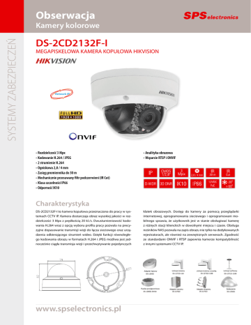 Obserwacja SYSTEMY ZABEZPIECZEŃ Kamery kolorowe DS-2CD2132F-I MEGAPISKELOWA KAMERA KOPUŁOWA HIKVISION Network IP · Rozdzielczość 3 Mpx · Kodowanie H.264 / JPEG · 2 strumienie H.264 · Ogniskowa 2,8 / 4 mm · Zasięg promiennika do 30 m · Mechanicznie przesuwany filtr podczerwieni (IR Cut) · Klasa szczelności IP66 · Odporność IK10 · Analityka obrazowa · Wsparcie RTSP i ONVIF Charakterystyka DS-2CD2132F-I to kamera kopułowa przeznaczona do pracy w systemach CCTV IP. Kamera dostarczaja obraz wysokiej jakości w rozdzielczości 3 Mpx z prędkością 20 kl./s. Dwustumieniowość kodowania H.264 wraz z opcją wyboru profilu pracy pozwala na precyzyjne dopasowanie transmisji wizji do łącza sieciowego oraz urządzenia odbierającego strumień wideo. Dzięki funkcji równoległego kodowania obrazu w formatach H.264 i JPEG możliwa jest jednocześnie ciągła transmisja wizji i przechwytywanie pojedynczych www.spselectronics.pl klatek obrazowych. Dostęp do kamery za pomocą przeglądarki internetowej, oprogramowania sieciowego i oprogramowani mobilnego sprawia, że użytkownik jest w stanie obsługiwać kamerę z różnych stacji klienckich w dowolnymi miejscu i czasie. Obsługa nośników NAS pozwala na zapis obrazu nie tylko na dedykowanych rejestratorach, ale również na zewnętrznych serwerach. Zgodność ze standardami ONVIF i RTSP zapewnia kamerze kompatybilność z innymi systemami CCTV IP. MODEL Typ Rozdzielczość Prędkość Kodowanie Liczba strumieni Minimalne oświetlenie Obiektyw Promiennik podczerwieni Przełączanie dzień/noc Port pamięci Obudowa Klasa szczelności Odporność PRZETWORNIK Typ przetwornika Rozmiar przetwornika Liczba pikseli Skanowanie obrazu DS-2CD2132F-I IP Maks. 3 Mpx Maks. 25 kl./s H.264 (strumień) / JPEG (klatki) 2 0,07 lx / 0 lx (kolor/IR) F1.2, AGC zał. 2,8 / 4 mm (montaż M12) IR, zasięg do 30 m Mechanicznie przesuwany filtr podczerwieni (IR Cut) Micro-SD/SDHC/SDXC (do 64 GB) Kopułowa IP66 IK10 CMOS 1/2,8” 2048x1536 px Progresywne Synchronizacja obrazu Wewnętrzna Elektroniczna migawka Automatyczna/Ręczna (1/3 ~ 1/10.000 s) Szeroka dynamika Protokoły Strumień główny Strumień dodatkowy Typy strumieni Obsługa i konfiguracja Inne właściwości WEJŚCIA / WYJŚCIA Regulacje obrazy Automatyczne wzmacnianie Redukcja szumów Równoważenie bieli Kompensacja odświetlenia Obszary zainteresowań Powiększenie cyfrowe Maski prywatności Detekcja ruchu Analityka obrazowa Znak wodny Tryby dzień/noc Regulacja położenia Kąty wychylenia Inne właściwości POZOSTAŁE Zasilanie Pobór mocy Temperatury pracy Wilgotność pracy Waga Materiał Wymiary D-WDR Ethernet 100 Mb/s, RJ-45 TCP/IP, ICMP, HTTP, HTTPS, FTP, DHCP, DNS, DDNS, RTP, RTSP, RTCP, PPPoE, NTP, UPnP, SMTP, SNMP, IGMP, 802.1X, QoS, IPv6, Bonjour, ONVIF (profile S i G), PSIA, CGI, ISAPI QXGA (2048x1536 px)@20 kl./s, FHD (1920x1080 px)@25 kl./s, HD (1280x720 px)@25 kl./s D1 (704x576 px), CIF (352x288 px) Zmienny (VBR) / stały (CBR) Komputer: przeglądarka internetowa, oprogramowanie klienckie (freeware) Urządzenia mobilne (smartfon, tablet): mobilna aplikacja kliencka (freeware) Multicast, filtracja adresów IP, dostęp anonimowy, powiadamianie email, obsługa NAS (NFS, SMB/CIFS) Jasność, kontrast, nasycenie, odcień AGC 3DDNR Auto. BLC ROI Digital Zoom Tak Tak Detekcja wkroczenia w strefę, detekcja przekroczenia bariery Watermark Auto./Ręczny 3-osiowa Panorama: 0-355°, nachylenie: 0-65°, rotacja: 0-355° Import/eksport ustawień, konfiguracja uprawnień użytkowników, dziennik zdarzeń, detekcja sabotażu, detekcja konfiktu adresów, detekcja awarii nośnika pamięci, przycisk resetu DC 12 V (± 10 %) / PoE (802.3af ) Maks. 7 W -30˚C ~ +60˚C < 95 % 500 g Metal Φ110 x 82 mm Centrala - ul. Krakowiaków 80/98, 02-255 Warszawa; tel. 22 518 31 50, fax 22 518 31 70, e-mail: [email protected] Dział Obsługi Klienta i Zamówień - tel. 22 518 31 60, tel. 22 518 31 53, tel. 22 518 31 49, tel. 22 518 31 43, e-mail: [email protected] Serwis - ul. Krakowiaków 80/98, 02-255 Warszawa; tel. 22 518 31 68, fax 22 518 31 48, e-mail: [email protected] Pomoc Techniczna - tel. 22 518 31 61, tel. 22 518 31 59, tel. 22 518 31 57, tel. 22 518 31 54, e-mail: [email protected] Dystrybutor SIEĆ Interfejsy komunikacyjne