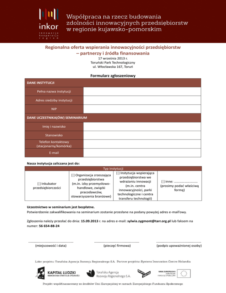 Regionalna oferta wspierania innowacyjności przedsiębiorstw – partnerzy i źródła finansowania 17 września 2013 r. Toruński Park Technologiczny ul. Włocławska 167, Toruń Formularz zgłoszeniowy DANE INSTYTUCJI Pełna nazwa instytucji Adres siedziby instytucji NIP DANE UCZESTNIKA(ÓW) SEMINARIUM Imię i nazwisko Stanowisko Telefon kontaktowy (stacjonarny/komórka) E-mail Nasza instytucja zaliczana jest do: [ ] Inkubator przedsiębiorczości Typ instytucji [ ] Instytucja wspierająca [ ] Organizacja zrzeszająca przedsiębiorstwa we przedsiębiorstwa wdrażaniu innowacji (m.in. izby przemysłowo(m.in. centra handlowe, związki innowacyjności, parki pracodawców, technologiczne i centra stowarzyszenia branżowe) transferu technologii) [ ] inne: ……………………… (prosimy podać właściwą formę) Uczestnictwo w seminarium jest bezpłatne. Potwierdzenie zakwalifikowania na seminarium zostanie przesłane na podany powyżej adres e-mail’owy. Zgłoszenia należy przesłać do dnia: 15.09.2013 r. na adres e-mail: [email protected] lub faksem na numer: 56 654-88-24 ............................................... (miejscowość i data) ............................................... (pieczęć firmowa) ............................................... (podpis upoważnionej osoby)