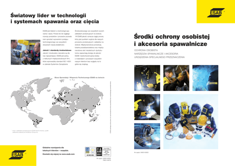 Światowy lider w technologii i systemach spawania oraz cięcia ESAB jest liderem w technologii spa- Środowiskowego we wszystkich swoich wania i cięcia. Ponad sto lat ciągłego zakładach produkcyjnych na świecie. rozwoju produktów i procesów pozwala nam sprostać wyzwaniom postępu Środki ochrony osobistej i akcesoria spawalnicze W ESAB jakość oznacza ciągły proces, który jest punktem wyjścia dla naszych technologicznego we wszystkich procesów produkcyjnych i zakładów na obszarach naszej działalności. świecie. Międzynarodowa produkcja, lokalne przedstawicielstwa oraz między- Jakość i standardy środowiskowe narodowa sieć niezależnych dystrybu- OCHRONA OSOBISTA NARZĘDZIA SPAWALNICZE I AKCESORIA Jakość i środowisko naturalne są dla torów zapewniają dostęp do jakości nas najważniejsze. ESAB jest jedną ESAB i bezkonkurencyjnej wiedzy z nielicznych międzynarodowych firm, o materiałach i procesach wszystkim które wprowadziły standard ISO 14001 naszym klientom bez względu na to w zakresie Systemów Zarządzania gdzie się znajdują. URZĄDZENIA SPECJALNEGO PRZEZNACZENIA * wraz z zakładami produkcyjnymi ESAB North America, spółki całkowicie zależnej od Anderson Group Inc. Globalne rozwiązania dla lokalnych klientów – wszędzie. Dowiedz się więcej na www.esab.com ESAB zastrzega sobie prawo do wprowadzania zmian specyfikacji bez wcześniejszego powiadomienia. Biura Sprzedaży i Wsparcia Technicznego ESAB na świecie Grupa ESAB posiada certyfikat zgodny z ISO 14001 oraz OHSAS 16001 Nr części: XA00142620 FMS/104879 Nr części: XA00142620 Światowy lider w technologii i systemach spawania oraz cięcia ESAB jest liderem w technologii spa- Środowiskowego we wszystkich swoich wania i cięcia. Ponad sto lat ciągłego zakładach produkcyjnych na świecie. rozwoju produktów i procesów pozwala nam sprostać wyzwaniom postępu Środki ochrony osobistej i akcesoria spawalnicze W ESAB jakość oznacza ciągły proces, który jest punktem wyjścia dla naszych technologicznego we wszystkich procesów produkcyjnych i zakładów na obszarach naszej działalności. świecie. Międzynarodowa produkcja, lokalne przedstawicielstwa oraz między- Jakość i standardy środowiskowe narodowa sieć niezależnych dystrybu- OCHRONA OSOBISTA NARZĘDZIA SPAWALNICZE I AKCESORIA Jakość i środowisko naturalne są dla torów zapewniają dostęp do jakości nas najważniejsze. ESAB jest jedną ESAB i bezkonkurencyjnej wiedzy z nielicznych międzynarodowych firm, o materiałach i procesach wszystkim które wprowadziły standard ISO 14001 naszym klientom bez względu na to w zakresie Systemów Zarządzania gdzie się znajdują. URZĄDZENIA SPECJALNEGO PRZEZNACZENIA * wraz z zakładami produkcyjnymi ESAB North America, spółki całkowicie zależnej od Anderson Group Inc. Globalne rozwiązania dla lokalnych klientów – wszędzie. Dowiedz się więcej na www.esab.com ESAB zastrzega sobie prawo do wprowadzania zmian specyfikacji bez wcześniejszego powiadomienia. Biura Sprzedaży i Wsparcia Technicznego ESAB na świecie Grupa ESAB posiada certyfikat zgodny z ISO 14001 oraz OHSAS 16001 Nr części: XA00142620 FMS/104879 Nr części: XA00142620 Światowy lider w technologii i systemach spawania oraz cięcia Od 1904 roku ESAB jest Ponad 100 lat doświadczenia zdobytego w więcej niż 80 krajach zarówno pionierem jak i liderem rozpoznawalną marką w branży spawania i cięcia z portfolio rozwoju technologii spawania Standardowe urządzenia do spawania i cięcia oraz cięcia. Dziś ESAB łączy na całym świecie pozwoliło firmie ESAB stać się najbardziej produktów obejmującym: Urządzenia automatyczne Urządzenia do automatycznego cięcia światową pozycję lidera z Materiały spawalnicze fachową wiedzą w zakresie Akcesoria spawalnicze zastosowań na całym świecie. Środki ochrony osobistej Poprzez ciągłe usprawnianie i udoskonalanie naszych produktów i procesów produkcyjnych potrafimy sprostać wyzwaniom postępu technologicznego na każdym rynku i w każdym obszarze naszej działalności. Dostarczanie produktów i usług wysokiej jakości jest punktem wyjścia wszystkich działań, jakie globalnie podejmujemy w sferze sprzedaży. Światowy lider w technologii i systemach spawania oraz cięcia Od 1904 roku ESAB jest Ponad 100 lat doświadczenia zdobytego w więcej niż 80 krajach zarówno pionierem jak i liderem rozpoznawalną marką w branży spawania i cięcia z portfolio rozwoju technologii spawania Standardowe urządzenia do spawania i cięcia oraz cięcia. Dziś ESAB łączy na całym świecie pozwoliło firmie ESAB stać się najbardziej produktów obejmującym: Urządzenia automatyczne Urządzenia do automatycznego cięcia światową pozycję lidera z Materiały spawalnicze fachową wiedzą w zakresie Akcesoria spawalnicze zastosowań na całym świecie. Środki ochrony osobistej Poprzez ciągłe usprawnianie i udoskonalanie naszych produktów i procesów produkcyjnych potrafimy sprostać wyzwaniom postępu technologicznego na każdym rynku i w każdym obszarze naszej działalności. Dostarczanie produktów i usług wysokiej jakości jest punktem wyjścia wszystkich działań, jakie globalnie podejmujemy w sferze sprzedaży. Spis treści Ochrona osobista Przyłbice, maski i osłony 4-38 Soczewki filtrujące i antyodpryskowe 39 Hełmy ochronne i ochrona słuchu 40 Sprzęt do ochrony układu oddechowego 41-49 Okulary ochronne, gogle ochronne i osłony 50-53 Kurtyny spawalnicze 54-55 Koce spawalnicze 56-57 Odzież spawalnicza i kombinezony 58-60 Ochrona głowy 61 Rękawice spawalnicze 62-65 Obuwie ochronne 66-68 Narzędzia spawalnicze i akcesoria Ochrona osobista Przewody, złącza i uchwyty do elektrod 70-73 Zaciski masowe 73-75 Środki antyodpryskowe 76-77 Firma ESAB oferuje szeroki asortyment środków Środki chemiczne i wskaźniki 77-78 ochrony osobistej, w tym pełny wybór odzieży Młotki spawalnicze 79-80 ochronnej zarówno do spawania i cięcia, 
