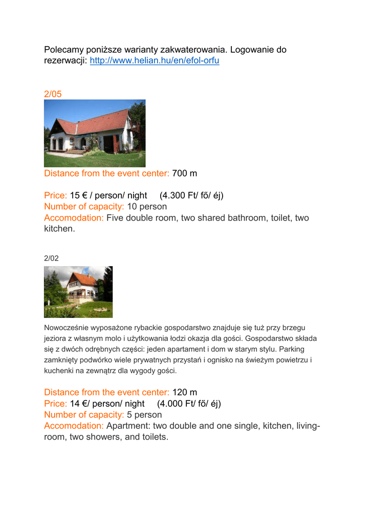 Polecamy poniższe warianty zakwaterowania. Logowanie do rezerwacji: http://www.helian.hu/en/efol-orfu 2/05 Distance from the event center: 700 m Price: 15 € / person/ night (4.300 Ft/ fő/ éj) Number of capacity: 10 person Accomodation: Five double room, two shared bathroom, toilet, two kitchen. 2/02 Nowocześnie wyposażone rybackie gospodarstwo znajduje się tuż przy brzegu jeziora z własnym molo i użytkowania łodzi okazja dla gości. Gospodarstwo składa się z dwóch odrębnych części: jeden apartament i dom w starym stylu. Parking zamknięty podwórko wiele prywatnych przystań i ognisko na świeżym powietrzu i kuchenki na zewnątrz dla wygody gości. Distance from the event center: 120 m Price: 14 €/ person/ night (4.000 Ft/ fő/ éj) Number of capacity: 5 person Accomodation: Apartment: two double and one single, kitchen, livingroom, two showers, and toilets. 2/13 Dwu i cztero-osobowe pokoje z prysznicem, bezprzewodowy dostęp do Internetu oraz telewizor. Zapewnia wygodne i czyste pokoje. W pensjonacie dobrze wyposażona kuchnia jest dostępna dla gości. Na placu zabaw na dziedzińcu dzieci, w snookerze budynku, tenis stołowy, piłkarzyki dostarczają rozrywki. Distance from the event center: 350 m Price: 15-18 € / person/ night (4.300 Ft - 5.200 Ft/ fő/ éj) Number of capacity: 16 person Accomodation: 2 four bedded room (15 €/ person/ night) (4.300 Ft/ fő/ éj) 4 double room (18 €/ person/ night) (5.200 Ft/ fő/ éj) Each with shower and toilet. 2/14 Pensjonat znajduje się blisko centrum osady z ładnym widokiem na okolicę w pobliżu jeziora. Te dwa trzy i cztery osobowe apartamenty z łazienką i małe kuchnie idealne dla rodzin i przyjaciół. Distance from the event center: 500 m Price: 19 € / person/ night (5.400 Ft/ fő/ éj) Number of capacity: 18 person Accomodation: Studio I. 2 double with shower and toilet; Studio II. 1 four-bedded, 2 three-bedded, shower and toilet; Studio III. 2 double with shower and toilet. 2/16 He stylowo urządzony pensjonat posiada 3 apartamenty, każdy z dobrze wyposażonym aneksem kuchennym, łazienka i pokój dzienny. Parking w zamkniętym podwórzu. Distance from the event center: 350 m Price: 14 € / person/ night (4.500 Ft/ fő/ éj) Number of capacity: 12 person Accommodation: 3 four-people apartment Each with kitchenette, bathroom, and living room and toilet. Zip to znaczy kod pocztowy. Jeżeli jedziemy autobusem to noclegi rezerwujemy od 10 do 15 sierpnia.
