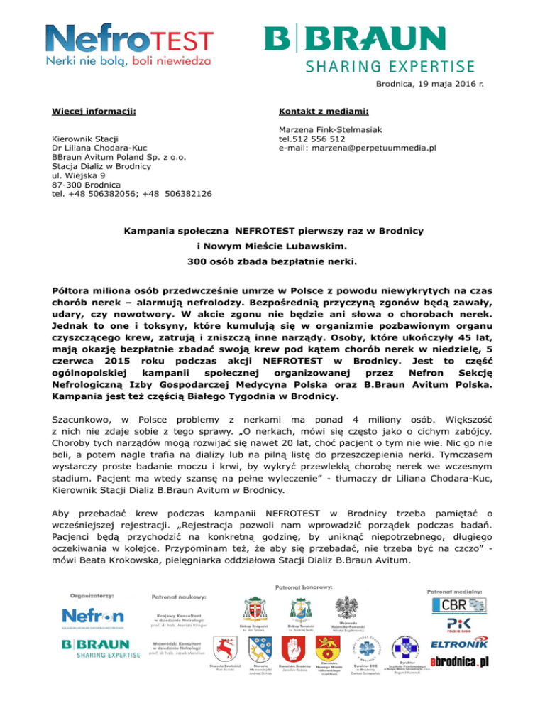 Brodnica, 19 maja 2016 r. Więcej informacji: Kontakt z mediami: Kierownik Stacji Dr Liliana Chodara-Kuc BBraun Avitum Poland Sp. z o.o. Stacja Dializ w Brodnicy ul. Wiejska 9 87-300 Brodnica tel. +48 506382056; +48 506382126 Marzena Fink-Stelmasiak tel.512 556 512 e-mail: [email protected] Kampania społeczna NEFROTEST pierwszy raz w Brodnicy i Nowym Mieście Lubawskim. 300 osób zbada bezpłatnie nerki. Półtora miliona osób przedwcześnie umrze w Polsce z powodu niewykrytych na czas chorób nerek – alarmują nefrolodzy. Bezpośrednią przyczyną zgonów będą zawały, udary, czy nowotwory. W akcie zgonu nie będzie ani słowa o chorobach nerek. Jednak to one i toksyny, które kumulują się w organizmie pozbawionym organu czyszczącego krew, zatrują i zniszczą inne narządy. Osoby, które ukończyły 45 lat, mają okazję bezpłatnie zbadać swoją krew pod kątem chorób nerek w niedzielę, 5 czerwca 2015 roku podczas akcji NEFROTEST w Brodnicy. Jest to część ogólnopolskiej kampanii społecznej organizowanej przez Nefron Sekcję Nefrologiczną Izby Gospodarczej Medycyna Polska oraz B.Braun Avitum Polska. Kampania jest też częścią Białego Tygodnia w Brodnicy. Szacunkowo, w Polsce problemy z nerkami ma ponad 4 miliony osób. Większość z nich nie zdaje sobie z tego sprawy. „O nerkach, mówi się często jako o cichym zabójcy. Choroby tych narządów mogą rozwijać się nawet 20 lat, choć pacjent o tym nie wie. Nic go nie boli, a potem nagle trafia na dializy lub na pilną listę do przeszczepienia nerki. Tymczasem wystarczy proste badanie moczu i krwi, by wykryć przewlekłą chorobę nerek we wczesnym stadium. Pacjent ma wtedy szansę na pełne wyleczenie” - tłumaczy dr Liliana Chodara-Kuc, Kierownik Stacji Dializ B.Braun Avitum w Brodnicy. Aby przebadać krew podczas kampanii NEFROTEST w Brodnicy trzeba pamiętać o wcześniejszej rejestracji. „Rejestracja pozwoli nam wprowadzić porządek podczas badań. Pacjenci będą przychodzić na konkretną godzinę, by uniknąć niepotrzebnego, długiego oczekiwania w kolejce. Przypominam też, że aby się przebadać, nie trzeba być na czczo” mówi Beata Krokowska, pielęgniarka oddziałowa Stacji Dializ B.Braun Avitum. Trzeba także pamiętać, że na badania mogą zapisać się tylko osoby od 45. roku życia. Wymagany będzie numer PESEL. Rejestracja zostanie przeprowadzona 30 i 31 maja br. pod dwoma numerami telefonów: 516 05 07 05, 516 07 05 07., w godz. 10:00 – 15:00. W grupie największego ryzyka zachorowania na niewydolność nerek są osoby chore na cukrzycę, nadciśnienie, schorzenia układu krążenia (pacjenci po przebytych zawałach, udarach, z miażdżycą) oraz po 60. roku życia. Profilaktyczne badania zalecane są też tym, którzy mają w rodzinie osoby chore na nerki. Właściwie każdy dorosły powinien poddać się raz na rok kontrolnym badaniom nerek. Brodnica to już 60. miasto na mapie Polski, gdzie odbywa się kampania NEFROTEST. Od początku akcji w 2010 roku, przebadaliśmy ponad 44 tysiące osób. Prawie zawsze jest dużo więcej chętnych niż dostępnych na badania miejsc. Wszyscy przebadani, których wyniki nie mieściły się w normach zostali skierowani na dalszą diagnostykę. Wsparcia dla akcji na terenie całego kraju udzielił prof. dr hab. n. med. Marian Klinger – Krajowy Konsultant w dziedzinie Nefrologii. Natomiast na szczeblu lokalnym, badania swoim patronatem wspierają: ks. Jan Tyrawa – Biskup Bydgoski, ks. Andrzej Suski – Biskup Toruński, Mikołaj Bogdanowicz – Wojewoda Kujawsko-Pomorski, Piotr Boiński – Starosta Brodnicki, Andrzej Ochlak – Starosta Nowomiejski, Jarosław Radacz – Burmistrz Brodnicy, Józef Blank – Burmistrz Nowego Miasta Lubawskiego, Dariusz Szczepański – dyrektor Zespołu Opieki Zdrowotnej w Brodnicy, Bogumił Kurowski – dyrektor Szpitala Powiatowego w Nowym Mieście Lubawskim oraz prof. dr hab. Jacek Manitius z Kliniki Nefrologii, Nadciśnienia Tętniczego I Chorób Wewnętrznych ze Szpitala Uniwersyteckiego nr 1 im. A. Jurasza w Bydgoszczy – Wojewódzki Konsultant w dziedzinie Nefrologii.