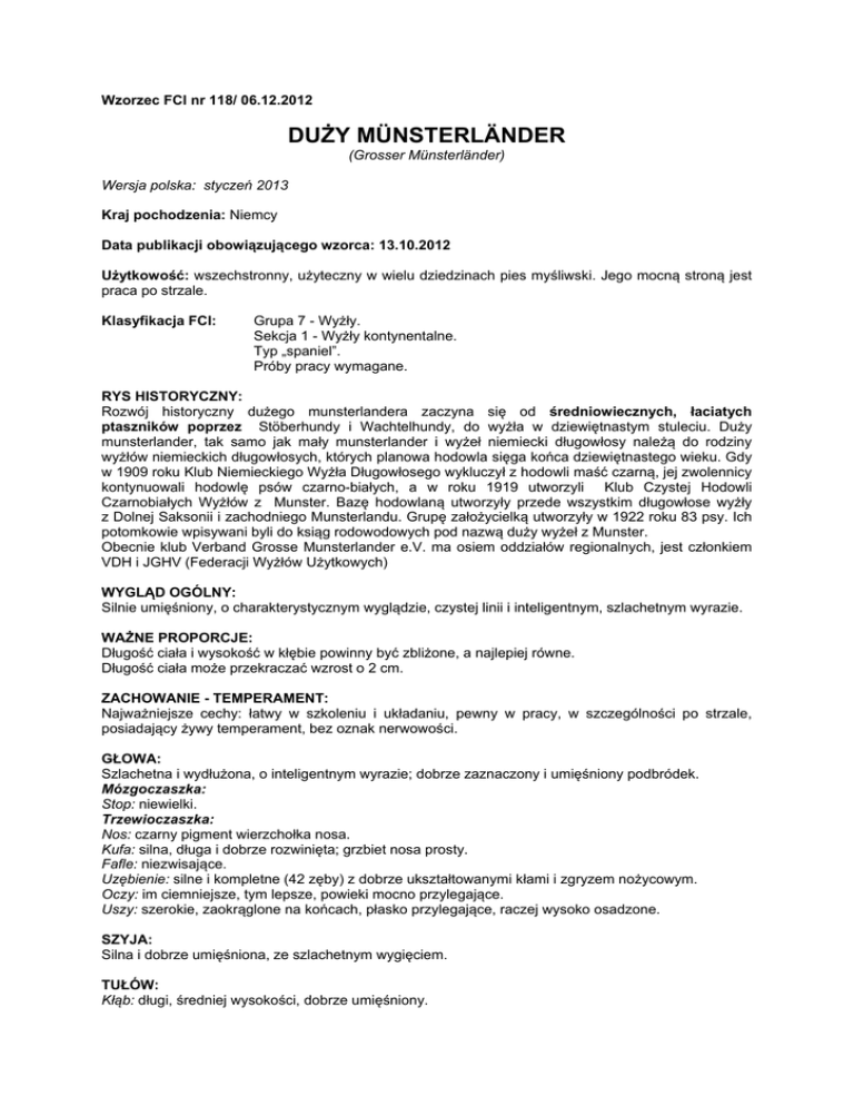 Wzorzec FCI nr 118/ 06.12.2012 DUŻY MÜNSTERLÄNDER (Grosser Münsterländer) Wersja polska: styczeń 2013 Kraj pochodzenia: Niemcy Data publikacji obowiązującego wzorca: 13.10.2012 Użytkowość: wszechstronny, użyteczny w wielu dziedzinach pies myśliwski. Jego mocną stroną jest praca po strzale. Klasyfikacja FCI: Grupa 7 - Wyżły. Sekcja 1 - Wyżły kontynentalne. Typ „spaniel”. Próby pracy wymagane. RYS HISTORYCZNY: Rozwój historyczny dużego munsterlandera zaczyna się od średniowiecznych, łaciatych ptaszników poprzez Stöberhundy i Wachtelhundy, do wyżła w dziewiętnastym stuleciu. Duży munsterlander, tak samo jak mały munsterlander i wyżeł niemiecki długowłosy należą do rodziny wyżłów niemieckich długowłosych, których planowa hodowla sięga końca dziewiętnastego wieku. Gdy w 1909 roku Klub Niemieckiego Wyżła Długowłosego wykluczył z hodowli maść czarną, jej zwolennicy kontynuowali hodowlę psów czarno-białych, a w roku 1919 utworzyli Klub Czystej Hodowli Czarnobiałych Wyżłów z Munster. Bazę hodowlaną utworzyły przede wszystkim długowłose wyżły z Dolnej Saksonii i zachodniego Munsterlandu. Grupę założycielką utworzyły w 1922 roku 83 psy. Ich potomkowie wpisywani byli do ksiąg rodowodowych pod nazwą duży wyżeł z Munster. Obecnie klub Verband Grosse Munsterlander e.V. ma osiem oddziałów regionalnych, jest członkiem VDH i JGHV (Federacji Wyżłów Użytkowych) WYGLĄD OGÓLNY: Silnie umięśniony, o charakterystycznym wyglądzie, czystej linii i inteligentnym, szlachetnym wyrazie. WAŻNE PROPORCJE: Długość ciała i wysokość w kłębie powinny być zbliżone, a najlepiej równe. Długość ciała może przekraczać wzrost o 2 cm. ZACHOWANIE - TEMPERAMENT: Najważniejsze cechy: łatwy w szkoleniu i układaniu, pewny w pracy, w szczególności po strzale, posiadający żywy temperament, bez oznak nerwowości. GŁOWA: Szlachetna i wydłużona, o inteligentnym wyrazie; dobrze zaznaczony i umięśniony podbródek. Mózgoczaszka: Stop: niewielki. Trzewioczaszka: Nos: czarny pigment wierzchołka nosa. Kufa: silna, długa i dobrze rozwinięta; grzbiet nosa prosty. Fafle: niezwisające. Uzębienie: silne i kompletne (42 zęby) z dobrze ukształtowanymi kłami i zgryzem nożycowym. Oczy: im ciemniejsze, tym lepsze, powieki mocno przylegające. Uszy: szerokie, zaokrąglone na końcach, płasko przylegające, raczej wysoko osadzone. SZYJA: Silna i dobrze umięśniona, ze szlachetnym wygięciem. TUŁÓW: Kłąb: długi, średniej wysokości, dobrze umięśniony. Grzbiet: krótki, mocny, prosty. Lędźwie: wyraźne, mocno umięśnione. Zad: długi, szeroki, nieznacznie ścięty, dobrze umięśniony. Klatka piersiowa: widziana z boku jest szeroka, głęboka, o zaznaczonym przedpiersiu. Linia dolna i brzuch: brzuch szczupły, napięty i lekko podkasany; słabizny krótkie. OGON: Noszony poziomo lub nieznacznie powyżej grzbietu, kontynuuje górną linię bez widocznej przerwy. KOŃCZYNY: Kończyny przednie: proste, silne i dobrze umięśnione, poprawnie kątowane. Łopatki: łopatki przylegające do żeber. Nadgarstki: elastyczne. Łapy: lekko zaokrąglone, umiarkowanej długości; ścisłe palce, komplet palców. Kończyny tylne: o silnych, napiętych mięśniach; ustawione pionowo, poprawne kątowanie w stawie kolanowym i skokowym. Łapy: jak w kończynach przednich; wilcze pazury są usuwane. CHODY: Sprężysty stęp i kryjący ziemię kłus z długim krokiem. Galop: harmonijny, ożywiony, z dobrym prowadzeniem i dużym zasięgiem. SZATA: Skóra: napięta. Włos: długi; gęsty, jednak gładki, niefalujący i niesterczący w sposób utrudniający myśliwskie zdolności. Szata musi być szczególnie długa i zwarta na zewnętrznej części przednich i tylnych nóg (dobrze pokryte włosem zwanym frędzlami).Także na ogonie sierść musi być szczególnie długa. Najwięcej frędzli rośnie w środkowej części ogona. Włos na płatach uszu powinien być długi i sięgający równo poza końcówkę płata (bezwłose końcówki uszu niepożądane). Włos na głowie jest krótki i gładki. Umaszczenie: Białe w czarne łaty lub niebieskie przesiane. Głowa czarna, dopuszczalna biała strzałka. WZROST: Wysokość w kłębie: psy: 60 - 65 cm suki: 58 - 63 cm Waga: ok. 30 kg WADY: Wszelkie odchylenia od podanego wzorca powinny być uznane za wady i oceniane w zależności od stopnia nasilenia i wpływu na zdrowie i dobrostan psa, zdolność do wykonywania pracy, do której był przeznaczony. - Czaszka: zbyt szeroka, zbyt duży przełom czołowo-nosowy (stop). - Kufa: rzymski nos, wklęsły profil, całkowity lub zauważalny brak pigmentacji. - Fafle: luźne lub zwisające. - Uzębienie: zgryz cęgowy, podwójne P1, brak 2 zębów przedtrzonowych (P1) lub 2 zębów trzonowych (M3). - Oczy: zbyt jasne, widoczne czerwone spojówki. - Uszy: nisko osadzone, odstające daleko od głowy. - Szyja: zbyt krótka, długa, gruba lub chuda; podgardle. - Kłąb: zbyt niski lub krótki. - Grzbiet: zbyt długi, zapadnięty lub wysklepiony. - Lędźwie: słabo umięśnione; przebudowane, nie dość płynnie przechodzące w zad. - Zad: krótki, wąski, mocno ścięty. - Klatka piersiowa: beczkowata, wąska, nie dość głęboka; brak przedpiersia. - Brzuch: zbyt podkasany, zbyt obwisły. - Ogon: noszony na bok, zawinięty ku górze, zagięty lub pierścieniowaty. - Kończyny przednie: strome kątowanie, odstające lub wciśnięte łokcie; słabe nadgarstki, ustawione zbyt wąsko lub szeroko. - Kończyny tylne: zbyt strome kątowanie, postawa krowia lub beczkowata, zbyt szeroko lub zbyt wąsko ustawione. - Łapy: zajęcze, kocie, płaskie, ustawione do wewnątrz lub na zwenatrz. - Chody: stęp i kłus - krótki, urywany, nienaturalny, drobny. Galop: krótki, urywany skok, zbyt mało energiczny. Wady dyskwalifikujące: - Agresja lub wyraźna lękliwość - Nos: brak pigmentacji. - Entropium, ektropium. - przodozgryz, tyło zgryz, zgryz przemienny. - B