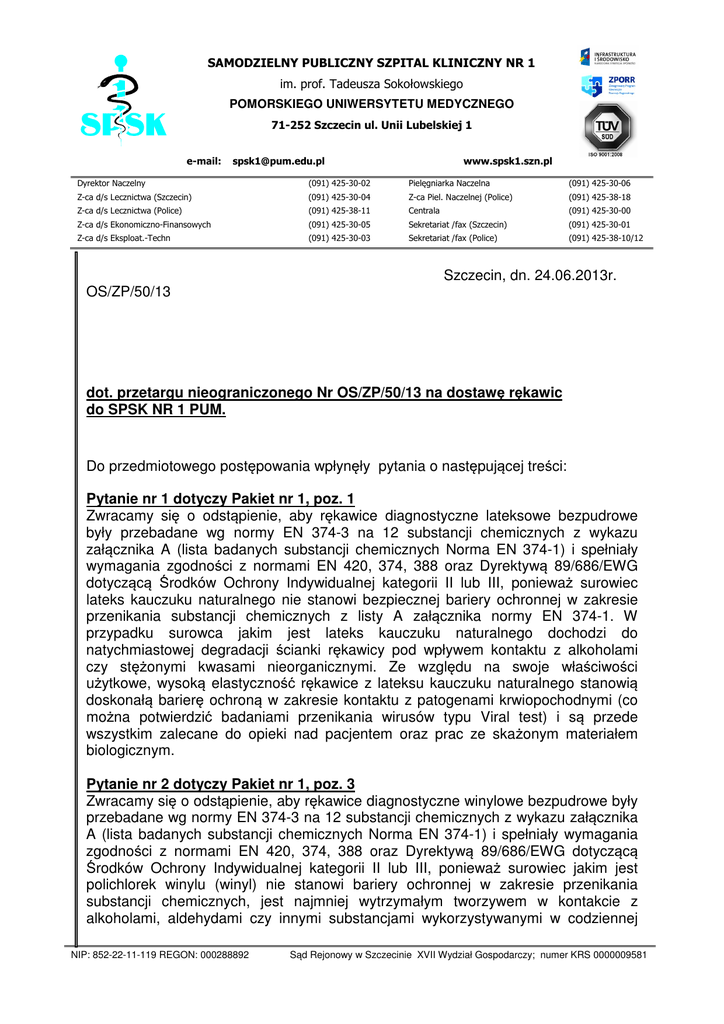 SAMODZIELNY PUBLICZNY SZPITAL KLINICZNY NR 1 im. prof. Tadeusza Sokołowskiego POMORSKIEGO UNIWERSYTETU MEDYCZNEGO 71-252 Szczecin ul. Unii Lubelskiej 1 e-mail: [email protected] www.spsk1.szn.pl Dyrektor Naczelny (091) 425-30-02 Pielęgniarka Naczelna (091) 425-30-06 Z-ca d/s Lecznictwa (Szczecin) (091) 425-30-04 Z-ca Piel. Naczelnej (Police) (091) 425-38-18 Z-ca d/s Lecznictwa (Police) (091) 425-38-11 Centrala (091) 425-30-00 Z-ca d/s Ekonomiczno-Finansowych (091) 425-30-05 Sekretariat /fax (Szczecin) (091) 425-30-01 Z-ca d/s Eksploat.-Techn (091) 425-30-03 Sekretariat /fax (Police) (091) 425-38-10/12 Szczecin, dn. 24.06.2013r. OS/ZP/50/13 dot. przetargu nieograniczonego Nr OS/ZP/50/13 na dostawę rękawic do SPSK NR 1 PUM. Do przedmiotowego postępowania wpłynęły pytania o następującej treści: Pytanie nr 1 dotyczy Pakiet nr 1, poz. 1 Zwracamy się o odstąpienie, aby rękawice diagnostyczne lateksowe bezpudrowe były przebadane wg normy EN 374-3 na 12 substancji chemicznych z wykazu załącznika A (lista badanych substancji chemicznych Norma EN 374-1) i spełniały wymagania zgodności z normami EN 420, 374, 388 oraz Dyrektywą 89/686/EWG dotyczącą Środków Ochrony Indywidualnej kategorii II lub III, ponieważ surowiec lateks kauczuku naturalnego nie stanowi bezpiecznej bariery ochronnej w zakresie przenikania substancji chemicznych z listy A załącznika normy EN 374-1. W przypadku surowca jakim jest lateks kauczuku naturalnego dochodzi do natychmiastowej degradacji ścianki rękawicy pod wpływem kontaktu z alkoholami czy stężonymi kwasami nieorganicznymi. Ze względu na swoje właściwości użytkowe, wysoką elastyczność rękawice z lateksu kauczuku naturalnego stanowią doskonałą barierę ochroną w zakresie kontaktu z patogenami krwiopochodnymi (co można potwierdzić badaniami przenikania wirusów typu Viral test) i są przede wszystkim zalecane do opieki nad pacjentem oraz prac ze skażonym materiałem biologicznym. Pytanie nr 2 dotyczy Pakiet nr 1, poz. 3 Zwracamy się o odstąpienie, aby rękawice diagnostyczne winylowe bezpudrowe były przebadane wg normy EN 374-3 na 12 substancji chemicznych z wykazu załącznika A (lista badanych substancji chemicznych Norma EN 374-1) i spełniały wymagania zgodności z normami EN 420, 374, 388 oraz Dyrektywą 89/686/EWG dotyczącą Środków Ochrony Indywidualnej kategorii II lub III, ponieważ surowiec jakim jest polichlorek winylu (winyl) nie stanowi bariery ochronnej w zakresie przenikania substancji chemicznych, jest najmniej wytrzymałym tworzywem w kontakcie z alkoholami, aldehydami czy innymi substancjami wykorzystywanymi w codziennej NIP: 852-22-11-119 REGON: 000288892 Sąd Rejonowy w Szczecinie XVII Wydział Gospodarczy; numer KRS 0000009581 pracy w szpitalu. Ze względu na swoje właściwości użytkowe także nie zabezpiecza skóry dłoni przed zagrożeniami mechanicznymi. Rękawice winylowe są zalecane do krótkich, nieinwazyjnych procedur diagnostycznych niskiego ryzyka zakażeń. Pytanie nr 3 dotyczy Pakiet nr 1, poz. 3 Zwracamy się o prośbą o dopuszczenie rękawic w kolorze transparentnym (przezroczystym) standardowym dla surowca jakim jest polichlorek winylu i tego typu rękawice? Pytanie nr 4 dotyczy Pakiet nr 2 Zwracamy się o odstąpienie, aby pozycje od 1-5 pakietu nr 2 spełniały wymagania zgodności z normami EN 420, 374, 388 oraz Dyrektywą 89/686/EWG dotyczącą Środków Ochrony Indywidualnej, ponieważ rękawice chirurgiczne są wyłącznie wyrobem medycznym, dedykowanym do inwazyjnych procedur medycznych. Dla w/w produktów nadrzędną i obowiązującą jest Dyrektywa o Wyrobie Medycznym 93/42/EWG oraz zharmonizowana norma medyczna EN 455. Pytanie nr 5 Pakiet I Pozycja I Zwracamy się z prośbą o dopuszczenie zaoferowania w pakiecie nr II poz.1 rękawic nitrylowych, bezpudrowych , elastycznych, oznakowanych jako wyrób medyczny, pakowanych w op. a 100szt., z AQL 1,5 w kolorze białym o grubości pojedynczej ścianki palec 0,09-0,11mm, dłoń 0,07-0,08mm, o powierzchni mikroteksturowanej z teksturowanymi końcówkami palców, posiadające badania na przenikanie substancji chemicznych zgodnie z normą EN 374-3. Nadmieniamy, że dopuszczenie w/w rękawic pozwoli Zamawiającemu wyeliminować całkowicie problem alergii na proteiny lateksowe, przy zachowaniu parametrów mechanicznych rękawic lateksowych, gwarantując jednocześnie poziom ochrony wyższy niż rękawiczki lateksowe. Ponadto z uwagi na ciągły wzrost cen lateksu dopuszczenie takiego rozwiązania pozwoli Zamawiającemu zmniejszyć koszty. Pytanie nr 6 Pozycja I Zwracamy się z prośbą o dopuszczenie zaoferowania w pakiecie nr II poz.1 rękawic lateksowych, bezpudrowych o nieznacznych różnicach w grubości palca, tj. 0,14-0,15mm? Pytanie nr 7 Pozycja I Zwracamy się z prośbą o dopuszczenie zaoferowania w pakiecie nr II poz.1 rękawic lateksowych, bezpudrowych z poziomem protein o nieznacznych różnicach tj. max.35 µg/g, co nie obniża jakości rękawic? Pytanie nr 8 Pozycja II Zwracamy się z prośbą o dopuszczenie zaoferowania w pakiecie nr II poz.2 rękawic nitrylowych, bezpudrowych, , elastycznych, o grubości pojedynczej ścianki: palec 0,10-0,11mm? Pytanie nr 9 Pozycja III Zwracamy się z prośbą o wyjaśnienie czy nie zaszła pomyłka w zakresie koloru rękawic winylowych i potwierdzenie, że Zamawiający dopuszczenie zaoferowania w pakiecie nr II poz.3 rękawic winylowych przeżroczystych białych. Pytanie nr 10 Pozycja I Prosimy o dopuszczenie zaoferowania rękawiczek lateksowych przebadanych na podstawowe kwasy, zasadę i alkohole, wymienione na liście badanych substancji chemicznych zg. z normą EN 374-1, co potwierdzi raport z badań. Pytanie nr 11 Pozycja II Prosimy o dopuszczenie zaoferowania rękawiczek nitrylowych przebadanych na kwasy organiczne i nieorganiczne, zasady, aldehydy i alkohole ,wymienione na liście badanych substancji chemicznych zg. z normą EN 374-1 , co potwierdzi raport z badań. . Pytan