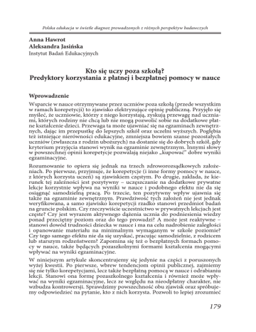 Polska edukacja w świetle diagnoz prowadzonych z różnych perspektyw badawczych Anna Hawrot Aleksandra Jasińska Instytut Badań Edukacyjnych Kto się uczy poza szkołą? Predyktory korzystania z płatnej i bezpłatnej pomocy w nauce Wprowadzenie Wsparcie w nauce otrzymywane przez uczniów poza szkołą (przede wszystkim w ramach korepetycji) to zjawisko elektryzujące opinię publiczną. Przyjęło się myśleć, że uczniowie, którzy z niego korzystają, zyskują przewagę nad uczniami, których rodziny nie chcą lub nie mogą pozwolić sobie na dodatkowe płatne kształcenie dzieci. Przewaga ta może ujawniać się na egzaminach zewnętrznych, dając im przepustkę do lepszych szkół oraz uczelni wyższych. Pogłębia też istniejące nierówności edukacyjne, zmniejsza bowiem szanse pozostałych uczniów (zwłaszcza z rodzin uboższych) na dostanie się do dobrych szkół, gdy kryterium przyjęcia stanowi wynik na egzaminie zewnętrznym. Innymi słowy w powszechnej opinii korepetycje pozwalają niejako „kupować” dobre wyniki egzaminacyjne. Rozumowanie to opiera się jednak na trzech zdroworozsądkowych założeniach. Po pierwsze, przyjmuje, że korepetycje (i inne formy pomocy w nauce, z których korzysta uczeń) są zjawiskiem częstym. Po drugie, zakłada, że kierunek tej zależności jest pozytywny – uczęszczanie na dodatkowe prywatne lekcje korzystnie wpływa na wyniki w nauce i podobnego efektu nie da się osiągnąć samodzielną pracą. Po trzecie, ten pozytywny wpływ ujawnia się także na egzaminie zewnętrznym. Prawdziwość tych założeń nie jest jednak weryfikowana, a samo zjawisko korepetycji rzadko stanowi przedmiot badań na gruncie polskim. Czy rzeczywiście uczestnictwo w prywatnych lekcjach jest częste? Czy jest wyrazem aktywnego dążenia ucznia do podniesienia wiedzy ponad przeciętny poziom oraz do tego prowadzi? A może jest reaktywne – stanowi dowód trudności dziecka w nauce i ma na celu nadrobienie zaległości i opanowanie materiału na minimalnym wymaganym w szkole poziomie? Czy tego samego efektu nie da się uzyskać, pracując samodzielnie, z rodzicem lub starszym rodzeństwem? Zapomina się też o bezpłatnych formach pomocy w nauce, także będących pozaszkolnymi formami kształcenia mogącymi wpływać na wyniki egzaminacyjne. W niniejszym artykule skoncentrujemy się jedynie na części z poruszonych wyżej kwestii. Po pierwsze, wbrew tendencjom opinii publicznej, zajmiemy się nie tylko korepetycjami, lecz także bezpłatną pomocą w nauce i odrabianiu lekcji. Stanowi ona formę pozaszkolnego kształcenia i również może wpływać na wyniki egzaminacyjne, lecz ze względu na nieodpłatny charakter, nie wzbudza kontrowersji. Sprawdzimy powszechność obu zjawisk oraz spróbujemy odpowiedzieć na pytanie, kto z nich korzysta. Pozwoli to lepiej zrozumieć 179 XIX Konferencja Diagnostyki Edukacyjnej, Gniezno 2013 omawiane zjawisko, co stanowi pierwszy krok w ramach badania zależności między korzystaniem z tego wsparcia a wynikami w nauce. Korepetycje i wsparcie edukacyjne Wsparcie w nauce udzielane dziecku może przyjmować wiele form, np. zajęć ogólnorozwojowych (sportowych, artystycznych i innych), korepetycji, bezpłatnych zajęć organizowanych przez szkołę (wyrównawczych, kół zainteresowań). W centrum naszego zainteresowania leżą dwa rodzaje zajęć: korepetycje oraz bezpłatne wsparcie w nauce przedmiotów, które są obecne na egzaminie gimnazjalnym. Korepetycje rozumiemy jako dodatkowe odpłatne zajęcia z przedmiotów objętych nauczaniem w szkole (skoncentrowane np. na odrabianiu prac domowych, powtarzaniu materiału, nadrabianiu zaległości, przygotowaniu do sprawdzianów), realizowane indywidualnie lub w małych grupach. Za zjawisko odmienne od korepetycji uznajemy bezpłatne wsparcie edukacyjne, czyli bezpłatną pomoc w nauce i odrabianiu lekcji udzielaną przez rodzinę, wolontariuszy, świetlice środowiskowe i instytucje inne niż szkoła. Ujęcie to jest zbieżne z definicją Bray’a (2007), który definiuje korepetycje (private tutoring) jako dodatkowe zajęcia z przedmiotów objętych nauczaniem w szkole realizowane przez korepetytorów w celach zarobkowych. Akcentuje ono, że korepetycjami nie są płatne i bezpłatne dodatkowe zajęcia ogólnorozwojowe (np. artystyczne, sportowe) ani bezpłatne dodatkowe zajęcia edukacyjne organizowane przez szkołę (np. koła zainteresowań, zajęcia wyrównawcze). Jednakże na świecie korepetycje często realizowane są w innych formach niż w Polsce, np. w dużych grupach, przez internet, a prowadzą je niejednokrotnie wyspecjalizowane firmy (Bray, 2007). Nasza definicja ogranicza w pewnym stopniu różnorodność form korepetycji, co pozwala uwzględnić ich polską specyfikę. Powszechność korepetycji i bezpłatnego wsparcia w nauce Powszechność korepetycji wśród uczniów na różnych etapach edukacyjnych nie jest w Polsce znana. Mimo iż pojawiają się próby jej oszacowania, niereprezentatywność próbek respondentów i fakt obejmowania badaniem osób łatwo dostępnych, np. studentów (np. Putkiewicz, 2006) sprawia, że nie dają one wiarygodnych informacji. Orientacyjnych informacji dostarczają wyniki badania PISA z 2006 roku (OECD, 2011). Sugerują one, że wśród piętnasto- i szesnastolatków odsetek uczniów uzyskujących pomoc w nauce poza lekcjami szkolnymi jest znaczący. W badaniu pytano o uczęszczanie na dodatkowe lekcje poza zajęciami obowiązkowymi, odbywające się albo indywidualnie, albo grupowo (w małych i dużych grupach), realizowane przez nauczycieli ze szkoły ucznia i spoza niej. Około 44% polskich uczniów zadeklarowało, że uczestniczy w tego typu zajęciach z języka polskiego, zaś z matematyki – około 51%. Dane te dotyczą jednak wszelkich płatnych i bezpłatnych lekcji zapewnianych zarówno przez szkołę, jak i rodziców czy instytucje inne niż szkoła. Do zajęć, które z relatywnie największym praw