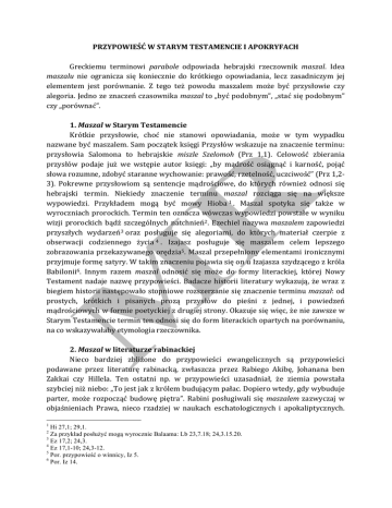PRZYPOWIEŚĆ W STARYM TESTAMENCIE I APOKRYFACH Greckiemu terminowi parabole odpowiada hebrajski rzeczownik maszal. Idea maszalu nie ogranicza się koniecznie do krótkiego opowiadania, lecz zasadniczym jej elementem jest porównanie. Z tego też powodu maszalem może być przysłowie czy alegoria. Jedno ze znaczeń czasownika maszal to „być podobnym”, „stać się podobnym” czy „porównać”. 1. Maszal w Starym Testamencie Krótkie przysłowie, choć nie stanowi opowiadania, może w tym wypadku nazwane być maszalem. Sam początek księgi Przysłów wskazuje na znaczenie terminu: przysłowia Salomona to hebrajskie miszle Szelomoh (Prz 1,1). Celowość zbierania przysłów podaje już we wstępie autor księgi: „by mądrość osiągnąć i karność, pojąć słowa rozumne, zdobyć staranne wychowanie: prawość, rzetelność, uczciwość” (Prz 1,2-‐ 3). Pokrewne przysłowiom są sentencje mądrościowe, do których również odnosi się hebrajski termin. Niekiedy znaczenie terminu maszal rozciąga się na większe wypowiedzi. Przykładem mogą być mowy Hioba 1 . Maszal spotyka się także w wyroczniach prorockich. Termin ten oznacza wówczas wypowiedzi powstałe w wyniku wizji prorockich bądź szczególnych natchnień2. Ezechiel nazywa maszalem zapowiedzi przyszłych wydarzeń 3 oraz posługuje się alegoriami, do których materiał czerpie z obserwacji codziennego życia 4 . Izajasz posługuje się maszalem celem lepszego zobrazowania przekazywanego orędzia5. Maszal przepełniony elementami ironicznymi przyjmuje formę satyry. W takim znaczeniu pojawia się on u Izajasza szydzącego z króla Babilonii6. Innym razem maszal odnosić się może do formy literackiej, której Nowy Testament nadaje nazwę przypowieści. Badacze historii literatury wykazują, że wraz z biegiem historii następowało stopniowe rozszerzanie się znaczenie terminu maszal: od prostych, krótkich i pisanych prozą przysłów do pieśni z jednej, i powiedzeń mądrościowych w formie poetyckiej z drugiej strony. Okazuje się więc, że nie zawsze w Starym Testamencie termin ten odnosi się do form literackich opartych na porównaniu, na co wskazywałaby etymologia rzeczownika. 2. Maszal w literaturze rabinackiej Nieco bardziej zbliżone do przypowieści ewangelicznych są przypowieści podawane przez literaturę rabinacką, zwłaszcza przez Rabiego Akibę, Johanana ben Zakkai czy Hillela. Ten ostatni np. w przypowieści uzasadniał, że ziemia powstała szybciej niż niebo: „To jest jak z królem budującym pałac. Dopiero wtedy, gdy wybuduje parter, może rozpocząć budowę piętra”. Rabini posługiwali się maszalem zazwyczaj w objaśnieniach Prawa, nieco rzadziej w naukach eschatologicznych i apokaliptycznych. 1 Hi 27,1; 29,1. Za przykład posłużyć mogą wyrocznie Balaama: Lb 23,7.18; 24,3.15.20. 3 Ez 17,2; 24,3. 4 Ez 17,1-10; 24,3-12. 5 Por. przypowieść o winnicy, Iz 5. 6 Por. Iz 14. 2 Dzięki bezpośredniemu przytoczeniu cytatu z Biblii Hebrajskiej, niektórzy rabini nazywali przypowieści nicią Ariadny, dzięki której łatwiej nie zagubić się w labiryncie ksiąg. Przypowieść pojawia się także w rabinackich komentarzach biblijnych zwanych midraszami. 3. Maszal w literaturze apokryficznej judaizmu Maszal znalazł swe zastosowanie w tego typu pismach apokaliptycznych jak 4 Księga Ezdrasza, Henoch Etiopski czy Testament Lewiego. Greckie słowo apokryfos oznacza „ukryty”, stąd apokryfami nazywane są księgi, które zawierają wiedzę ukrytą, tajemną, niedostępną zwykłym śmiertelnikom. Dostęp mają do niej jedynie wtajemniczeni (niekiedy przez ryt inicjacji). Apokryfy nie weszły w skład kanonu, gdyż nie zostały uznane za natchnione. Zaskakującym jest fakt, że judaizm diaspory nie przekazał żadnych przypowieści. Są one typowe dla judaizmu palestyńskiego, a ich oryginalnym językiem jest hebrajski (choć niekiedy zapisano w tekście hebrajskim krótkie, aramejskie sformułowania). Niektórzy egzegeci próbują dopatrzyć się w nich jasno określonej struktury, do której zaliczają: część przedstawiającą, formułę wprowadzającą, część narracyjną, czyli właściwą przypowieść, zastosowanie i cytat biblijny.