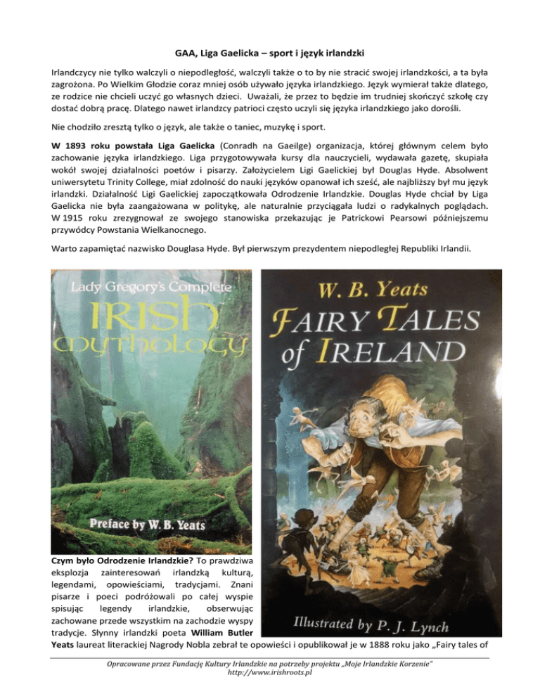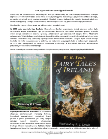 GAA, Liga Gaelicka – sport i język irlandzki Irlandczycy nie tylko walczyli o niepodległość, walczyli także o to by nie stracić swojej irlandzkości, a ta była zagrożona. Po Wielkim Głodzie coraz mniej osób używało języka irlandzkiego. Język wymierał także dlatego, ze rodzice nie chcieli uczyć go własnych dzieci. Uważali, że przez to będzie im trudniej skończyć szkołę czy dostać dobrą pracę. Dlatego nawet irlandzcy patrioci często uczyli się języka irlandzkiego jako dorośli. Nie chodziło zresztą tylko o język, ale także o taniec, muzykę i sport. W 1893 roku powstała Liga Gaelicka (Conradh na Gaeilge) organizacja, której głównym celem było zachowanie języka irlandzkiego. Liga przygotowywała kursy dla nauczycieli, wydawała gazetę, skupiała wokół swojej działalności poetów i pisarzy. Założycielem Ligi Gaelickiej był Douglas Hyde. Absolwent uniwersytetu Trinity College, miał zdolność do nauki języków opanował ich sześć, ale najbliższy był mu język irlandzki. Działalność Ligi Gaelickiej zapoczątkowała Odrodzenie Irlandzkie. Douglas Hyde chciał by Liga Gaelicka nie była zaangażowana w politykę, ale naturalnie przyciągała ludzi o radykalnych poglądach. W 1915 roku zrezygnował ze swojego stanowiska przekazując je Patrickowi Pearsowi późniejszemu przywódcy Powstania Wielkanocnego. Warto zapamiętać nazwisko Douglasa Hyde. Był pierwszym prezydentem niepodległej Republiki Irlandii. Czym było Odrodzenie Irlandzkie? To prawdziwa eksplozja zainteresowań irlandzką kulturą, legendami, opowieściami, tradycjami. Znani pisarze i poeci podróżowali po całej wyspie spisując legendy irlandzkie, obserwując zachowane przede wszystkim na zachodzie wyspy tradycje. Słynny irlandzki poeta William Butler Yeats laureat literackiej Nagrody Nobla zebrał te opowieści i opublikował je w 1888 roku jako „Fairy tales of Opracowane przez Fundację Kultury Irlandzkie na potrzeby projektu „Moje Irlandzkie Korzenie” http://www.irishroots.pl Ireland”. Drugim ważnym zbiorem legend jest książka „Irish Mythology” autorstwa Lady Gregory bardzo ważnej postaci irlandzkiego odrodzenia. Jej zbiór irlandzkich legend został wydany oryginalnie jako dwa tomy na początku XX wieku. Zwyczaje panujące na Wyspach Aran za zachodzie Irlandii znamy dzięki książce Johna Millingtona Synge’a. Gdyby nie on nie wiedzielibyśmy dzisiaj jak żyli na przełomie XIX i XX wieku ludzie w tym pięknym, ale nieco odseparowanym od świata zakątku Irlandii. Cała trójka: Yeats, Synge i Lady Gregory była zaangażowana w powstanie wyjątkowego teatru, w którym sztuki wstawiane były po irlandzku. Teatr Abbey do dzisiaj jest jedną z najważniejszych scen teatralnych Irlandii. Kiedy powstawał był dla Irlandczyków czymś wyjątkowym: sceną na której mogli wystawiać irlandzkie sztuki, o Irlandii i to jeszcze po irlandzku. Ważny był także sport. Na Zielonej Wyspie uprawia się dyscypliny sportu, których nie ma nigdzie na świecie. Football gaelicki i hurling są grami o bardzo długiej tradycji pojawiającymi się w starych, irlandzkich poematach. Od zawsze grano w hurling i football gaelicki, ale w każdym miejscu Irlandii w trochę inny sposób. Gaelic Atlethic Association w skrócie GAA, zostało założone w 1884 roku przez nauczyciela Michaela Cusacka i sportowca P.W. Nally’ego. Głównym celem Gaelickiego Stowarzyszenia Atletycznego była popularyzacja sportów irlandzkich, ujednolicenie ich przepisów, ale także promocja irlandzkiej muzyki i tańca. Od samego początku GAA było bardzo mocno związane z irlandzką walką o niepodległość chociaż starało się być apolityczne. Stąd, jak w przypadku Ligi Gaelickiej, większość głównych postaci irlandzkiej sceny narodowowyzwoleńczej XX wieku było członkami zarówno Ligi jak i GAA. Gracze GAA musieli przestrzegać przepisu zabraniającego im grania w innych zespołach sportowych. Chodziło tu przede wszystkim o zakaz gry w piłkę nożną w zespołach angielskich. Przepis ten wzbudzający dużo kontrowersji został zniesiony ostatecznie w 1971 roku. W 1913 roku GAA nabyła ziemię na północnej stronie rzeki Liffey w Dublinie. To tam powstała siedziba stowarzyszenia, a przede wszystkim stadion, na którym rozgrywane są do dzisiaj wszystkie mecze hurlinga i footballu gaelickiego. Croke Park wywodzi swoją nazwę od nazwiska arcybiskupa Cashel – Thomasa W. Croke, który wspierał GAA od ich pierwszego spotkania. Croke Park jest trzecim co do wielkości stadionem sportowym w Europie. Tu znajduje się także muzeum sportów gaelickich. Opracowane przez Fundację Kultury Irlandzkie na potrzeby projektu „Moje Irlandzkie Korzenie” http://www.irishroots.pl Opracowane przez Fundację Kultury Irlandzkie na potrzeby projektu „Moje Irlandzkie Korzenie” http://www.irishroots.pl
