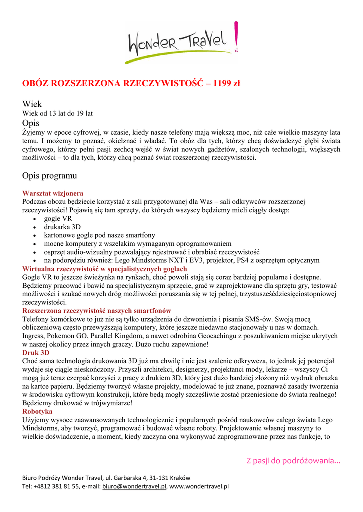OBÓZ ROZSZERZONA RZECZYWISTOŚĆ – 1199 zł Wiek Wiek od 13 lat do 19 lat Opis Żyjemy w epoce cyfrowej, w czasie, kiedy nasze telefony mają większą moc, niż całe wielkie maszyny lata temu. I możemy to poznać, okiełznać i władać. To obóz dla tych, którzy chcą doświadczyć głębi świata cyfrowego, którzy pełni pasji zechcą wejść w świat nowych gadżetów, szalonych technologii, większych możliwości – to dla tych, którzy chcą poznać świat rozszerzonej rzeczywistości. Opis programu Warsztat wizjonera Podczas obozu będziecie korzystać z sali przygotowanej dla Was – sali odkrywców rozszerzonej rzeczywistości! Pojawią się tam sprzęty, do których wszyscy będziemy mieli ciągły dostęp: gogle VR drukarka 3D kartonowe gogle pod nasze smartfony mocne komputery z wszelakim wymaganym oprogramowaniem osprzęt audio-wizualny pozwalający rejestrować i obrabiać rzeczywistość na podorędziu również: Lego Mindstorms NXT i EV3, projektor, PS4 z osprzętęm optycznym Wirtualna rzeczywistość w specjalistycznych goglach Gogle VR to jeszcze świeżynka na rynkach, choć powoli stają się coraz bardziej popularne i dostępne. Będziemy pracować i bawić na specjalistycznym sprzęcie, grać w zaprojektowane dla sprzętu gry, testować możliwości i szukać nowych dróg możliwości poruszania się w tej pełnej, trzystusześćdziesięciostopniowej rzeczywistości. Rozszerzona rzeczywistość naszych smartfonów Telefony komórkowe to już nie są tylko urządzenia do dzwonienia i pisania SMS-ów. Swoją mocą obliczeniową często przewyższają komputery, które jeszcze niedawno stacjonowały u nas w domach. Ingress, Pokemon GO, Parallel Kingdom, a nawet odrobina Geocachingu z poszukiwaniem miejsc ukrytych w naszej okolicy przez innych graczy. Dużo ruchu zapewnione! Druk 3D Choć sama technologia drukowania 3D już ma chwilę i nie jest szalenie odkrywcza, to jednak jej potencjał wydaje się ciągle nieskończony. Przyszli architekci, designerzy, projektanci mody, lekarze – wszyscy Ci mogą już teraz czerpać korzyści z pracy z drukiem 3D, który jest dużo bardziej złożony niż wydruk obrazka na kartce papieru. Będziemy tworzyć własne projekty, modelować te już znane, poznawać zasady tworzenia w środowisku cyfrowym konstrukcji, które będą mogły szczęśliwie zostać przeniesione do świata realnego! Będziemy drukować w trójwymiarze! Robotyka Użyjemy wysoce zaawansowanych technologicznie i popularnych pośród naukowców całego świata Lego Mindstorms, aby tworzyć, programować i budować własne roboty. Projektowanie własnej maszyny to wielkie doświadczenie, a moment, kiedy zaczyna ona wykonywać zaprogramowane przez nas funkcje, to Z pasji do podróżowania... Biuro Podróży Wonder Travel, ul. Garbarska 4, 31-131 Kraków Tel: +4812 381 81 55, e-mail: [email protected], www.wondertravel.pl duże przeżycie. Dzięki szeregowi sensorów będziemy mogli zrobić naprawdę wiele, gdyż nasz robot zobaczy, poczuje, rozróżni barwy i będzie mógł się poruszać – wszystko zgodnie z tym, jak go zaprogramujemy. Podstawy nowoczesnych technologii Aby wszystkim naszym działaniom nadać sens, poświęcimy też trochę czasu na poznanie podstaw stojących za wszystkimi procesami: jak działają gogle 3D i jak realizować zabawę w czymś takim; w jakich programach możemy uczestniczyć poprzez nasze smartfony; praca w środowisku 3D i tworzenie przestrzeni wirtualnej. Będziemy nie tylko korzystać z dobrodziejstw tych technologii, ale także poznamy ich działanie, aby lepiej wiedzieć, jak ich używać. Przyszłość krok od nas Zajmiemy się także nowinkami na rynku technologicznym, przedyskutujemy je i spróbujemy sami przewidzieć kierunki, w które uda się technologia. Samosterujące się samochody, udające ludzi roboty, maszyny z niezwykłą sprawnością wykonujące do tej pory zarezerwowane dla ludzi czynności, dzieła Boston Dynamic, lądujące rakiety kosmiczne. Nauka jest tutaj, dzisiaj. Sięganie do gwiazd dzisiaj zaczyna się już na YouTube’ie. Pamiętnik przyszłości Dzisiaj pisanie pamiętnika to już nie tylko chowanie swoich uczuć w zamkniętym zeszycie. Dzisiaj pamiętnik to połączenie social media, materiałów wideo i audio, stosowanie najróżniejszych środków przekazu, marketingowy proces uczestniczenia w cyberrzeczywistości. Spróbujecie stworzyć żywy profil swojego obozu, w którym zamieszczone materiały będą mieć viralną siłę uderzenia w sieć. Nauczymy się, jak dobrze posługiwać się szeregiem możliwości: począwszy od bloggera, przez Facebooka po YouTube’a; od tekstu pisanego po realizację filmików wideo i streamy. Strefa rozrywki team building, gry i zabawy integracyjne gry planszowe, konsole PS3 i PS4 konkursy i turnieje dyskoteka przebierana z motywem przewodnim zimowe szaleństwa w białym puchu górskie spacery i zwiedzanie Wisły wieczory filmowe obozowe Mam Talent Noc Artystów, czyli wieczór inspiracji i dialogu sztuk udział w pokazie finałowym obozów wInterkamp Pokaz finałowy Zwieńczeniem tygodniowych warsztatów zimowych jest pokaz finałowy. W scenariuszu: prezentacje multimedialne, pokazy taneczne, koncerty, spektakle i wystawy. Wyżywienie 4 posiłki dziennie: śniadanie, obiad + podwieczorek, kolacja. Przygotowywane w ośrodku, od obiadu pierwszego dnia do śniadania dnia ostatniego. Suchy prowiant na drogę powrotną. Cena zawiera Zakwaterowanie (6 noclegów), wyżywienie 4 razy dziennie, bardzo aktywny program, opiekę kadry pedagogicznej i instruktorskiej oraz lekarza, ubezpieczenie NNW. Z pasji do podróżowania... Biuro Podróży Wonder Travel, ul. Garbarska 4, 31-131 Kraków Tel: +4812 381 81 55, e-mail: [email protected], www.wondertravel.pl Cena nie zawiera Dojazdu i dodatkowych atrakcji. Atrakcje dodatkowe: Aquapark Tropikana w Hotelu Gołębiewski - 50 zł Co zabrać poprawnie wypełnioną kartę kwalifikacyjną z numerem PESEL ważną legitym