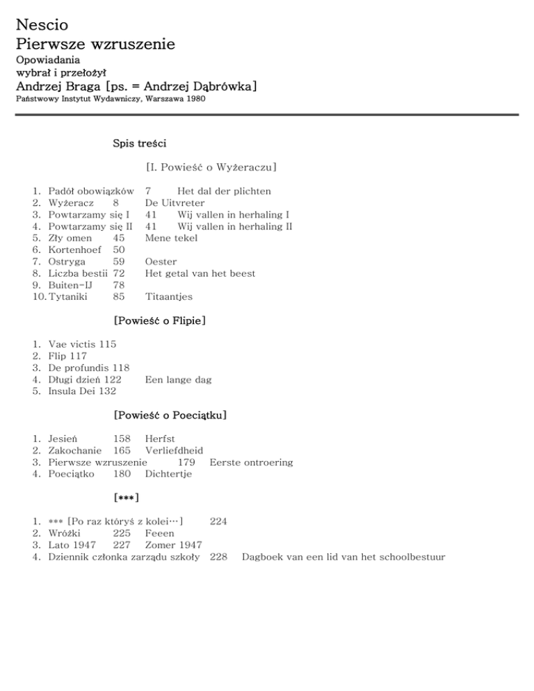Nescio Pierwsze wzruszenie Opowiadania wybrał i przełożył Andrzej Braga [ps. = Andrzej Dąbrówka] Państwowy Instytut Wydawniczy, Warszawa 1980 Spis treści [I. Powieść o Wyżeraczu] 1. Padół obowiązków 2. Wyżeracz 8 3. Powtarzamy się I 4. Powtarzamy się II 5. Zły omen 45 6. Kortenhoef 50 7. Ostryga 59 8. Liczba bestii 72 9. Buiten-IJ 78 10. Tytaniki 85 7 Het dal der plichten De Uitvreter 41 Wij vallen in herhaling I 41 Wij vallen in herhaling II Mene tekel Oester Het getal van het beest Titaantjes [Powieść o Flipie] 1. 2. 3. 4. 5. Vae victis 115 Flip 117 De profundis 118 Długi dzień 122 Insula Dei 132 Een lange dag [Powieść o Poeciątku] 1. 2. 3. 4. Jesień 158 Herfst Zakochanie 165 Verliefdheid Pierwsze wzruszenie 179 Eerste ontroering Poeciątko 180 Dichtertje [***] 1. 2. 3. 4. *** [Po raz któryś z kolei…] 224 Wróżki 225 Feeen Lato 1947 227 Zomer 1947 Dziennik członka zarządu szkoły 228 Dagboek van een lid van het schoolbestuur