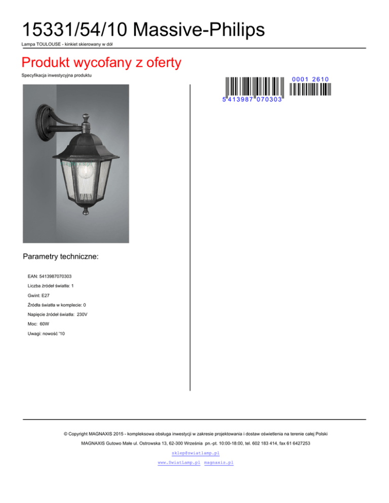 15331/54/10 Massive-Philips Lampa TOULOUSE - kinkiet skierowany w dół Produkt wycofany z oferty Specyfikacja inwestycyjna produktu 0001 2610 5 413987 070303 Parametry techniczne: EAN: 5413987070303 Liczba źródeł światła: 1 Gwint: E27 Źródła światła w komplecie: 0 Napięcie źródeł światła: 230V Moc: 60W Uwagi: nowość '10 © Copyright MAGNAXIS 2015 - kompleksowa obsługa inwestycji w zakresie projektowania i dostaw oświetlenia na terenie całej Polski MAGNAXIS Gutowo Małe ul. Ostrowska 13, 62-300 Września pn.-pt. 10:00-18:00, tel. 602 183 414, fax 61 6427253 [email protected] www.SwiatLamp.pl magnaxis.pl