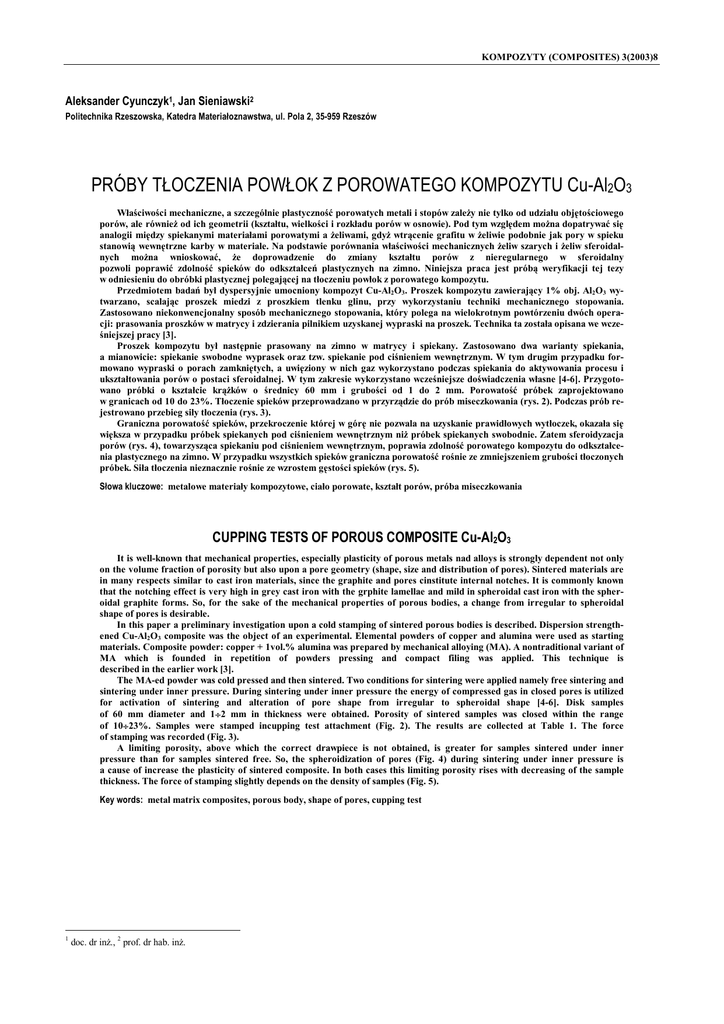 KOMPOZYTY (COMPOSITES) 3(2003)8 Aleksander Cyunczyk1, Jan Sieniawski2 Politechnika Rzeszowska, Katedra Materiałoznawstwa, ul. Pola 2, 35-959 Rzeszów PRÓBY TŁOCZENIA POWŁOK Z POROWATEGO KOMPOZYTU Cu-Al2O3 Właściwości mechaniczne, a szczególnie plastyczność porowatych metali i stopów zależy nie tylko od udziału objętościowego porów, ale również od ich geometrii (kształtu, wielkości i rozkładu porów w osnowie). Pod tym względem można dopatrywać się analogii między spiekanymi materiałami porowatymi a żeliwami, gdyż wtrącenie grafitu w żeliwie podobnie jak pory w spieku stanowią wewnętrzne karby w materiale. Na podstawie porównania właściwości mechanicznych żeliw szarych i żeliw sferoidalnych można wnioskować, że doprowadzenie do zmiany kształtu porów z nieregularnego w sferoidalny pozwoli poprawić zdolność spieków do odkształceń plastycznych na zimno. Niniejsza praca jest próbą weryfikacji tej tezy w odniesieniu do obróbki plastycznej polegającej na tłoczeniu powłok z porowatego kompozytu. Przedmiotem badań był dyspersyjnie umocniony kompozyt Cu-Al2O3. Proszek kompozytu zawierający 1% obj. Al2O3 wytwarzano, scalając proszek miedzi z proszkiem tlenku glinu, przy wykorzystaniu techniki mechanicznego stopowania. Zastosowano niekonwencjonalny sposób mechanicznego stopowania, który polega na wielokrotnym powtórzeniu dwóch operacji: prasowania proszków w matrycy i zdzierania pilnikiem uzyskanej wypraski na proszek. Technika ta została opisana we wcześniejszej pracy [3]. Proszek kompozytu był następnie prasowany na zimno w matrycy i spiekany. Zastosowano dwa warianty spiekania, a mianowicie: spiekanie swobodne wyprasek oraz tzw. spiekanie pod ciśnieniem wewnętrznym. W tym drugim przypadku formowano wypraski o porach zamkniętych, a uwięziony w nich gaz wykorzystano podczas spiekania do aktywowania procesu i ukształtowania porów o postaci sferoidalnej. W tym zakresie wykorzystano wcześniejsze doświadczenia własne [4-6]. Przygotowano próbki o kształcie krążków o średnicy 60 mm i grubości od 1 do 2 mm. Porowatość próbek zaprojektowano w granicach od 10 do 23%. Tłoczenie spieków przeprowadzano w przyrządzie do prób miseczkowania (rys. 2). Podczas prób rejestrowano przebieg siły tłoczenia (rys. 3). Graniczna porowatość spieków, przekroczenie której w górę nie pozwala na uzyskanie prawidłowych wytłoczek, okazała się większa w przypadku próbek spiekanych pod ciśnieniem wewnętrznym niż próbek spiekanych swobodnie. Zatem sferoidyzacja porów (rys. 4), towarzysząca spiekaniu pod ciśnieniem wewnętrznym, poprawia zdolność porowatego kompozytu do odkształcenia plastycznego na zimno. W przypadku wszystkich spieków graniczna porowatość rośnie ze zmniejszeniem grubości tłoczonych próbek. Siła tłoczenia nieznacznie rośnie ze wzrostem gęstości spieków (rys. 5). Słowa kluczowe: metalowe materiały kompozytowe, ciało porowate, kształt porów, próba miseczkowania CUPPING TESTS OF POROUS COMPOSITE Cu-Al2O3 It is well-known that mechanical properties, especially plasticity of porous metals nad alloys is strongly dependent not only on the volume fraction of porosity but also upon a pore geometry (shape, size and distribution of pores). Sintered materials are in many respects similar to cast iron materials, since the graphite and pores cinstitute internal notches. It is commonly known that the notching effect is very high in grey cast iron with the grphite lamellae and mild in spheroidal cast iron with the spheroidal graphite forms. So, for the sake of the mechanical properties of porous bodies, a change from irregular to spheroidal shape of pores is desirable. In this paper a preliminary investigation upon a cold stamping of sintered porous bodies is described. Dispersion strengthened Cu-Al2O3 composite was the object of an experimental. Elemental powders of copper and alumina were used as starting materials. Composite powder: copper + 1vol.% alumina was prepared by mechanical alloying (MA). A nontraditional variant of MA which is founded in repetition of powders pressing and compact filing was applied. This technique is described in the earlier work [3]. The MA-ed powder was cold pressed and then sintered. Two conditions for sintering were applied namely free sintering and sintering under inner pressure. During sintering under inner pressure the energy of compressed gas in closed pores is utilized for activation of sintering and alteration of pore shape from irregular to spheroidal shape [4-6]. Disk samples of 60 mm diameter and 1÷2 mm in thickness were obtained. Porosity of sintered samples was closed within the range of 10÷23%. Samples were stamped incupping test attachment (Fig. 2). The results are collected at Table 1. The force of stamping was recorded (Fig. 3). A limiting porosity, above which the correct drawpiece is not obtained, is greater for samples sintered under inner pressure than for samples sintered free. So, the spheroidization of pores (Fig. 4) during sintering under inner pressure is a cause of increase the plasticity of sintered composite. In both cases this limiting porosity rises with decreasing of the sample thickness. The force of stamping slightly depends on the density of samples (Fig. 5). Key words: metal matrix composites, porous body, shape of pores, cupping test 1 doc. dr inż., 2 prof. dr hab. inż. Próby tłoczenia powłok z porowatego kompozytu Cu-Al2O3 WSTĘP Obróbka plastyczna w technologii proszków spiekanych sprowadza się w zasadzie do procesów dogęszczania porowatego materiału i ma na celu uzyskanie wyrobu litego o wymaganym kształcie. Gotowe części maszyn i inne nieporowate detale z proszków metali, stopów i kompozytów wytwarza się na drodze kucia matrycowego na gorąco lub prasowania izostatycznego na gorąco. Z kolei nieporowate półfabrykaty (pręty, kształtowniki, rury, taśmy) otrzymuje się z proszków metodą wyciskania lub w