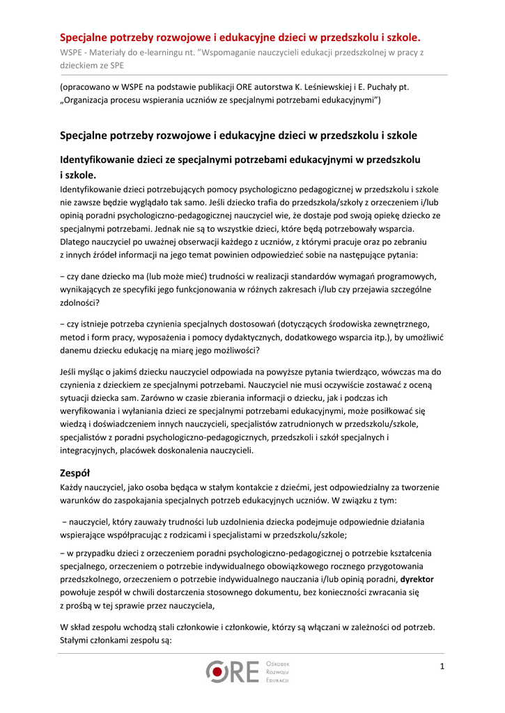 Specjalne potrzeby rozwojowe i edukacyjne dzieci w przedszkolu i szkole. WSPE - Materiały do e-learningu nt. ”Wspomaganie nauczycieli edukacji przedszkolnej w pracy z dzieckiem ze SPE (opracowano w WSPE na podstawie publikacji ORE autorstwa K. Leśniewskiej i E. Puchały pt. „Organizacja procesu wspierania uczniów ze specjalnymi potrzebami edukacyjnymi”) Specjalne potrzeby rozwojowe i edukacyjne dzieci w przedszkolu i szkole Identyfikowanie dzieci ze specjalnymi potrzebami edukacyjnymi w przedszkolu i szkole. Identyfikowanie dzieci potrzebujących pomocy psychologiczno pedagogicznej w przedszkolu i szkole nie zawsze będzie wyglądało tak samo. Jeśli dziecko trafia do przedszkola/szkoły z orzeczeniem i/lub opinią poradni psychologiczno-pedagogicznej nauczyciel wie, że dostaje pod swoją opiekę dziecko ze specjalnymi potrzebami. Jednak nie są to wszystkie dzieci, które będą potrzebowały wsparcia. Dlatego nauczyciel po uważnej obserwacji każdego z uczniów, z którymi pracuje oraz po zebraniu z innych źródeł informacji na jego temat powinien odpowiedzieć sobie na następujące pytania: − czy dane dziecko ma (lub może mieć) trudności w realizacji standardów wymagań programowych, wynikających ze specyfiki jego funkcjonowania w różnych zakresach i/lub czy przejawia szczególne zdolności? − czy istnieje potrzeba czynienia specjalnych dostosowań (dotyczących środowiska zewnętrznego, metod i form pracy, wyposażenia i pomocy dydaktycznych, dodatkowego wsparcia itp.), by umożliwić danemu dziecku edukację na miarę jego możliwości? Jeśli myśląc o jakimś dziecku nauczyciel odpowiada na powyższe pytania twierdząco, wówczas ma do czynienia z dzieckiem ze specjalnymi potrzebami. Nauczyciel nie musi oczywiście zostawać z oceną sytuacji dziecka sam. Zarówno w czasie zbierania informacji o dziecku, jak i podczas ich weryfikowania i wyłaniania dzieci ze specjalnymi potrzebami edukacyjnymi, może posiłkować się wiedzą i doświadczeniem innych nauczycieli, specjalistów zatrudnionych w przedszkolu/szkole, specjalistów z poradni psychologiczno-pedagogicznych, przedszkoli i szkół specjalnych i integracyjnych, placówek doskonalenia nauczycieli. Zespół Każdy nauczyciel, jako osoba będąca w stałym kontakcie z dziećmi, jest odpowiedzialny za tworzenie warunków do zaspokajania specjalnych potrzeb edukacyjnych uczniów. W związku z tym: − nauczyciel, który zauważy trudności lub uzdolnienia dziecka podejmuje odpowiednie działania wspierające współpracując z rodzicami i specjalistami w przedszkolu/szkole; − w przypadku dzieci z orzeczeniem poradni psychologiczno-pedagogicznej o potrzebie kształcenia specjalnego, orzeczeniem o potrzebie indywidualnego obowiązkowego rocznego przygotowania przedszkolnego, orzeczeniem o potrzebie indywidualnego nauczania i/lub opinią poradni, dyrektor powołuje zespół w chwili dostarczenia stosownego dokumentu, bez konieczności zwracania się z prośbą w tej sprawie przez nauczyciela, W skład zespołu wchodzą stali członkowie i członkowie, którzy są włączani w zależności od potrzeb. Stałymi członkami zespołu są: 1 Specjalne potrzeby rozwojowe i edukacyjne dzieci w przedszkolu i szkole. WSPE - Materiały do e-learningu nt. ”Wspomaganie nauczycieli edukacji przedszkolnej w pracy z dzieckiem ze SPE − nauczyciele prowadzący zajęcia z danym uczniem, − specjaliści pracujący z uczniem, − wychowawcy grup wychowawczych. Na wniosek dyrektora w posiedzeniu zespołu może uczestniczyć pracownik poradni psychologicznopedagogicznej. W spotkaniach zespołu mają prawo uczestniczyć rodzice ucznia. To ważna zmiana w podejściu do roli rodziców w szkole. Rodzice stają się partnerem dla przedszkola/szkoły, a co za tym idzie, mogą stanowić ogromne wsparcie dla podejmowanych przez nauczycieli i specjalistów działań pomocowych. To właśnie rodzice znają dziecko najlepiej – wiedzą jak ono funkcjonuje, obserwują na co dzień zmiany zachodzące w rozwoju dziecka, są świadkami i uczestnikami interakcji dziecka z otoczeniem, mają rozeznanie, jakie formy pomocy okazywały się dla dziecka skuteczne, a jakie się nie sprawdziły. I to im najbardziej zależy na tym, żeby pomóc dziecku. Zaproszenie rodziców do współdecydowania o sprawach dziecka w szkole ma szansę zaowocować połączeniem wysiłków i większą skutecznością podejmowanych działań, ponieważ wpływy rodziny i szkoły nie będą przeciwne, nie będą się ścierać, lecz będą zmierzać w tym samym kierunku. O terminie spotkania rodziców informuje dyrektor. Działania wspierające dziecko należy prowadzić we współpracy z jego rodzicami i uwzględnić w nich pomoc, którą dziecko może otrzymać od rodziców. Rodzice mogą zapraszać na spotkania zespołu osoby i specjalistów spoza przedszkola/szkoły pracujących z dzieckiem: przedstawiciela organu prowadzącego szkołę, lekarzy, pracownika opieki społecznej opiekującego się rodziną, rehabilitantów i in. Dzieci ze specjalnymi potrzebami edukacyjnymi mogą być w każdej grupie przedszkolnej czy klasie. W takiej sytuacji „nauczyciele prowadzący zajęcia z danym uczniem ze specjalnymi potrzebami edukacyjnymi” to właściwie wszyscy nauczyciele. Zgodnie z rozporządzeniem w sprawie ramowych statutów publicznego przedszkola i publicznych szkół, dyrektor może powoływać zespoły problemowo-zadaniowe, mające na celu tworzenie warunków do edukacji dzieci ze specjalnymi potrzebami. Zakres problematyki działań zespołu jest w gestii przedszkola/szkoły i powinien wynikać z jej potrzeb. Zespołowa analiza potrzeb dziecka Zakładamy, że na wcześniejszych etapach przedstawianej procedury nauczyciel rozpoznał sytuację dziecka. Ukonstytuował się również zespół osób, których zadaniem jest tworzenie warunków do optymalnego rozwoju ucznia ze specjalnymi potrzebami, czyli w perspektywie także stworzenie dla niego indywidualnego 