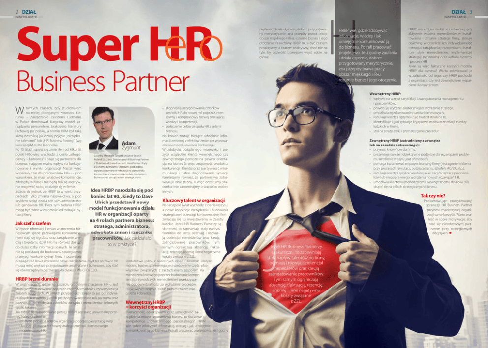 2 DZIAŁ Super HeRo DZIAŁ 3 KOMPENDIUM HR 2015 KOMPENDIUM HR 2015 zaufania i działa etycznie, dobrze przygotowany merytorycznie, zna przepisy prawa pracy, obszar miękkiego HR-u, rozumie biznes i jego otoczenie. Prawdziwy HRBP musi być czasem proaktywny, a czasem reaktywny, choć nie na tyle, by pozwolić biznesowi wejść sobie na głowę. Business Partner W tamtych czasach, gdy studiowałem na mniej obleganym wówczas kierunku – Zarządzanie Zasobami Ludzkimi, w Polsce dominował klasyczny model zarządzania personelem, brakowało literatury fachowej po polsku, a termin HRM był taką samą nowością jak dzisiaj pojęcie „zarządzanie talentami” lub „HR Business Strateg” (wg koncepcji M.A. Mc Donnella). Po 15 latach sporo się zmieniło i od kilku lat polski HR-owiec wychodzi z cienia „usługodawcy – kadrowca” i staje się partnerem dla biznesu, mającym realny wpływ na funkcjonowanie i wyniki organizacji. Nastał więc wspaniały czas dla pracowników HR-u – pod warunkiem, że mają właściwe kompetencje, zdobędą zaufanie i nie będą bali się asertywnie reagować na to, co dzieje się w firmie. Zdarza się jednak, że HRBP to w wielu przypadkach tylko zmiana nazewnictwa, a pod szyldem wciąż działa ten sam administrator lub generalista HR. Poza tym zadania HRBP mogą być różne w zależności od rodzaju i sytuacji firmy. Jak szef z szefem Adam Zygmunt Country Manager, Target Executive Search Poland Sp. z o.o. Zewnętrzny HR Business Partner z 13-letnim doświadczeniem. Headhunter obyty z wieloma branżami i sektorami gospodarki, wyspecjalizowany w rekrutacji na stanowiska kierownicze związane ze sprzedażą i rozwojem biznesu oraz zarządzaniem strategicznym. Idea HRBP narodziła się pod koniec lat 90., kiedy to Dave Ulrich przedstawił nowy model funkcjonowania działu HR w organizacji oparty na 4 rolach partnera biznesu: stratega, administratora, adwokata zmian i rzecznika pracowników. Jak zadziałało to w praktyce? W epoce informacji i zmian w otoczeniu biznesowym, gdzie przewagami konkurencyjnymi stają się big data oraz zarządzanie wiedzą i talentami, dział HR ma również dostęp do dużej liczby informacji i danych. Te ostatnie są podstawą do budowania strategicznej przewagi konkurencyjnej firmy i pozwalają propagować łatwo mierzalne nowe rozwiązania. Stąd też szefowie HR muszą mieć większe przygotowanie analityczne i biznesowe, aby stać się równorzędnym partnerem do dyskusji dla CFO i CEO. HRBP brzmi dumnie W organizacjach, gdzie na szczeblu globalnym znaczenie HR-u jest strategiczne, budowanie pozycji to często formalność i implementacja założeń odgórnych. W innych przypadkach zależy to już od indywidualnych kompetencji osób predystynowanych do roli partnera oraz oczywiście od podejścia członków zarządu i menedżerów liniowych spółki lokalnej. Jak zabrać się za budowanie pozycji HRBP? Jest na to uniwersalny przepis. Należy zadbać o: • zdobycie poparcia liderów organizacji poprzez prezentację wizji i korzysci płynących z nowej strategicznej roli i biznesowego modelu działu HR, Zewnętrzny HRBP (zatrudniony z zewnątrz lub na zasadzie outsourcingu): • przynosi know-how do firmy, • prezentuje świeże i obiektywne podejście dla rozwiązania problemu (myślenie w stylu „out of the box”), • pomaga kształtować employer branding firmy (jest agentem klienta przy procesach rekrutacji, outplacementu, szkoleń, AC/DC, itp.), • redukuje koszty i ryzyko nieudanej rekrutacji/adaptacji pracowników lub niepoprawnego wdrożenia nowych rozwiązań HR, • umożliwia klientowi (menedżerom i wewnętrznemu działowi HR) skupić się na celach strategicznych biznesu. Tak czy nie? Kluczowy talent w organizacji Wewnętrzny HRBP = korzyści organizacji Elastyczność, obiektywizm oraz umiejętność zarządzania zmianą i zrozumienia biznesu to kluczowe kompetencje „nowoczesnego personalnego”. HRBP wie, gdzie zdobywać informację, wiedzę i jak umiejętnie komunikować ją do biznesu. Potrafi pracować projektowo. Jest godny HRBP ma wpływ na biznes wówczas, gdy aktywnie wspiera menedżerów w kształtowaniu i zmianie strategii firmy, stosuje coaching w obszarze ich indywidualnego rozwoju i zarządzania pracownikami, kształtuje style menedżerskie, implementuje strategię personalną oraz wdraża systemy i procesy HR. Jakie są więc faktyczne korzyści modelu HRBP dla biznesu? Warto zróżnicować je w zależności od tego, czy HRBP pochodzi z organizacji, czy jest zewnętrznym wsparciem i konsultantem. Wewnętrzny HRBP: • wpływa na wzrost satysfakcji i zaangażowania managementu i pracowników, • powoduje szybsze i skuteczniejsze wdrażanie strategii, • umożliwia egzekwowanie planów biznesowych, • redukuje koszty i optymalizuje budżet działań HR, • identyfikuje i gasi sytuacje kryzysowe w obszarze relacji miedzyludzkich w firmie, • stoi na straży etyki i przestrzegania procedur. • stopniowe przygotowanie członków zespołu HR do nowej roli poprzez intensywny i kompleksowy rozwój brakującej wiedzy i kompetencji, • połączenie celów zespołu HR z celami biznesu. Na koniec zostaje bieżące udzielanie informacji zwrotnej z efektów zmian po wprowadzeniu modelu business partneringu. W zdobyciu pożądanego wizerunku i pozycji względem klienta wewnętrznego czy zewnętrznego pomoże na pewno orientacja na biznes (a więc znajomość produktu, konkurencji i klienta) oraz asertywność w komunikacji i trafne diagnozowanie sytuacji. Pamiętajmy również, że partnerstwo zobowiązuje obie strony, a więc oczekujmy szacunku i nie zapominajmy o szacunku wobec innych. Na szczęście świat wychodzi z cienia kryzysu, a nowe koncepcje zarządzania i budowania strategicznej przewagi konkurencyjnej firm zwracają się ku inwestowaniu w zasoby ludzkie. Jeżeli HR Business Parnerzy są skuteczni, to zapewniają stały napływ talentów do firmy, oceniają i rozwijają potencjał m