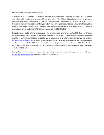 Ogłoszenie do Gazety propozycja treści ATLANTIS S.A. z siedzibą w Płocku ogłasza nieograniczony przetarg pisemny na sprzedaż nieruchomości położonej w centrum Płocka przy Al. J. Piłsudskiego 35, zabudowanej kompleksem biurowo handlowo usługowym o pięciu kondygnacjach. Oddanym do użytku w roku 2015. Powierzchnia nieruchomości gruntowych 6.177 m2 forma prawna: własność . Powierzchnia ogólna obiektu biurowego 10.319,55 m2, powierzchnia wynajmowana obiektu biurowego 8451 m2. Miejsca parkingowe przed budynkiem 73. Cena wywoławcza 40.500.000,00 zł Rozpatrywane będą oferty skierowane do organizatora przetargu: ATLANTIS S.A. w Płocku ul. Padlewskiego 18C, złożone w terminie do dnia 29.04.2016r. Oferta powinna spełniać warunki udziału w przetargu określone szczegółowo w ogłoszeniu o przetargu zamieszczonym na stronie http://www.atlantis-sa.pl/ w dziale O spółce-Informacje . Oferent zobowiązany jest do wniesienia wadium w kwocie 4.050.000 zł na rachunek bankowy Organizatora prowadzony w PKO BP o Płock o nr 70 1020 3974 0000 5202 0180 7411 w terminie do dnia 28.04.2016 roku. Otwarcie ofert nastąpi w dniu 2.05.2016 roku . Szczegółowe informacje o przedmiocie sprzedaży oraz przetargu dostępne są pod adresem http://www.atlantis-sa.pl/ w dziale O spółce- Informacje. Ogłoszenie o przetargu oraz Warunki przetargu ATLANTIS S.A. z siedzibą w Płocku ogłasza nieograniczony przetarg pisemny na sprzedaż nieruchomości zabudowanej budynkiem biurowo handlowo usługowym, położonej w Płocku przy Al. Marszałka J. Piłsudskiego 35 . 1. Przedmiot Przetargu a. Opis Nieruchomości Kompleks biurowo – usługowo – handlowy położony w centrum Płocka przy Al. Marszałka J. Piłsudskiego 35/Granicznej na który składają się: i) użytkowanie wieczyste nieruchomości stanowiącej działkę o nr 91/15 o powierzchni 0,2122ha, zabudowanej pięciokondygnacyjnym budynkiem biurowym stanowiącym odrębną własność przy ul. Piłsudskiego 35 w Płocku, dla której Sąd Rejonowy w Płocku VI Wydział Ksiąg Wieczystych prowadzi księgę wieczystą PL1P/00092836/5, ii) ii) użytkowanie wieczyste nieruchomości stanowiącej działkę o nr 90/7 o powierzchni 0,3225 ha, usytuowanej przy ul. Dobrowolskiego 1 dla której Sąd Rejonowy w Płocku VI Wydział Ksiąg Wieczystych prowadzi księgę wieczystą PL1P/00094762/9, iii) iii) użytkowanie wieczyste nieruchomości stanowiącej działki o nr 91/52 o powierzchni 0,0300 ha, 91/64 o powierzchni 0,0502 ha usytuowanych w Płocku przy ul. Piłsudskiego 35 dla których Sąd Rejonowy w Płocku VI Wydział Ksiąg Wieczystych prowadzi księgę wieczystą PL1P/00097672/2; Dogodne położenie przy jednej z największych arterii Płocka zapewnia doskonałą komunikację, w bezpośredniej bliskości Nieruchomości znajdują się przystanek autobusowy oraz postój taxi. W odległości nie większej niż 2.500 m znajduje się dworzec autobusowy. Budynek o nowoczesnej stylistyce jest wyróżniającym się obiektem na mapie Płocka, wyjątkowa ekspozycja oraz nowoczesna bryła w połączeniu z dogodnym położeniem sprawiają, że jest to prestiżowa lokalizacja dla potencjalnych najemców. Budynek biurowy zabudowany na nieruchomościach objętych przetargiem jest obiektem klasy A, w obecnej formie oddany został do użytku w roku 2015 i zapewnia wysoki standard wykończenia oraz nowoczesną i funkcjonalną powierzchnię. Budynek wyposażony jest w recepcję, 73 miejsca parkingowe . Biurowiec obsługuje pięć wind osobowych w tym winda sanitarna z przeznaczeniem na transport łóżek szpitalnych. Atutem budynku jest pion przystosowany do świadczenia usług medycznych oraz lokal pod aptekę. Na parterze budynku zlokalizowane są powierzchnie usługowo – handlowe. Budynek jest monitorowany oraz chroniony 24 godziny na dobę 7 dni w tygodniu. Przetarg obejmuje łącznie sprzedaż nieruchomości wraz z opisanym wyżej budynkiem biurowym. Powierzchnia Nieruchomości Łączna powierzchnia działek gruntu 6.177 m2 Powierzchnia całkowita budynku 10.319,55 m2 Powierzchnia wynajmowana – biurowa 8451 m2 Miejsca parkingowe naziemne przed budynkiem – 73 b. Dodatkowe informacje i oględziny Dodatkowych informacji dotyczących nieruchomości udzielamy pod numerem telefonu 532 440 510 od poniedziałku do piątku w godzinach 10.00 – 16.00 oraz adresem e-mail [email protected]. Oględziny nieruchomości po uprzednim uzgodnieniu terminu . c. Stan prawny Stan prawny Nieruchomości ujawniony w księgach wieczystych Nieruchomości. 2. Warunki Przetargu: a. Cena wywoławcza 40.500.000,00 zł (czterdzieści milionów pięćset tysięcy złotych). b. Oferujący – Organizator ATLANTIS S.A. w Płocku 09-402 przy ul. Padlewskiego 18C, wpisana do Rejestru Przedsiębiorców krajowego Rejestru Sądowego prowadzonego przez Sąd Rejonowy dla Miasta Stołecznego Warszawy w Warszawie, Wydział XIV Gospodarczy pod numerem KRS 0000033281. c. Miejsce i Termin składania ofert Warunkiem uczestnictwa w przetargu jest złożenie oferty wraz z dowodem wpłaty wadium w zamkniętej kopercie z napisem „Przetarg Nieruchomość ul. Piłsudskiego 35, Płock" w siedzibie organizatora przetargu tj. ATLANTIS S.A. ul. Padlewskiego 18C, Płock w terminie 29.04 .2016r. d. Warunki jakie powinna spełniać Oferta: 1) imię, nazwisko i adres oferenta, PESEL, lub nazwę albo firmę oraz siedzibę, jeżeli oferentem jest osoba prawna; 2) w przypadku, gdy oferenta zastępuje inna osoba, winna ona załączyć sporządzone przez notariusza pełnomocnictwo; 3) w wypadku, gdy oferentem jest osoba prawna, oferent przedkłada oświadczenie upoważnionych do tego organów o wyrażeniu zgody na nabycie nieruchomości, jak również stosowny wyciąg z rejestru potwierdzający, że jest ona osobą prawną i wskazujący kto jest upoważniony do jego reprezentowania i podejmowania decyzji w sprawie nabycia nieruchomości; 4) datę sporządzenia oferty; 5) nazwę przedmiotu przetargu: „Nieruchomo