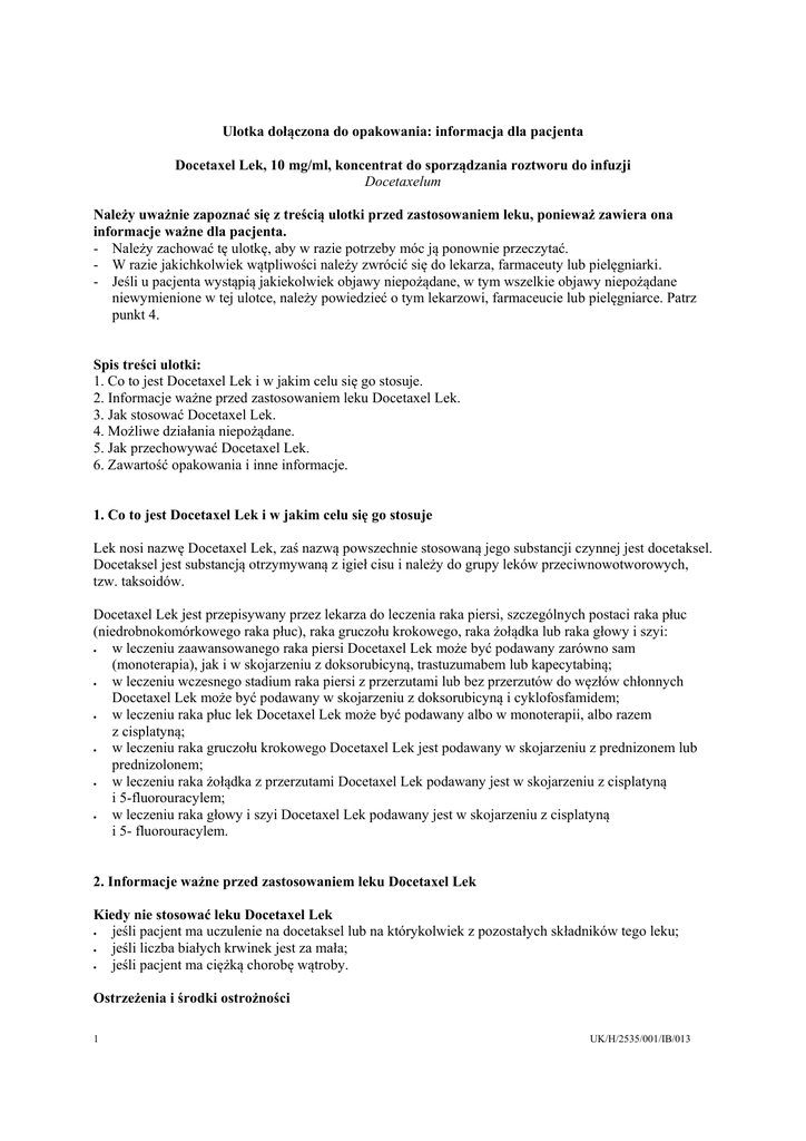 Ulotka dołączona do opakowania: informacja dla pacjenta Docetaxel Lek, 10 mg/ml, koncentrat do sporządzania roztworu do infuzji Docetaxelum Należy uważnie zapoznać się z treścią ulotki przed zastosowaniem leku, ponieważ zawiera ona informacje ważne dla pacjenta. - Należy zachować tę ulotkę, aby w razie potrzeby móc ją ponownie przeczytać. - W razie jakichkolwiek wątpliwości należy zwrócić się do lekarza, farmaceuty lub pielęgniarki. - Jeśli u pacjenta wystąpią jakiekolwiek objawy niepożądane, w tym wszelkie objawy niepożądane niewymienione w tej ulotce, należy powiedzieć o tym lekarzowi, farmaceucie lub pielęgniarce. Patrz punkt 4. Spis treści ulotki: 1. Co to jest Docetaxel Lek i w jakim celu się go stosuje. 2. Informacje ważne przed zastosowaniem leku Docetaxel Lek. 3. Jak stosować Docetaxel Lek. 4. Możliwe działania niepożądane. 5. Jak przechowywać Docetaxel Lek. 6. Zawartość opakowania i inne informacje. 1. Co to jest Docetaxel Lek i w jakim celu się go stosuje Lek nosi nazwę Docetaxel Lek, zaś nazwą powszechnie stosowaną jego substancji czynnej jest docetaksel. Docetaksel jest substancją otrzymywaną z igieł cisu i należy do grupy leków przeciwnowotworowych, tzw. taksoidów. Docetaxel Lek jest przepisywany przez lekarza do leczenia raka piersi, szczególnych postaci raka płuc (niedrobnokomórkowego raka płuc), raka gruczołu krokowego, raka żołądka lub raka głowy i szyi: w leczeniu zaawansowanego raka piersi Docetaxel Lek może być podawany zarówno sam (monoterapia), jak i w skojarzeniu z doksorubicyną, trastuzumabem lub kapecytabiną; w leczeniu wczesnego stadium raka piersi z przerzutami lub bez przerzutów do węzłów chłonnych Docetaxel Lek może być podawany w skojarzeniu z doksorubicyną i cyklofosfamidem; w leczeniu raka płuc lek Docetaxel Lek może być podawany albo w monoterapii, albo razem z cisplatyną; w leczeniu raka gruczołu krokowego Docetaxel Lek jest podawany w skojarzeniu z prednizonem lub prednizolonem; w leczeniu raka żołądka z przerzutami Docetaxel Lek podawany jest w skojarzeniu z cisplatyną i 5-fluorouracylem; w leczeniu raka głowy i szyi Docetaxel Lek podawany jest w skojarzeniu z cisplatyną i 5- fluorouracylem. 2. Informacje ważne przed zastosowaniem leku Docetaxel Lek Kiedy nie stosować leku Docetaxel Lek jeśli pacjent ma uczulenie na docetaksel lub na którykolwiek z pozostałych składników tego leku; jeśli liczba białych krwinek jest za mała; jeśli pacjent ma ciężką chorobę wątroby. Ostrzeżenia i środki ostrożności 1 UK/H/2535/001/IB/013 Przed każdym podaniem leku Docetaxel Lek pacjent będzie miał wykonane badania krwi w celu sprawdzenia, czy wystarczająca jest liczba komórek krwi i sprawność wątroby. W wyniku zaburzeń liczby białych krwinek może wystąpić gorączka lub zakażenia. Jeśli u pacjenta wystąpią zaburzenia widzenia, należy powiedzieć o tym lekarzowi, farmaceucie lub pielęgniarce. Zaburzenia widzenia, zwłaszcza niewyraźne widzenie, wymagają niezwłocznego zbadania oczu i wzroku. Jeśli u pacjenta wystąpią ostre objawy lub nasilą się istniejące objawy ze strony płuc (gorączka, skrócenie oddechu lub kaszel), należy niezwłocznie powiedzieć o tym lekarzowi, farmaceucie lub pielęgniarce. Lekarz może zadecydować o natychmiastowym zaprzestaniu leczenia. Lekarz zleci pacjentowi profilaktyczne stosowanie doustnego kortykosteroidu (np. deksametazonu), przyjmowanego na jeden dzień przed podaniem leku Docetaxel Lek oraz przez jeden lub dwa dni po jego podaniu, w celu zminimalizowania niektórych działań niepożądanych, zwłaszcza reakcji alergicznych i objawów zatrzymania płynów (obrzęk rąk, stóp, nóg lub zwiększenie masy ciała). Podczas leczenia pacjent może otrzymywać inne leki utrzymujące prawidłową liczbę komórek krwi. Docetaxel Lek zawiera alkohol. Należy poinformować lekarza, jeśli pacjent jest uzależniony od alkoholu lub ma zaburzenia czynności wątroby. Patrz także niżej „Docetaxel Lek zawiera etanol (alkohol)”. Docetaxel Lek a inne leki Należy poinformować lekarza, pielęgniarkę lub farmaceutę o wszystkich lekach przyjmowanych przez pacjenta obecnie lub ostatnio, również tych, które wydawane są bez recepty. Docetaxel Lek lub inne leki mogą nie działać zgodnie z oczekiwaniem i może się zwiększać ryzyko działań niepożądanych. Ciąża, karmienie piersią i wpływ na płodność Przed zastosowaniem jakiegokolwiek leku należy poradzić się lekarza. Leku Docetaxel Lek NIE WOLNO stosować w czasie ciąży bez wyraźnego zalecenia lekarza. Podczas leczenia docetakselem nie wolno zajść w ciążę i konieczne jest w tym czasie stosowania skutecznej antykoncepcji, gdyż Docetaxel Lek może być bardzo szkodliwy dla płodu. Jeśli pacjentka zajdzie w ciążę w trakcie leczenia, musi niezwłocznie poinformować o tym lekarza. NIE WOLNO karmić piersią podczas leczenia lekiem Docetaxel Lek. Mężczyznom otrzymującym Docetaxel Lek odradza się poczęcie dziecka w czasie leczenia i przez 6 miesięcy po jego zakończeniu. Powinni oni zasięgnąć porady dotyczącej możliwości przechowania nasienia przed rozpoczęciem leczenia, gdyż docetaksel może zaburzać płodność mężczyzn. Prowadzenie pojazdów i obsługiwanie maszyn Nie przeprowadzono badań wpływu leku na zdolność prowadzenia pojazdów lub obsługiwania maszyn. Docetaxel Lek zawiera etanol (alkohol) Lek zawiera 75% obj. etanolu (alkoholu), tzn. 1 fiolka z 80 mg docetakselu zawiera do 4,7 g (6 ml) etanolu, co odpowiada ilości alkoholu w 120 ml piwa lub 48 ml wina. Lek może być szkodliwy dla pacjentów z chorobą alkoholową. Zawartość alkoholu należy brać pod uwagę u kobiet w ciąży lub karmiących piersią, u dzieci i u pacjentów z grup zwiększonego ryzyka, np. pacjentów z chorobą wątroby lub z padaczką. Ilość alkoholu zawartego w leku może wpływać na działanie innych leków. 2 UK/H/2535/001/IB