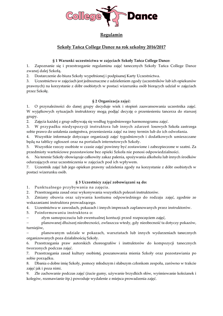 Regulamin Szkoły Tańca College Dance na rok szkolny 2016/2017