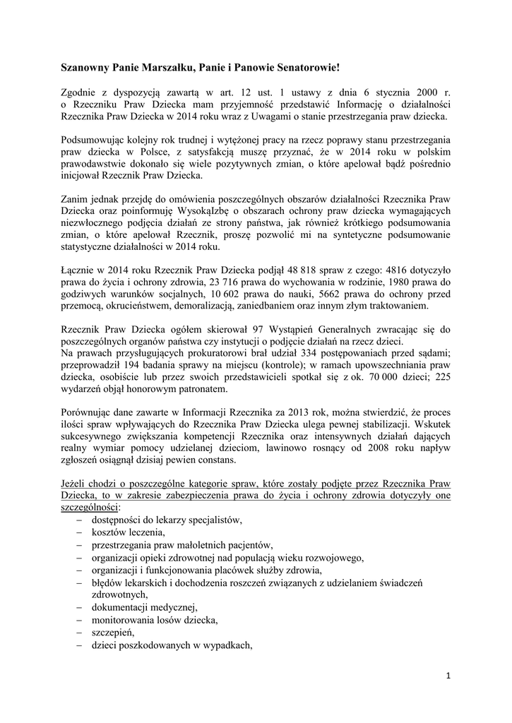 Szanowny Panie Marszałku, Panie i Panowie Senatorowie! Zgodnie z dyspozycją zawartą w art. 12 ust. 1 ustawy z dnia 6 stycznia 2000 r. o Rzeczniku Praw Dziecka mam przyjemność przedstawić Informację o działalności Rzecznika Praw Dziecka w 2014 roku wraz z Uwagami o stanie przestrzegania praw dziecka. Podsumowując kolejny rok trudnej i wytężonej pracy na rzecz poprawy stanu przestrzegania praw dziecka w Polsce, z satysfakcją muszę przyznać, że w 2014 roku w polskim prawodawstwie dokonało się wiele pozytywnych zmian, o które apelował bądź pośrednio inicjował Rzecznik Praw Dziecka. Zanim jednak przejdę do omówienia poszczególnych obszarów działalności Rzecznika Praw Dziecka oraz poinformuję WysokąIzbę o obszarach ochrony praw dziecka wymagających niezwłocznego podjęcia działań ze strony państwa, jak również krótkiego podsumowania zmian, o które apelował Rzecznik, proszę pozwolić mi na syntetyczne podsumowanie statystyczne działalności w 2014 roku. Łącznie w 2014 roku Rzecznik Praw Dziecka podjął 48 818 spraw z czego: 4816 dotyczyło prawa do życia i ochrony zdrowia, 23 716 prawa do wychowania w rodzinie, 1980 prawa do godziwych warunków socjalnych, 10 602 prawa do nauki, 5662 prawa do ochrony przed przemocą, okrucieństwem, demoralizacją, zaniedbaniem oraz innym złym traktowaniem. Rzecznik Praw Dziecka ogółem skierował 97 Wystąpień Generalnych zwracając się do poszczególnych organów państwa czy instytucji o podjęcie działań na rzecz dzieci. Na prawach przysługujących prokuratorowi brał udział 334 postępowaniach przed sądami; przeprowadził 194 badania sprawy na miejscu (kontrole); w ramach upowszechniania praw dziecka, osobiście lub przez swoich przedstawicieli spotkał się z ok. 70 000 dzieci; 225 wydarzeń objął honorowym patronatem. Porównując dane zawarte w Informacji Rzecznika za 2013 rok, można stwierdzić, że proces ilości spraw wpływających do Rzecznika Praw Dziecka ulega pewnej stabilizacji. Wskutek sukcesywnego zwiększania kompetencji Rzecznika oraz intensywnych działań dających realny wymiar pomocy udzielanej dzieciom, lawinowo rosnący od 2008 roku napływ zgłoszeń osiągnął dzisiaj pewien constans. Jeżeli chodzi o poszczególne kategorie spraw, które zostały podjęte przez Rzecznika Praw Dziecka, to w zakresie zabezpieczenia prawa do życia i ochrony zdrowia dotyczyły one szczególności: dostępności do lekarzy specjalistów, kosztów leczenia, przestrzegania praw małoletnich pacjentów, organizacji opieki zdrowotnej nad populacją wieku rozwojowego, organizacji i funkcjonowania placówek służby zdrowia, błędów lekarskich i dochodzenia roszczeń związanych z udzielaniem świadczeń zdrowotnych, dokumentacji medycznej, monitorowania losów dziecka, szczepień, dzieci poszkodowanych w wypadkach, 1 bezpieczeństwa na placach zabaw. Od wielu lat tradycyjnie już największa liczba spraw miała związek z prawem dziecka do wychowania w rodzinie. Podejmując czynności występowałem do organów i instytucji o podjęcie działań lub udzielenie informacji w sprawach dotyczących m.in.: postępowania o odebranie osoby podlegającej władzy rodzicielskiej lub pozostającej pod opieką, prawa dziecka do wychowywania i kontaktów z obojgiem rodziców, kwalifikowania kandydatów na rodziny zastępcze, nadzoru nad rodzinami zastępczymi, procedury wysłuchania małoletnich, wykonywania orzeczeń w zakresie umieszczania małoletnich w pieczy zastępczej, funkcjonowania placówek opiekuńczo–wychowawczych oraz ich współdziałania z innymi instytucjami na rzecz powrotu dziecka do środowiska rodzinnego, zapewnienia właściwej opieki wychowankom placówek opiekuńczo–wychowawczych i resocjalizacyjnych, skreślania wychowanków młodzieżowych ośrodków wychowawczych z list podopiecznych placówek opiekuńczo–wychowawczych, kontaktów i współpracy z rodziną biologiczną małoletnich umieszczonych w placówkach, stosowania niewłaściwych kar w placówkach opiekuńczo–wychowawczych, uprowadzeń rodzicielskich, jak również małoletnich cudzoziemców przebywających na terytorium Rzeczypospolitej Polskiej. Z zakresu ochrony dotyczyły głównie: prawa dziecka do godziwych warunków socjalnych, rent rodzinnych, świadczeń z pomocy społecznej, orzeczeń dotyczących niepełnosprawności, świadczeń rodzinnych, świadczeń z funduszu alimentacyjnego, problemów mieszkaniowych, w tym eksmisji oraz ochrony majątku dzieci. Dużą grupę stanowiły sprawy związane z ochrona prawa dziecka do nauki. Dotyczyły one: dowożenia dzieci do szkół i przedszkoli, w tym dzieci z niepełnosprawnościami, funkcjonowania w szkołach rady rodziców, konfliktów związanych z zachowaniem uczniów oraz współpracy szkoły z rodzicami, likwidacji lub reorganizacji szkół, organizacji uczniom pomocy psychologiczno–pedagogicznej oraz związanej z tym realizacji orzeczeń o potrzebie kształcenia specjalnego, rekrutacji dzieci do szkół i przedszkoli, 2 reorganizacji oddziałów i liczebności dzieci w oddziałach przedszkolnych i szkolnych, pobytu w żłobku, nierównego traktowania dzieci, dzienników elektronicznych w szkołach, zasad korzystania z telefonów komórkowych w szkołach, odroczenia obowiązku szkolnego, sześciolatków w szkołach, komisji dyscyplinarnych dla nauczycieli, oraz wypoczynku dzieci i młodzieży. Kolejną dużą grupę spraw były te zakwalifikowane jakozwiązanez prawem do ochrony przed przemocą okrucieństwem i innym złym traktowaniem. Dotyczyły one: przemocy seksualnej, przemocy rówieśniczej, zaniedbywania i przemocy w środowisku domowym, przemocy wobec dzieci w szkołach, przedszkolach, żłobkach oraz innych formach opieki, przemocy w rodzinnych i instytucjonalnych formach pieczy zastępczej, przemocy w placówkach o charakterze wychowawczym, socjoterapeutycznym, i resocjalizacyjnym, naruszania prawa do prywatności, rozpowszechniania w mediach, w ty