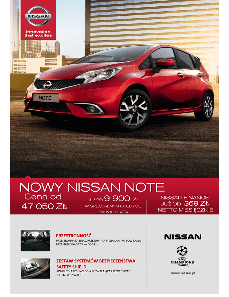 NOWY NISSAN NOTE Cena od 47 050 ZŁ JUŻ OD 9 900 ZŁ W SPECJALNYM KREDYCIE 0% NA 3 LATA NISSAN FINANCE JUŻ OD 369 ZŁ NETTO MIESIĘCZNIE PRZESTRONNOŚĆ PRZESTRONNA KABINA Z PRZESUWANĄ TYLNĄ KANAPĄ, POWIĘKSZA PRZESTRZEŃ BAGAŻNIKA DO 381 L. ZESTAW SYSTEMÓW BEZPIECZEŃSTWA SAFETY SHIELD KOMPLETNA TECHNOLOGIA POZWALAJĄCA PRZEWIDYWAĆ NIEPRZEWIDYWALNE www.nissan.pl JUŻ OD 9 900 ZŁ W SPECJALNYM KREDYCIE NISSAN FINANCE JUŻ OD 369 ZŁ NETTO MIESIĘCZNIE NOTE | CENNIK PROMOCYJNY 2016 VISIA ACENTA ACENTA PLUS 47 050 49 550 54 250 VISIA ACENTA ACENTA PLUS - 1 700 S - - 2 550 - 2 500 S - - 4 050 - - 1 000 Silnik benzynowy 1.2 l 59 kW (80 KM) - MT 4.7 l/100 km WYPOSAŻENIE OPCJONALNE Przyciemniane szyby Podłokietnik kierowcy i tylny Przesuwana tylna kanapa System aranżacji przestrzeni bagażowej Karakuri 3 tylne zagłówki Przednie i tylne szyby elektryczne Pakiet Rodzinny Nowy NissanConnect z 5.8" kolorowym wyświetlaczem dotykowym Gniazdo USB i MP3, iPod + 6 głośników Darmowa aktualizacja rocznego oprogramowania nawigacji przez 3 lata Nissan Connect Przednie reflektory przeciwmgłowe Automatyczna klimatyzacja Automatyczne światła i czujnik deszczu Pakiet Auto NissanConnect Kamera cofania Zestaw systemów bezpieczeństwa Safety Shield System inteligentnego kluczyka I-Key z przyciskiem Start/Stop Pakiet IT System inteligentnego kluczyka I-Key z przyciskiem Start/Stop 250 250 250 Lakier metalizowany 2 000 2 000 2 000 Lakier biały perłowy (QAB) 2 500 2 500 2 500 705 705 705 5 lat lub 100 000 km 1 460 1 460 1 460 5 lat lub 150 000 km 1 810 1 810 1 810 Koło zapasowe (dojazdowe) 4 lata lub 100 000 km Nissan 5★ Rozszerzona Gwarancja 3 S - Standard 1- Oferta dostępna tylko dla dealerów biorących udział w programie. 2 - Rabat 2 000 zł uwzględniony w cenach promocyjnych u dostęny u Dealerów biorących udział w promocji .| Dotyczy samochodów wyprodukowanych w 2016 roku. W celu zapoznania się ze szczegółami ofert odwiedź najbliższą placówkę dealerską 3 - Nissan 5★ Rozszerzona Gwarancja Umowa Ubezpieczenia Grupowego jest produktem ubezpieczeniowym; w celu uzyskania bliższych informacji prosimy zapoznać się z broszurą informacyjną oraz Ogólnymi Warunkami Ubezpieczenia dostępnymi u Autoryzowanych Dealerów. Kontrakty Rozszerzonej Gwarancji zawarte po 01/ 01/2016 nie obejmują usługi pomocy drogowej. JUŻ OD 9 900 ZŁ W SPECJALNYM KREDYCIE NISSAN FINANCE JUŻ OD 369 ZŁ NETTO MIESIĘCZNIE NOTE | CENNIK PODSTAWOWY - 2016 VISIA ACENTA ACENTA PLUS 49 050 51 550 56 250 VISIA ACENTA ACENTA PLUS - 1 700 S - - 2 550 - 2 500 S - - 4 050 - - 1 000 Silnik benzynowy 1.2 l 59 kW (80 KM) - MT 4.7 l/100 km WYPOSAŻENIE OPCJONALNE Przyciemniane szyby Podłokietnik kierowcy i tylny Przesuwana tylna kanapa System aranżacji przestrzeni bagażowej Karakuri 3 tylne zagłówki Przednie i tylne szyby elektryczne Pakiet Rodzinny Nowy NissanConnect z 5.8" kolorowym wyświetlaczem dotykowym Gniazdo USB i MP3, iPod + 6 głośników Darmowa aktualizacja rocznego oprogramowania nawigacji przez 3 lata Nissan Connect Przednie reflektory przeciwmgłowe Automatyczna klimatyzacja Automatyczne światła i czujnik deszczu Pakiet Auto NissanConnect Kamera cofania Zestaw systemów bezpieczeństwa Safety Shield System inteligentnego kluczyka I-Key z przyciskiem Start/Stop Pakiet IT System inteligentnego kluczyka I-Key z przyciskiem Start/Stop 250 250 250 Lakier metalizowany 2 000 2 000 2 000 Lakier biały perłowy (QAB) 2 500 2 500 2 500 705 705 705 5 lat lub 100 000 km 1 460 1 460 1 460 5 lat lub 150 000 km 1 810 1 810 1 810 Koło zapasowe (dojazdowe) 4 lata lub 100 000 km Nissan 5★ Rozszerzona Gwarancja 3 S - Standard 1- Oferta dostępna tylko dla dealerów biorących udział w programie. 2 - Rabat 2 000 zł uwzględniony w cenach promocyjnych u dostęny u Dealerów biorących udział w promocji .| Dotyczy samochodów wyprodukowanych w 2016 roku. W celu zapoznania się ze szczegółami ofert odwiedź najbliższą placówkę dealerską 3 - Nissan 5★ Rozszerzona Gwarancja Umowa Ubezpieczenia Grupowego jest produktem ubezpieczeniowym; w celu uzyskania bliższych informacji prosimy zapoznać się z broszurą informacyjną oraz Ogólnymi Warunkami Ubezpieczenia dostępnymi u Autoryzowanych Dealerów. Kontrakty Rozszerzonej Gwarancji zawarte po 01/ 01/2016 nie obejmują usługi pomocy drogowej. NOTE | WYPOSAŻENIE BEZPIECZEŃSTWO VISIA ACENTA ACENTA PLUS Przednie, czołowe poduszki powietrzne (kierowcy i pasażera) Przednie, boczne poduszki powietrzne Kurtynowe poduszki powietrzne Wyłącznik przedniej poduszki pasażera Trzypunktowe pasy bezpieczeństwa dla wszystkich miejsc Sygnalizator braku zapięcia pasów bezpieczeństwa kierowcy Punkty zaczepu fotelika dla dziecka ISOFIX przy tylnych zewnętrznych fotelach Zabezpieczenie drzwi tylnych przed otwarciem przez dzieci Regulacja położenia kolumny kierownicy ESP + ABS + BA Tempomat z funkcją ograniczenia prędkości Opony o niskich oporach toczenia Koło zapasowe (dojazdowe) Immobilizer WYGLĄD ZEWNĘTRZNY 15" stalowe felgi z kołpakami - 15" felgi ze stopów metali lekkich - - Chromowana obwódka wlotu powietrza Zderzaki w kolorze nadwozia Lusterka i klamki zewnętrzne w kolorze nadwozia - Reflektory do jazdy dziennej Tylne lampy w technologii LED Przednie reflektory przeciwmgłowe - P Lusterka zewnętrzne regulowane elektrycznie Lusterka zewnętrzne regulowane i podgrzewane + kierunkowskazy w technologii LED - Przyciemniane szyby - P - P - P WYGLĄD WNĘTRZA Klimatyzacja manualna z filtrem przeciwpyłkowym Automatyczna klimatyzacja - Elektrycznie regulowane szyby boczne z przodu Elektrycznie regulowane szyby boczne z przodu i z tyłu Komputer pokładowy Błyszczący panel centralny - Czarne klamki wewnętrzne - Chromowane klamki wewnętrzne - Regulacja wysokości fotela kierowcy - Podłokietnik kierowcy + podłokietnik tylny - Kierownica pokryta skórą ze sterowaniem tempomatem i ogranicznikiem predkości - - P Gniazdo 12V Przesuwana tylna k