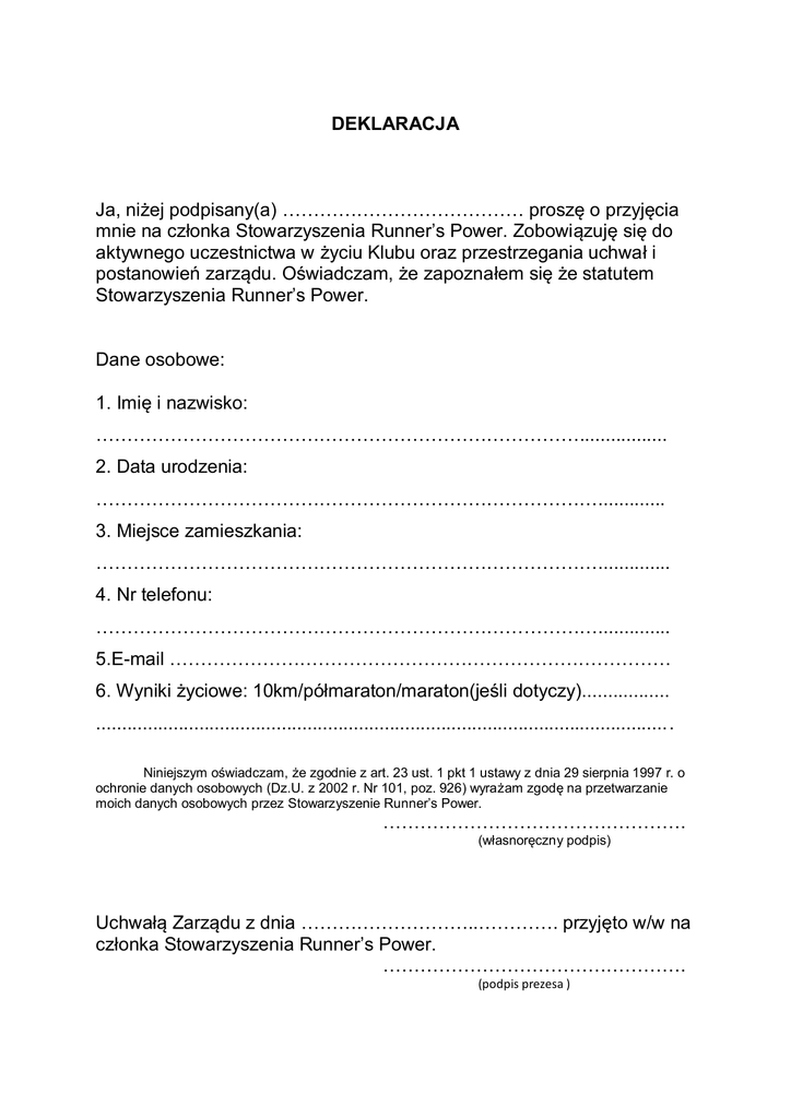 DEKLARACJA Ja, niżej podpisany(a) ………………………………… proszę o przyjęcia mnie na członka Stowarzyszenia Runner’s Power. Zobowiązuję się do aktywnego uczestnictwa w życiu Klubu oraz przestrzegania uchwał i postanowień zarządu. Oświadczam, że zapoznałem się że statutem Stowarzyszenia Runner’s Power. Dane osobowe: 1. Imię i nazwisko: ……………………………………………………………………................. 2. Data urodzenia: ………………………………………………………………………............. 3. Miejsce zamieszkania: ……………………………………………………………………….............. 4. Nr telefonu: ……………………………………………………………………….............. 5.E-mail ……………………………………………………………………… 6. Wyniki życiowe: 10km/półmaraton/maraton(jeśli dotyczy)................. ................................................................................................................ Niniejszym oświadczam, że zgodnie z art. 23 ust. 1 pkt 1 ustawy z dnia 29 sierpnia 1997 r. o ochronie danych osobowych (Dz.U. z 2002 r. Nr 101, poz. 926) wyrażam zgodę na przetwarzanie moich danych osobowych przez Stowarzyszenie Runner’s Power. …………………………………………. (własnoręczny podpis) Uchwałą Zarządu z dnia ………………………..…………. przyjęto w/w na członka Stowarzyszenia Runner’s Power. …………………………………………. (podpis prezesa )