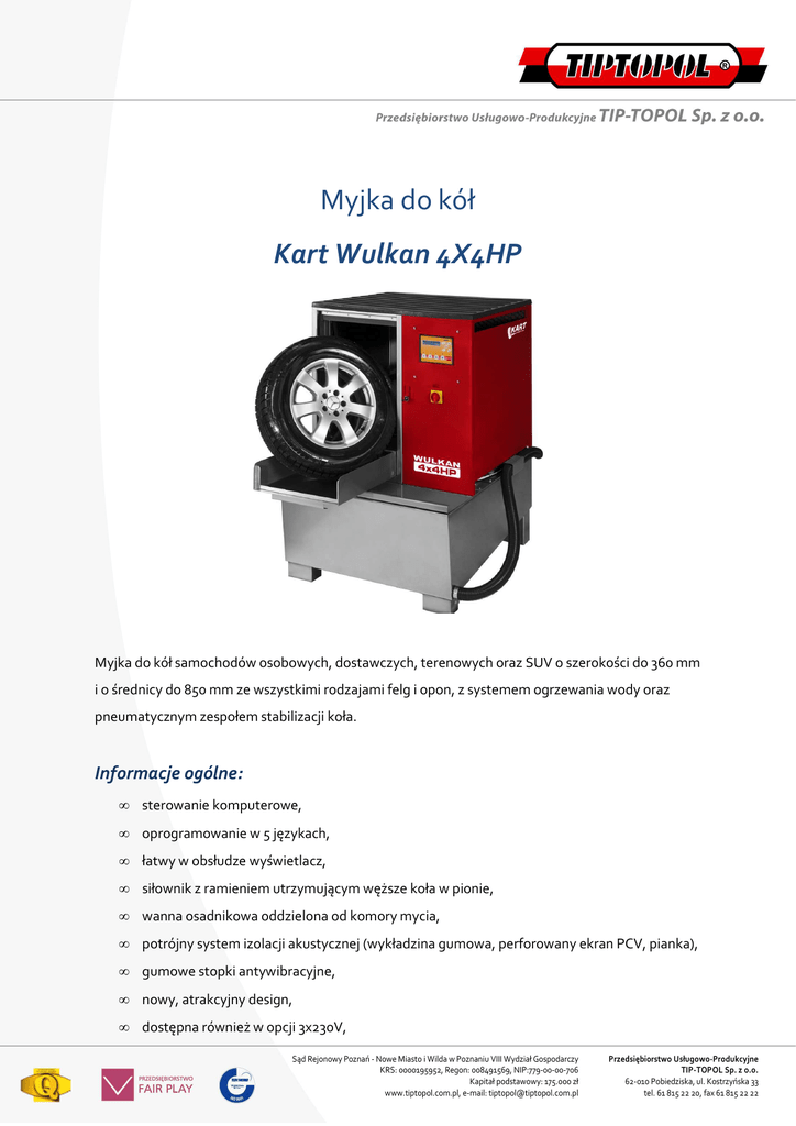 Myjka do kół Kart Wulkan 4X4HP Myjka do kół samochodów osobowych, dostawczych, terenowych oraz SUV o szerokości do 360 mm i o średnicy do 850 mm ze wszystkimi rodzajami felg i opon, z systemem ogrzewania wody oraz pneumatycznym zespołem stabilizacji koła. Informacje ogólne: • sterowanie komputerowe, • oprogramowanie w 5 językach, • łatwy w obsłudze wyświetlacz, • siłownik z ramieniem utrzymującym węższe koła w pionie, • wanna osadnikowa oddzielona od komory mycia, • potrójny system izolacji akustycznej (wykładzina gumowa, perforowany ekran PCV, pianka), • gumowe stopki antywibracyjne, • nowy, atrakcyjny design, • dostępna również w opcji 3x230V, Sąd Rejonowy Poznań - Nowe Miasto i Wilda w Poznaniu VIII Wydział Gospodarczy KRS: 0000195952, Regon: 008491569, NIP:779-00-00-706 Kapitał podstawowy: 175.000 zł www.tiptopol.com.pl, e-mail: [email protected] Przedsiębiorstwo Usługowo-Produkcyjne TIP-TOPOL Sp. z o.o. 62-010 Pobiedziska, ul. Kostrzyńska 33 tel. 61 815 22 20, fax 61 815 22 22 • wersja bez ogrzewania dostępna na zamówienie – model WULKAN 4x4P. Dane techniczne • Zakres średnicy koła 560 - 850 mm • Zakres szerokości koła 135 - 360 mm • Maksymalna waga koła 60 kg • Czas mycia ustawiony fabrycznie (regulowany, 3 programy) 20, 40, 60 s • Czas osuszania ustawiony fabrycznie (regulowany, 1 program) 15 s • Napęd pompy 3-fazowy, 400 V, 50 Hz, 5,5 kW 2900 obr / min • Wydajność pompy 600 l / min • Napęd koła 3-fazowy 400 V, 50 Hz, 0,37 kW 930 obr / min • Moc silników i napędu 6 kW • Ciśnienie wody 4 bar • Ilość wody 300 l • Ilość granulatu 20 kg • Ilość koncentratu myjącego WULKAN TURBO 3 l • Ciśnienie robocze sprężonego powietrza 8 - 12 bar • Poziom dźwięku mierzony z odległości 1 m 77,2 dB(A) • Poziom mocy akustycznej 87,1 dB(A) • Wymiary (szer. x głęb. x wys.) 900 x 1212 x 1450 mm • Waga 330 kg • Limit włączeń procesów mycia (blokada serwisowa) 500 włączeń Parametry ogrzewania: • moc grzałki - 4 kW • czas ogrzewania wody do 50°C: 60 - 120 min • blokada zabezpieczająca przed przegrzaniem Wyposażenie standardowe: • granulat 25 kg • kosz na granulat • koncentrat myjący WULKAN TURBO 30 l • górna pokrywa ochronna z tworzywa Sąd Rejonowy Poznań - Nowe Miasto i Wilda w Poznaniu VIII Wydział Gospodarczy KRS: 0000195952, Regon: 008491569, NIP:779-00-00-706 Kapitał podstawowy: 175.000 zł www.tiptopol.com.pl, e-mail: [email protected] Przedsiębiorstwo Usługowo-Produkcyjne TIP-TOPOL Sp. z o.o. 62-010 Pobiedziska, ul. Kostrzyńska 33 tel. 61 815 22 20, fax 61 815 22 22 • gumowa mata antypoślizgowa Sąd Rejonowy Poznań - Nowe Miasto i Wilda w Poznaniu VIII Wydział Gospodarczy KRS: 0000195952, Regon: 008491569, NIP:779-00-00-706 Kapitał podstawowy: 175.000 zł www.tiptopol.com.pl, e-mail: [email protected] Przedsiębiorstwo Usługowo-Produkcyjne TIP-TOPOL Sp. z o.o. 62-010 Pobiedziska, ul. Kostrzyńska 33 tel. 61 815 22 20, fax 61 815 22 22