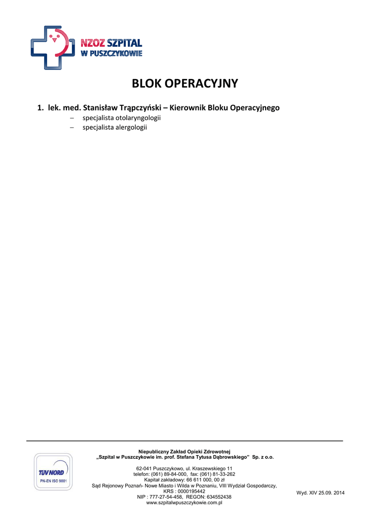 BLOK OPERACYJNY 1. lek. med. Stanisław Trąpczyński – Kierownik Bloku Operacyjnego − − specjalista otolaryngologii specjalista alergologii Niepubliczny Zakład Opieki Zdrowotnej „Szpital w Puszczykowie im. prof. Stefana Tytusa Dąbrowskiego” Sp. z o.o. 62-041 Puszczykowo, ul. Kraszewskiego 11 telefon: (061) 89-84-000, fax: (061) 81-33-262 Kapitał zakładowy: 66 611 000, 00 zł Sąd Rejonowy Poznań- Nowe Miasto i Wilda w Poznaniu, VIII Wydział Gospodarczy, KRS : 0000195442 NIP : 777-27-54-458, REGON: 634552438 www.szpitalwpuszczykowie.com.pl Wyd. XIV 25.09. 2014