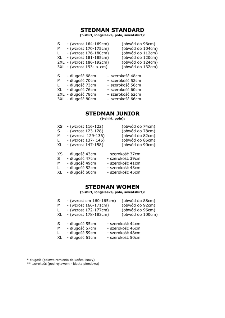 STEDMAN STANDARD (t-shirt, longsleeve, polo, sweatshirt): S M L XL 2XL 3XL - (wzrost (wzrost (wzrost (wzrost (wzrost (wzrost 164-169cm) 170-175cm) 176-180cm) 181-185cm) 186-192cm) 193- < cm) S M L XL 2XL 3XL - długość długość długość długość długość długość 68cm 70cm 73cm 76cm 78cm 80cm – – – – – – (obwód (obwód (obwód (obwód (obwód (obwód szerokość szerokość szerokość szerokość szerokość szerokość do do do do do do 96cm) 104cm) 112cm) 120cm) 124cm) 132cm) 48cm 52cm 56cm 60cm 62cm 66cm STEDMAN JUNIOR (t-shirt, polo): XS S M L XL - (wzrost (wzrost (wzrost (wzrost (wzrost 116-122) 123-128) 129-136) 137- 146) 147-158) XS S M L XL - długość długość długość długość długość 43cm 47cm 49cm 52cm 60cm (obwód (obwód (obwód (obwód (obwód - szerokość szerokość szerokość szerokość szerokość do do do do do 74cm) 78cm) 82cm) 86cm) 90cm) 37cm 39cm 41cm 43cm 45cm STEDMAN WOMEN (t-shirt, longsleeve, polo, sweatshirt): S M L XL - (wzrost (wzrost (wzrost (wzrost cm 160-165cm) 166-171cm) 172-177cm) 178-183cm) S M L XL - długość długość długość długość 55cm 57cm 59cm 61cm * długość (połowa ramienia do końca listwy) ** szerokość (pod rękawem - klatka piersiowa) - (obwód (obwód (obwód (obwód szerokość szerokość szerokość szerokość do do do do 44cm 46cm 48cm 50cm 88cm) 92cm) 96cm) 100cm)