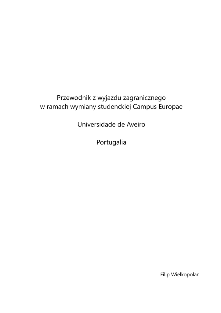 Przewodnik z wyjazdu zagranicznego w ramach wymiany studenckiej Campus Europae Universidade de Aveiro Portugalia Filip Wielkopolan Intro Wyjazd zagraniczny to wspaniałe doświadczenie wspominane z tęsknotą przez lata. Wiele osób patrzy na erasmusa z obawą, inni twierdzą że niczego do życia nie wnosi, natomiast wszyscy po powrocie marzą o przeżyciu tego jeszcze jeden raz i zgodnie mówią, że to najlepszy powód, żeby pójść na studia :) Jestem Filip, w 2012 roku wyjechałem na roczną wymianę do Aveiro w Portugalii i przedstawię tu krótko swoje doświadczenia, oraz zamieszczę możliwie dużo porad dla potomnych. Jeśli wiesz już, że jedziesz na Universidade de Aveiro – czeka cię najwspanialsza przygoda na studiach i powinieneś najwyżej przejrzeć wskazówki na końcu przewodnika! Jeśli jednak zastanawiasz się gdzie pojechać, to w pierwszej części materiału opiszę czemu portugalski uniwersytet to fantastyczny pomysł na wymianę . Destination Unknown Niektórzy mają z góry ustalony cel wyjazdu, ale większość z nas tak naprawdę nie wie gdzie chce pojechać i najczęściej powtarza pomysły znajomych. Studiowałem na IFE, kiedy z jakiegoś powodu było duże parcie na świetną uczelnię w Kopenhadze, DTU. Jeżeli masz wielkie ambicje naukowe i uważasz, że dobra uczelnia pomoże Ci w karierze to w porządku. Gdyby jednak cel Twojej wymiany nie był tak uściślony, to koniecznie weź pod uwagę Aveiro. Przed wyjazdem nie miałem pojęcia dokąd chciałbym wyjechać na wymianę. Po wielu przemyśleniach wiedziałem jedno – uciekać do cieplejszych, weselszych krajów. Za granicą czeka Cię najprawdopodobniej wiele pracy, jednak po powrocie ( również w trakcie ) nigdy się o tym nie pamięta. Dlatego czas wolny chciałem spędzić w słonecznej atmosferze, bez względu na to gdzie będę studiował. Najpierw moim celem była Hiszpania ( wcześniej uczyłem się hiszpańskiego ). Jednak wybór padł w końcu na Aveiro i była to najlepsza decyzja, jaką mogłem podjąć! Aveiro Aveiro to przepiękne miasto położone nad oceanem (!) między Porto ( ~70 km ), a stolicą Lizboną (~250 km ). Ze względu na niewielki rozmiar Portugalii, kraj bogaty jest w małe mieściny rozmiarów Aveiro, które jest trochę większe od Zgierza. Turyści znają miejscowość jako „Wenecję Portugalii”, a to za sprawą znajdujących się tu kanałów i pływających po nich gondolach. Aveiro to również zagłębie fabryk soli morskiej, koniecznie zobacz ciągle funkcjonujące tu Salinas gdzie sól zostaje odparowywana z wody morskiej. Dla Erasmusa oferta miasteczka jest znaaacznie bogatsza! Przede wszystkim plaża! Niestety nie znajduje się ona tak blisko, od morskich fal dzieli aż 10 km, dlatego każde wyjście na opalanie to maleńka wyprawa ( trzeba jednak poświęcić pół godziny na jazdę autobusem lub trochę dłużej rowerem – na piechotę raczej odpada ). Wiele osób poleca plaże południowej części Portugalii – Algarve. Moim zdaniem plaże Aveiro niewiele się różnią, jeśli nie są piękniejsze, a oferują o wiele bardziej swojski, mniej turystyczny klimat i przystępne ceny. Jeśli przyjeżdżasz do Aveiro, musisz spróbować surfingu! Są tu fantastyczne warunki - świetne fale ,wiele wypożyczalni sprzętu i przez większość roku mało ludzi na brzegu. Po powrocie do Polski nie ma co marzyć o takim surfowaniu, dlatego trzeba wykorzystać tę możliwość na maksa! Zaskoczeniem była dla mnie w Portugali kultura picia kawy ( tutejsza jest świetna, pewnie dzięki Amerykańskim koloniom ). Na kawę chodzą wszyscy i często, a kawiarnie oferują niesamowite bogactwo słodkich wypieków. Każde miasto ma swój przysmak. Aveiro słynie z lokalnych Ovos Moles de Aveiro. Portugalczycy lubią słodycze z masą z żółtka z jajek ( jest to niemal wszędzie ), która przypomina to kogel mogel. Ciasteczka z Aveiro, to uformowane w muszelki wafelki ( jak na opłatek ), pełne tego żółtego kremu. Można kupić je pojedyńczo za około 80 centów/sztuka, lub całe paczuszki 250g za 5 euro. Najważniejszym punktem w mieście jest Praca de Peixe ( rynek rybny ). Jest to piękny plac, z rybnym targiem na jego środku. Za dnia można kupić tam świeżutkie ryby i owoce morza ( prosto z oceanu ), jednak wieczorem budzi się na Pracie nocne życie. To tutaj znajduje się większość klubów i pubów. Do 2 w nocy uliczki są pełne ludzi – nikt nie siedzi w środku, każdy kupuje coś do picia i rozmawia z innymi na zewnątrz. Kluby wypełniają się dopiero około 3 w nocy, dlatego nigdy nie warto wychodzić za wcześnie, bo nie starcza sił na resztę nocy. :) Universidade de Aveiro Przed wyjazdem liczyłem, że Portugalia to będzie czas jedynie samych przyjemności. Okazuje się jednak, że studentów czeka tutaj niemało pracy. Uczelnia w Aveiro jest podobno najlepsza w Portugalii, a jej wydział Elektryczny należy do czołówki Europy. Wszystko to jednak nieistotne, bo najbardziej wymagające jest zupełnie inne podejście do uczniów niż w Polsce. Mój grafik był bardzo luźny, tylko kilka zajęć w wykorzystany. Niestety po kliku tygodniach okazuje wolnego. Należy włożyć bardzo, bardzo dużo pracy raportow na zaliczenie, a co gorsza, prowadzący nie radzi, lub czegoś nie skończył. tygodniu, a limit punktów ECTS szybko się, czemu studenci mają tak wiele czasu własnej, żeby opanować materiał. Nie ma zwrócą uwagi, jeśli ktoś sobie z czymś nie Nauczyciele są bardzo pomocni i świetnie mówią po angielsku, jednak koniecznie trzeba się zwracać do nich po pomoc. Jest tutaj bardzo dorosłe podejście do studenta – jeśli się nie przykładasz, nikt nie pogrozi Ci palcem, ani się nie ulituje, oblewają uczniów bez mrugnięcia okiem ( również erasmusów ). System oceniania jest dość rygorystyczny. Każdy przedmiot ma dwa mini testy w ciągu semestru ( w połowie i pod koniec ). Nie ma żadnych poprawek, a nie uzysk