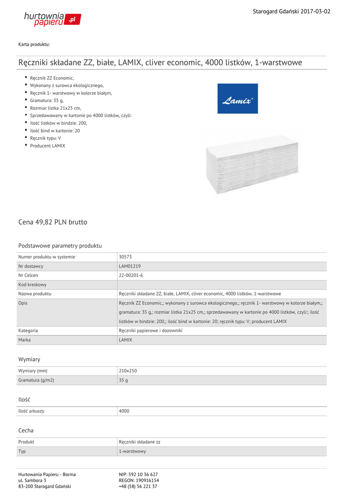 Starogard Gdański 2017-03-02 Karta produktu: Ręczniki składane ZZ, białe, LAMIX, cliver economic, 4000 listków, 1-warstwowe Ręcznik ZZ Economic, Wykonany z surowca ekologicznego, Ręcznik 1- warstwowy w kolorze białym, Gramatura: 35 g, Rozmiar listka 21x25 cm, Sprzedawawany w kartonie po 4000 listków, czyli: Ilość listków w bindzie: 200, Ilość bind w kartonie: 20 Ręcznik typu: V Producent LAMIX Cena 49,82 PLN brutto Podstawowe parametry produktu Numer produktu w systemie 30573 Nr dostawcy LAM01219 Nr Celcen 22-00201-6 Kod kreskowy Nazwa produktu Ręczniki składane ZZ, białe, LAMIX, cliver economic, 4000 listków, 1-warstwowe Opis Ręcznik ZZ Economic,; wykonany z surowca ekologicznego,; ręcznik 1- warstwowy w kolorze białym,; gramatura: 35 g,; rozmiar listka 21x25 cm,; sprzedawawany w kartonie po 4000 listków, czyli:; ilość listków w bindzie: 200,; ilość bind w kartonie: 20; ręcznik typu: V; producent LAMIX Kategoria Ręczniki papierowe i dozowniki Marka LAMIX Wymiary Wymiary (mm) 210x250 Gramatura (g/m2) 35 g Ilość Ilość arkuszy 4000 Cecha Produkt Ręczniki składane zz Typ 1-warstwowy Hurtowania Papieru - Borma ul. Sambora 3 83-200 Starogard Gdański NIP: 592 10 36 627 REGON: 190916154 +48 (58) 56 221 37 Starogard Gdański 2017-03-02 Karta katalogowa produktu cd. Ręczniki składane ZZ, białe, LAMIX, cliver economic, 4000 listków, 1-warstwowe Materiał Papier Certyfikaty Nowy produkt w ofercie Standard Hit Standard Kolor Kolor Biały Pozostałe zdjęcia produktu Serdecznie zapraszamy do współpracy Hurtowania Papieru - Borma zespół. Hurtowania Papieru - Borma ul. Sambora 3 83-200 Starogard Gdański NIP: 592 10 36 627 REGON: 190916154 +48 (58) 56 221 37