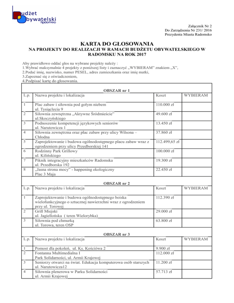 Załącznik Nr 2 Do Zarządzenia Nr 231/ 2016 Prezydenta Miasta Radomsko KARTA DO GŁOSOWANIA NA PROJEKTY DO REALIZACJI W RAMACH BUDŻETU OBYWATELSKIEGO W RADOMSKU NA ROK 2017 Aby prawidłowo oddać głos na wybrane projekty należy : 1.Wybrać maksymalnie 4 projekty z poniższej listy i zaznaczyć „WYBIERAM” znakiem „X”, 2.Podać imię, nazwisko, numer PESEL, adres zamieszkania oraz imię matki, 3.Zapoznać się z oświadczeniem, 4.Podpisać kartę do głosowania. OBSZAR nr 1 L.p. Nazwa projektu i lokalizacja Koszt 1 Plac zabaw i siłownia pod gołym niebem ul. Tysiąclecia 9 Siłownia zewnętrzna „Aktywne Śródmieście” ul.Skoczyńskiego Podnoszenie kompetencji językowych seniorów ul. Narutowicza 1 Siłownia zewnętrzna oraz plac zabaw przy ulicy Wilsona – Chłodna Zaprojektowanie i budowa ogólnodostępnego placu zabaw wraz z ogrodzeniem przy ulicy Przedborskiej 141 Rodzinny Park Grillowy ul. Kilińskiego Piknik integracyjny mieszkańców Radomska ul. Przedborska 192 „Jasna strona mocy” - happening ekologiczny Plac 3 Maja 110.000 zł 2 3 4 5 6 7 8 WYBIERAM 49.600 zł 13.450 zł 37.860 zł 112.499,65 zł 100.000 zł 19.300 zł 22.450 zł OBSZAR nr 2 L.p. Nazwa projektu i lokalizacja Koszt 1 Zaprojektowanie i budowa ogólnodostępnego boiska wielofunkcyjnego o sztucznej nawierzchni wraz z ogrodzeniem przy ul. Torowej Grill Miejski ul. Jagiellońska ( teren Wielorybka) Siłownia pod chmurką ul. Torowa, teren OSP 112.390 zł 2 3 WYBIERAM 29.000 zł 63.800 zł OBSZAR nr 3 L.p. Nazwa projektu i lokalizacja Koszt 1 2 Pomost dla pokoleń, ul. Ks. Kościówa 2 Fontanna Multimedialna I Park Solidarności, ul. Armii Krajowej Seniorzy otwarci na świat. Edukacja komputerowa osób starszych ul. Narutowicza12 Siłownia plenerowa w Parku Solidarności ul. Armii Krajowej 9.900 zł 112.000 zł 3 4 11.200 zł 57.713 zł WYBIERAM 5 Plac zabaw z zestawem urządzeń do ćwiczeń dla dorosłych ul. Śląska Rewitalizacja miejskiego placu zabaw zlokalizowanego przed budynkiem ul. Miła 6 Fontanna Multimedialna II Park Solidarności, ul. Armii Krajowej Montaż kamer monitoringu miejskiego placu zabaw i terenu rekreacyjnego, ul. Miła 6 6 7 8 112.301 zł 50.000zł 112.000 zł 30.000 zł OBSZAR nr 4 L.p. Nazwa projektu i lokalizacja Koszt 1 Kolorowy dziki zachód – plac zabaw dla dzieci z elementami siłowni dla dorosłych ul. Zachodnia, u zbiegu z ul. Inwestycyjną Boisko dla osiedla Miłaczki ul. Miłaczki 8 Siłownia plenerowa Bartodzieje ul. Nałkowskiej 1 Plac zabaw „Glinianki” wraz z siłownią zewnętrzną dla dorosłych ul. 11-go Listopada/Osiedlowa Kreatywny plac zabaw i rekreacji ul. Brzeźnicka 149, Plac rekreacji ruchowej – siłownia Brzeźnicka 149, Wolny czas spędzamy aktywnie, radośnie i zdrowo – świetlica rekreacyjna dla juniora i seniora, ul. Przemysłowa 15 Doposażenie Ochotniczej Straży Pożarnej Bogwidzowy ul. Przemysłowa 15 Plac zabaw Bartodzieje Podleśne ul. Batalionów Chłopskich 104 112.200 zł 2 3 4 5 6 7 8 9 WYBIERAM 56.718 zł 110.000 zł 112.500 zł 106.900 zł 107.600 zł 55.804 zł 39.397 zł 110.000 zł DANE GŁOSUJĄCEGO Imię i nazwisko Adres zamieszkania (ulica i numer domu, mieszkania) Nr PESEL Imię matki OŚWIADCZENIE Oświadczam, że jestem mieszkańcem/mieszkanką miasta Radomsko, mam ukończone 16 lat i wyrażam zgodę na przetwarzanie moich danych osobowych dla potrzeb niezbędnych do realizacji procedury Budżetu Obywatelskiego, zgodnie z ustawą z dnia 29 sierpnia 1997 roku o ochronie danych osobowych (Dz.U. 2014r., poz.1182). ………………………………….. czytelny podpis osoby głosującej (nie dotyczy głosowania elektronicznego) DLA OSÓB NIEPEŁNOLETNICH Załączam zgodę opiekuna prawnego na udział w procesie Budżetu Obywatelskiego w Radomsku. (W przypadku głosowania elektronicznego zgodę opiekuna należy dostarczyć osobiście do Urzędu Miasta Radomska lub zeskanowaną wysłać na adres mailowy: [email protected]). ……………………………….