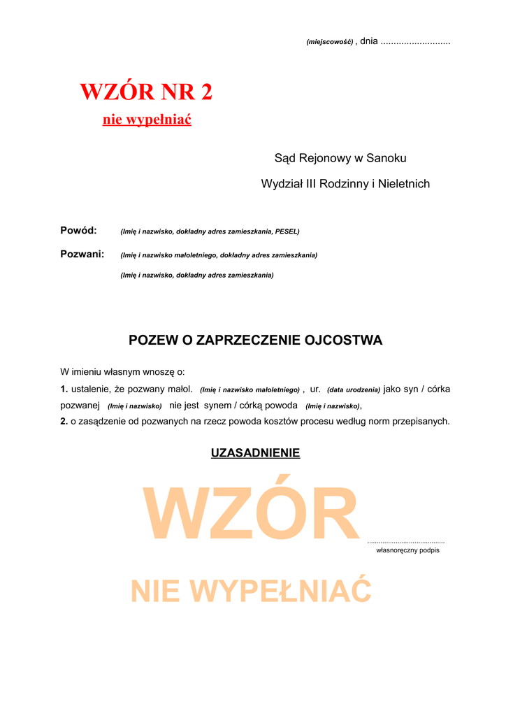 (miejscowość) , dnia ........................... WZÓR NR 2 nie wypełniać Sąd Rejonowy w Sanoku Wydział III Rodzinny i Nieletnich Powód: (Imię i nazwisko, dokładny adres zamieszkania, PESEL) Pozwani: (Imię i nazwisko małoletniego, dokładny adres zamieszkania) (Imię i nazwisko, dokładny adres zamieszkania) POZEW O ZAPRZECZENIE OJCOSTWA W imieniu własnym wnoszę o: 1. ustalenie, że pozwany małol. pozwanej (Imię i nazwisko) (Imię i nazwisko małoletniego) nie jest synem / córką powoda , ur. (data urodzenia) jako syn / córka (Imię i nazwisko), 2. o zasądzenie od pozwanych na rzecz powoda kosztów procesu według norm przepisanych. UZASADNIENIE WZÓR ......................................... własnoręczny podpis NIE WYPEŁNIAĆ Załączniki: 1) 2) 3) 4) odpis pozwu w 3 egz. ; odpis zupełny aktu urodzenia małoletniego dziecka; odpis skrócony aktu małżeństwa; zaświadczenie o dochodach powoda. Opłata stała od pozwu wynosi 200 zł