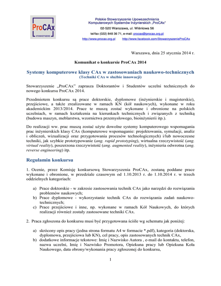 Warszawa, dnia 25 stycznia 2014 r. Komunikat o konkursie ProCAx 2014 Systemy komputerowe klasy CAx w zastosowaniach naukowo-technicznych (Techniki CAx w służbie innowacji) Stowarzyszenie „ProCAx” zaprasza Doktorantów i Studentów uczelni technicznych do nowego konkursu ProCAx 2014. Przedmiotem konkursu są prace doktorskie, dyplomowe (inżynierskie i magisterskie), przejściowe, a także zrealizowane w ramach KN (kół naukowych), wykonane w roku akademickim 2013/2014. Prace te muszą zostać wykonane i obronione na polskich uczelniach, w ramach kształcenia na kierunkach technicznych i związanych z techniką (budowa maszyn, meblarstwa, wzornictwa przemysłowego, bioinżynierii itp.). Do realizacji ww. prac muszą zostać użyte dowolne systemy komputerowego wspomagania prac inżynierskich klasy CAx (komputerowe wspomaganie: projektowania, symulacji, analiz i obliczeń, wizualizacji oraz przygotowania procesów technologicznych) i/lub nowoczesne techniki, jak szybkie prototypowanie (ang. rapid prototyping), wirtualna rzeczywistość (ang. virtual reality), poszerzona rzeczywistość (ang. augmented reality), inżynieria odwrotna (ang. reverse engineering) itp. Regulamin konkursu 1. Ocenie, przez Komisję konkursową Stowarzyszenia ProCAx, zostaną poddane prace wykonane i obronione, w przedziale czasowym od 1.10.2013 r. do 1.10.2014 r. w trzech oddzielnych kategoriach: a) Prace doktorskie - w zakresie zastosowania technik CAx jako narzędzi do rozwiązania problemów naukowych; b) Prace dyplomowe - wykorzystanie technik CAx do rozwiązania zadań naukowotechnicznych; c) Prace przejściowe i inne, np. wykonane w ramach Kół Naukowych, do których realizacji również zostały zastosowane techniki CAx. 2. Praca zgłoszona do konkursu musi być przygotowana ściśle wg schematu jak poniżej: a) skrócony opis pracy (jedna strona formatu A4 w formacie *.pdf), kategoria (doktorska, dyplomowa, przejściowa lub KN), cel pracy, opis zastosowanych technik CAx, b) dodatkowe informacje tekstowe: Imię i Nazwisko Autora , e-mail do kontaktu, telefon, nazwa uczelni, Imię i Nazwisko Promotora, Opiekuna pracy lub Opiekuna Koła Naukowego, data obrony/wykonania pracy zgłoszonej do konkursu, 1 c) rezultaty w postaci modeli wirtualnych, reprezentowanych w formatach neutralnych (*.STEP, *.IGES, *.DXF, *.parasolid) lub animacje i filmy zapisane w formatach *.avi lub *.mov. d) wymienione w pkt. a, b, c elementy muszą być zapisane na płycie CD, DVD lub pamięci USB, które należy wysłać na adres Stowarzyszenia. 3. Termin nadsyłania prac: do 1 października 2014 r. (decyduje data stempla pocztowego); 4. Jeden Autor może zgłosić tylko jedną pracę (mile widziane także prace zespołowe - dwuosobowe; 5. Autorzy trzech najlepszych prac w każdej kategorii zostaną zaproszeni (na koszt organizatorów, 2 dni, w tym zakwaterowanie) do udziału w I Międzynarodowym Kongresie CAx Innovation w terminie 14-16.10.2014 r. w Krakowie i będą mogli przygotować PLAKAT oraz przedstawić swoje osiągnięcia w formie prezentacji multimedialnej i publikacji w czasopiśmie MECHANIK, a także otrzymać CERTYFIKAT UMIEJĘTNOŚCI CAx. 6. Jury konkursowe, zaproszone przez Zarząd ProCAx, ogłosi ostateczne wyniki na stronie www.procax.org.pl w dniu 6.10.2014 r. Decyzja Jury będzie ostateczna. Zapraszamy do czynnego udziału w konkursie. Liczymy na innowacyjne i niekonwencjonalne prace! Zarząd Stowarzyszenia „ProCAx” KRS: 0000077983, Stowarzyszenie ProCAx ma status OPP 2