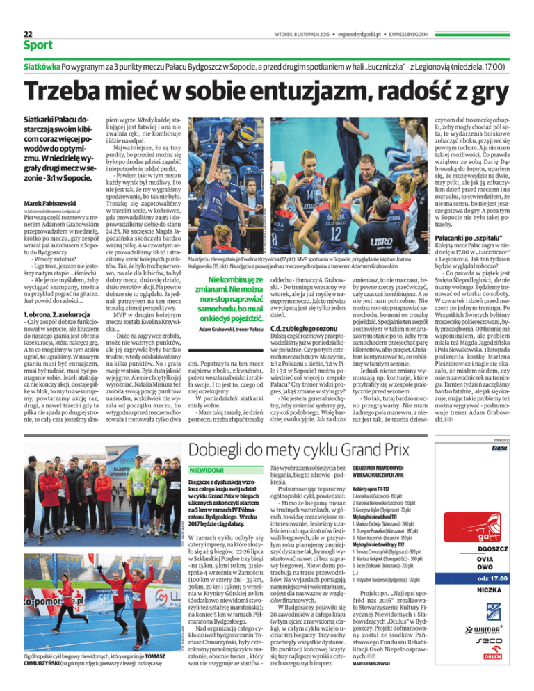 22 WTOREK, 8 LISTOPADA 2016 Sport a expressbydgoski.pl a EXPRESS BYDGOSKI Siatkówka Po wygranym za 3 punkty meczu Pałacu Bydgoszcz w Sopocie, a przed drugim spotkaniem w hali „Łuczniczka” - z Legionovią (niedziela, 17.00) Marek Fabiszewski [email protected] Pierwszą część rozmowy z trenerem Adamem Grabowskim przeprowadziłem w niedzielę, krótko po meczu, gdy zespół wracał już autobusem z Sopotu do Bydgoszczy. - Wesoły autobus? - Liga trwa, jeszcze nie jesteśmy na tym etapie... (śmiech). - Ale je nie myślałem, żeby wyciągać szampany, można na przykład pograć na gitarze. Jest powód do radości... 1. obrona, 2. asekuracja - Cały zespół dobrze funkcjonował w Sopocie, ale kluczem do naszego grania jest obrona i asekuracja, która nakręca grę. A to co mogliśmy w tym ataku ugrać, to ugraliśmy. W naszym graniu musi być entuzjazm, musi być radość, musi być pomaganie sobie. Jeżeli atakująca nie kończy akcji, dostaje piłkę w blok, to my to asekurujemy, powtarzamy akcję raz, drugi, a nawet trzeci i gdy ta piłka nie spada po drugiej stronie, to cały czas jesteśmy sku- pieni w grze. Wtedy każdej atakującej jest łatwiej i ona nie zwalnia ręki, nie kombinuje i idzie na odpał. Najważniejsze, że są trzy punkty, bo przecież można się było po drodze gdzieś zagubić i niepotrzebnie oddać punkt. - Powiem tak: w tym meczu każdy wynik był możliwy. I to nie jest tak, że my wygraliśmy spodziewanie, bo tak nie było. Troszkę się zagotowaliśmy w trzecim secie, w końcówce, gdy prowadziliśmy 24:19 i doprowadziliśmy siebie do stanu 24:23. Na szczęście Magda Jagodzińska skończyła bardzo ważną piłkę. A w czwartym secie prowadziliśmy 18:10 i straciliśmy sześć kolejnych punktów. Tak, że było trochę nerwowo, no ale dla kibiców, to był dobry mecz, dużo się działo, dużo zwrotów akcji. Na pewno dobrze się to oglądało. Ja jednak patrzyłem na ten mecz troszkę z innej perspektywy. MVP w drugim kolejnym meczu została Ewelina Krzywicka… - Dużo na zagrywce zrobiła, może nie ważnych punktów, ale jej zagrywki były bardzo trudne, wtedy odskakiwaliśmy na kilka punktów. No i grała swoje w ataku. Była duża jakość w jej grze. Ale nie chcę tylko jej wyróżniać. Natalia Misiuna też zrobiła swoją porcję punktów na środku, aczkolwiek nie wyszła od początku meczu, bo w tygodniu przed meczem chorowała i trenowała tylko dwa FOT. PRZEMYSŁAW ŚWIDERSKI Siatkarki Pałacu dostarczają swoim kibicom coraz więcej powodów do optymizmu. W niedzielę wygrały drugi mecz w sezonie - 3:1 w Sopocie. FOT. PRZEMYSŁAW ŚWIDERSKI Trzeba mieć w sobie entuzjazm, radość z gry Na zdjeciu z lewej atakuje Ewelina Krzywicka (17 pkt), MVP spotkania w Sopocie, przygląda się kapitan Joanna Kuligowska (15 pkt). Na zdjęciu z prawej jedna z meczowych odpraw z trenerem Adamem Grabowskim Nie kombinuję ze zmianami. Nie można non-stop naprawiać samochodu, bo musi on kiedyś pojeździć. Adam Grabowski, trener Pałacu dni. Popatrzyła na ten mecz najpierw z boku, z kwadratu, potem weszła na boisko i zrobiła swoje. I to jest to, czego od niej oczekujemy. W poniedziałek siatkarki miały wolne. - Mam taką zasadę, że dzień po meczu trzeba złapać troszkę oddechu - tłumaczy A. Grabowski. - Do treningu wracamy we wtorek, ale ja już myślę o następnym meczu. Jak to mówią: zwycięzcą jest się tylko jeden dzień. C.d. z ubiegłego sezonu Dalszą część rozmowy przeprowadziliśmy już w poniedziałkowe południe. Czy po tych czterech meczach (1:3 w Muszynie, 1:3 z Policami u siebie, 3:1 w Pile i 3:1 w Sopocie) można powiedzieć coś więcej o zespole Pałacu? Czy trener widzi progres, jakąś zmianę w stylu gry? - Nie jestem generalnie chętny, żeby zmieniać systemy gry, czy coś podobnego. Wolę bardziej ewolucyjnie. Jak za dużo zmieniasz, to nie ma czasu, żeby pewne rzeczy przećwiczyć, cały czas coś kombinujesz. A to nie jest nam potrzebne. Nie można non-stop naprawiać samochodu, bo musi on troszkę pojeździć. Specjalnie ten zespół zostawiłem w takim nienaruszonym stanie po to, żeby tym samochodem przejechać parę kilometrów, albo paręset. Chciałem kontynuować to, co robiliśmy w tamtym sezonie. Jednak nieraz zmiany wymuszają np. kontuzje, które przytrafiły się w zespole praktycznie przed sezonem. - No tak, tutaj bardzo mocno przegrywamy. Nie mam żadnego pola manewru, a nieraz jest tak, że trzeba dziew- Dobiegli do mety cyklu Grand Prix FOT. NADESŁANE FOT. NADESŁANE NIEWIDOMI Og ólnopolski cykl biegowy niewidomych, który organizuje TOMASZ CHMURZYŃSKI (na górnym zdjęciu pierwszy z lewej), rozkręca się Biegacze z dysfunkcją wzroku z całego kraju swój udział w cyklu Grand Prix w biegach ulicznych zakończyli startem na 5 km w ramach IV Półmaratonu Bydgoskiego . W roku 2017 będzie ciąg dalszy. W ramach cyklu odbyły się cztery imprezy, na które złożyło się aż 9 biegów. 22-26 lipca w Szklarskiej Porębie trzy biegi - na 15 km, 5 km i 10 km; 31 sierpnia-4 września w Zamościu (100 km w cztery dni - 35 km, 30 km, 20 km i 15 km); 9 września w Krynicy Górskiej 10 km (dodatkowo niewidomi stworzyli też sztafetę maratońską); na koniec 5 km w ramach Półmaratonu Bydgoskiego. Nad organizacją całego cyklu czuwał bydgoszczanin Tomasz Chmurzyński, były czterokrotny paraolimpijczyk w maratonie, obecnie trener , który sam nie rezygnuje ze startów. - Nie wyobrażam sobie życia bez biegania, bieg to zdrowie - podkreśla. Podsumowując tegoroczny ogólnopolski cykl, powiedział: - Mimo że biegamy nieraz w trudnych warunkach, w górach, to widzę coraz większe zainteresowanie. Jesteśmy uzależnieni od organizatorów festiwali biegowych, ale w przyszłym roku planujemy zmniejszyć dystanse tak, by mogli wystartować nawet ci bez zaprawy biegowej. Niewidomi potrzebują na trasie przewodników. Na wyjazdach pomagają nam miejscowi i wolontariusze, co jest dla nas ważne ze w