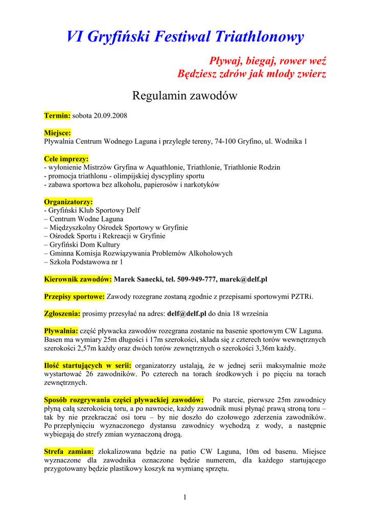 VI Gryfiński Festiwal Triathlonowy Pływaj, biegaj, rower weź Będziesz zdrów jak młody zwierz Regulamin zawodów Termin: sobota 20.09.2008 Miejsce: Pływalnia Centrum Wodnego Laguna i przyległe tereny, 74-100 Gryfino, ul. Wodnika 1 Cele imprezy: - wyłonienie Mistrzów Gryfina w Aquathlonie, Triathlonie, Triathlonie Rodzin - promocja triathlonu - olimpijskiej dyscypliny sportu - zabawa sportowa bez alkoholu, papierosów i narkotyków Organizatorzy: - Gryfiński Klub Sportowy Delf – Centrum Wodne Laguna – Międzyszkolny Ośrodek Sportowy w Gryfinie – Ośrodek Sportu i Rekreacji w Gryfinie – Gryfiński Dom Kultury – Gminna Komisja Rozwiązywania Problemów Alkoholowych – Szkoła Podstawowa nr 1 Kierownik zawodów: Marek Sanecki, tel. 509-949-777, [email protected] Przepisy sportowe: Zawody rozegrane zostaną zgodnie z przepisami sportowymi PZTRi. Zgłoszenia: prosimy przesyłać na adres: [email protected] do dnia 18 września Pływalnia: część pływacka zawodów rozegrana zostanie na basenie sportowym CW Laguna. Basen ma wymiary 25m długości i 17m szerokości, składa się z czterech torów wewnętrznych szerokości 2,57m kaŜdy oraz dwóch torów zewnętrznych o szerokości 3,36m kaŜdy. Ilość startujących w serii: organizatorzy ustalają, Ŝe w jednej serii maksymalnie moŜe wystartować 26 zawodników. Po czterech na torach środkowych i po pięciu na torach zewnętrznych. Sposób rozgrywania części pływackiej zawodów: Po starcie, pierwsze 25m zawodnicy płyną całą szerokością toru, a po nawrocie, kaŜdy zawodnik musi płynąć prawą stroną toru – tak by nie przekraczać osi toru – by nie doszło do czołowego zderzenia zawodników. Po przepłynięciu wyznaczonego dystansu zawodnicy wychodzą z wody, a następnie wybiegają do strefy zmian wyznaczoną drogą. Strefa zamian: zlokalizowana będzie na patio CW Laguna, 10m od basenu. Miejsce wyznaczone dla zawodnika oznaczone będzie numerem, dla kaŜdego startującego przygotowany będzie plastikowy koszyk na wymianę sprzętu. 1 Trasa biegowa: w części trawiasta, w część pokryta płytami betonowymi. Ma kształt litery W zasadzie jest to trasa płaska, z dwoma kilkumetrowymi zbiegami i jednym podbiegiem. P Trasa rowerowa: Pętla licząca 1500m +/-10m. PodłoŜe trasy jest w częściach: trawiaste, leśne, asfaltowe, z kostki polbrukowej. Jest to bardzo ciekawa, urozmaicona trasa, wymagająca dobrej techniki jazdy. Na kaŜdym okrąŜeniu znajduje się podjazd długości około 100m, a zaraz po nim, krótki ostry zjazd. Ilość startujących w konkurencji: W przypadku zgłoszenia do danej konkurencji większej ilości zawodników niŜ zakładana maksymalna ilość zawodników w danej serii to jest 26, organizator dokona podziału zawodników na serie. W takim przypadku o zwycięstwie i kolejnych miejscach zadecydują czasy jakie zawodnicy uzyskali na mecie. Potencjalna zmiana programu minutowego: W przypadku zgłoszenia się do któregoś ze startów większej ilości zawodników niŜ maksymalna moŜliwa ilość startujących w serii – 26, organizator dokona stosownych zmian w programie minutowym. Pomiar czasu: przeprowadzony zostanie stoperami ręcznymi z wyliczeniem czasu: - pływania (pomiar od startu do wybiegnięcia z basenu – 10m od linii końcowej pływania) - I-ego pobytu w strefie zmian wraz jazdą rowerową i II-im pobytem w strefie zmian - biegu - końcowego Komunikat z zawodów: w dniu zawodów ogłoszone zostaną miejsca i czasy końcowe uzyskane przez poszczególnych zawodników. Oficjalny, końcowy komunikat z zestawieniem czasów z poszczególnych części zawodów (aquathlonu, triathlonu) zamieszczony zostanie na stronie klubowej www.delf.pl i stronie PZTri www.triathlon.pl Program zawodów: 9.00 – 11.00 Zapisy, weryfikacja wcześniej dokonanych zgłoszeń, „opisywanie” zawodników, biuro zawodów przy CW Laguna 11.00 – otwarcie zawodów 11.10 – start klas I-III SP w Aquathlonie 50m pływania – 300m biegu 11.15 – 13.15 Konkursy sprawnościowe 11.30 – start Triathlonu - Szkoły Podstawowe: 100m – 3,0km – 500m 12.00 - start Gimnazjum w Triathlonie: 200m – 4,5km - 1000m 12.30 – start Open: 300m – 7,5km – 1500m 13.15 – start Triathlonu Rodzinnego: 50m – 3,0km – 500m 13.45 - dekoracja najlepszych zawodników w konkursach sprawnościowych, - dekoracja najlepszych rodzin w triathlonie rodzin - rozlosowanie nagród indywidualnych wśród uczestników zawodów aquathlonowych i triathlonowych (według numerów startowych) Wprowadzanie i wyjmowanie rowerów do i ze strefy zmian: strefa będzie strzeŜona, rowery moŜna będzie wprowadzać i wyjmować wyłącznie zawodnikom na podstawie posiadanych numerów startowych w okresach gdy w strefie nie będzie zawodników biorących udział w aktualnym wyścigu. 2 Ilość nagradzanych: - Aquathlon Kl. I – III: po trzech zawodników z kaŜdej klasy – Triathlon Kl. IV-VI SP: po sześć dziewcząt i sześciu chłopców - Triathlon Gimnazjum: po sześć dziewcząt i sześciu chłopców – Triathlon Open: po sześć kobiet i sześciu męŜczyzn – Triathlon Rodzin: trzy najlepsze rodziny + jedna nagroda do losowania spośród pozostałych druŜyn. – 10 nagród do rozlosowania spośród wszystkich uczestników Aquathlonu i Triathlonu – konkursy sprawnościowe: trzech najlepszych w konkursie Rodzaje nagród: medale za miejsca I - III atrakcyjne nagrody rzeczowe łączna pula nagród wyniesie nie mniej niŜ 5000 zł Dekoracje: - Dekoracje najlepszych zawodników w poszczególnych wyścigach przeprowadzane będą bezpośrednio po ukończeniu rywalizacji przez ostatniego uczestnika z danej grupy. - Opłaty startowe: Organizatorzy nie pobierają opłaty startowej Konkursy sprawnościowe: Przeprowadzonych zostanie V konkursów sprawnościowych: - skok w dal z miejsca. – bieg 4 x 10m z przenoszeniem kostek – rzuty piłeczkami palantowymi do celu (dwadzieścia piłeczek) – podbijanie piłki głową – najw