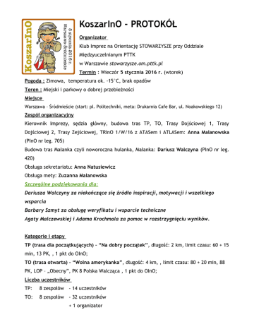 KoszarInO - PROTOKÓŁ Organizator Klub Imprez na Orientację STOWARZYSZE przy Oddziale Międzyuczelnianym PTTK w Warszawie stowarzysze.om.pttk.pl Termin : Wieczór 5 stycznia 2016 r. (wtorek) Pogoda : Zimowa, temperatura ok. -15°C, brak opadów Teren : Miejski i parkowy o dobrej przebieżnosci Miejsce Warszawa – Śródmieście (start: pl. Politechniki, meta: Drukarnia Cafe Bar, ul. Noakowskiego 12) Zespół organizacyjny Kierownik Imprezy, sędzia główny, budowa tras TP, TO, Trasy Dojsciowej 1, Trasy Dojściowej 2, Trasy Zejściowej, TRInO 1/W/16 z ATASem i ATLASem: Anna Malanowska (PInO nr leg. 705) Budowa tras Małanka czyli noworoczna hulanka, Małanka: Dariusz Walczyna (PInO nr leg. 420) Obsługa sekretariatu: Anna Natusiewicz Obsługa mety: Zuzanna Malanowska Szczególne podziękowania dla: Dariusza Walczyny za niekończące się źródło inspiracji, motywacji i wszelkiego wsparcia Barbary Szmyt za obsługę weryfikatu i wsparcie techniczne Agaty Malczewskiej i Adama Krochmala za pomoc w rozstrzygnięciu wyników. Kategorie i etapy TP (trasa dla początkujących) – “Na dobry początek”, długość: 2 km, limit czasu: 60 + 15 min, 13 PK, , 1 pkt do OInO; TO (trasa otwarta) – “Wolna amerykanka”, długość: 4 km, , limit czasu: 80 + 20 min, 88 PK, LOP – „Obecny”, PK 8 Polska Walcząca , 1 pkt do OInO; Liczba uczestników TP: 8 zespołów - 14 uczestników TO: 8 zespołów - 32 uczestników + 1 organizator RAZEM: 46 osób w tym młodzieży szkolnej: 6 W poszczególnych kategoriach zwyciężyli: TP – Jacek Piekarski (Brwinów) TO – Jolanta Witusik-Kamińska i Maciej Kamiński (Leśne Dziady), Gosia Antosik i Paweł Konieczny (Klub InO STOWARZYSZE/ Kraków), Renata Łaska i Dariusz Mazurek (Wytrzeszczona z Zagubionym), Agata Malczewska Adam Krochmal (UNTS Warszawa), Barbara Szmyt i Dariusz Walczyna (Klub InO STOWARZYSZE), Paweł Rozwadowski i Mariusz Góraj (Stowarzysze na Skróty), Jack Bauer A.K.A. Anna Natusiewicz (Klub InO STOWARZYSZE ), Anna Morawska i Łukasz Lech (Zagubione Owieczki) Trasa Dojściowa 1: Tomasz Gronau, Jolanta Witusik-Kamińska i Maciej Kamiński (Leśne Dziady), Ryszard Wilk, Kasia i Ania Kadłubowskie, Barbara Szmyt, Dariusz Walczyna, Dariusz Mazurek (Daro Zagubiony), Sławomir Otap, Adam Ciołek, Magdalena Senderowska, Szymon Bijak, Monika Sokołowska, Przemysław Gawroński, Andrzej Krochmal, Renata Łaska, Gosia Antosik, Paweł Konieczny, Konrad Janowski (GSMnO Wyjątkowi), Karolina Pacek, Jacek Piekarski (Brwinów), Mariusz Góraj (KInO „SKRÓTY“ Radom), Marcin Szost, Paweł Rozwadowski, Mariusz Siwiec, Zuanna Malanowska. Trasa Dojściowa 2: Tomasz Gronau, Kasia i Ania Kadłubowskie, Barbara Szmyt, Dariusz Walczyna, Sławomir Otap, Adam Ciołek, Magdalena Senderowska, Szymon Bijak Andrzej Krochmal, Renata Łaska, Karolina Pacek, Jacek Piekarski (Brwinów), Mariusz Góraj (KInO „SKRÓTY“ Radom), Marcin Szost, Paweł Rozwadowski, Mariusz Siwiec, Zuanna Malanowska, Maciej Majewski, Maciej Łukaszewicz, Jakub Hoły, Jan Brandys, Adam Hoły, Krzysztof Hoły, Krzysztof Markiewicz, Zuzanna Dąbek. Trasa Zejściowa: Przemysław Gawroński i Monika Sokołowska, Sławomir Otap, Tomasz Gronau, Jolanta Witusik-Kamińska i Maciej Kamiński (Leśne Dziady), Karolina Pacek, Mariusz Góraj, Andrzej Krochmal, Barbara Szmyt, Dariusz Walczyna, Gosia Antosik, Paweł Konieczny, Adam Ciołek, Magdalena Senderowska. Gratulujemy! WYNIKI Trasa TP Msc Imię i Nazwisko . Nazwa Zespołu 1. Jacek Piekarski Brwinów 2. Konrad Janowski GSMnO "Wyjątkowi" Drużyna Kapitana Tymcia Marcin Szost 3. Sławomir Otap PS ZM OP PM Czas BPK (25 (10 (10 (30 Zad. [t1+t1 (90) ) ) ) ) 0] X1 10 X1 25 X1 25 Sum a 12 12 5 15 0 25 4. 5. 6. Jakub Hoły, Jan Brandys, Elżbieta Hoły, Adam Hoły, Krzysztof Hoły Marek Drągowski Zuzanna Malanowska Anna Bigdowska Michał Muszyński i Bartosz Mrozicki 1.1 0.2 002 STEFANY 0 50 0 50 0 205 6 686 50 X2 X2 50 X1 180 25 X7 X2 630 50 Ok! Sport 156 i 414 Trasa TO Msc . Imię i Nazwisko 1 Jolanta WitusikKamińska Maciej Kamiński Gosia Antosik Paweł Konieczny BPK PS Nazwa Zespołu (90) (25) PM (30) Czas Zad [t1+t10 . ] Leśne Dziady Klub InO STOWARZYSZE/ Kraków Wytrzeszczona z Zagubionym Renata Łaska Dariusz Mazurek Agata Malczewska Adam Krochmal UNTS Warszawa A.K.A. Franciszek Dolas Barbara Szmyt Klub InO Dariusz Walczyna STOWARZYSZE Paweł Rozwadowski Stowarzysze na Mariusz Góraj Skróty Jack Bauer A.K.A. Klub InO Anna Natusiewicz STOWARZYSZE Anna Morawska Zagubione Łukasz Lech Owieczki Σ 0 0 0 0 0 0 0 0 0 0 0 0 0 0 0 0 PS OPI ZM PM Czas (25 S (10 (30 Zad. [t1+t1 ) (10) ) ) 0] 2. Karolina Pacek 3. Mariusz Siwiec 4. Ania Kadłubowska Klub InO STOWARZYSZE Zimno Mi 3 1 1 0 3 5 5 Karolina 5. 6. 6. Szymon Bijak Maciej Majewski Maciej Łukasiewicz Monika Sokołowska Przemysław Gawroński 7. Magdalena Senderowska Adam Ciołek 8. Ewa Misiaczek 9. 10. 11 12. 8 BambInO 0 8 0 10 0 10 8 16 3 28 13 40 X1 DezorientInO Warszawa 10 10 Zawsze Ostatni Różowe Puchate Jednorożce Tańczące na Tęczy Galeria Warszawa Andrzej HKT PTTK "TREP" Krochmal Krzysztof Markiewicz 156 i 414 Zuzanna Dąbek Tomasz Gronau Mateusz Wiącek 156 i 414 Łukasz Grygiel 8 X1 25 27 X4 40 0 37 X1 25 X1 10 40 15 52 20+18 235