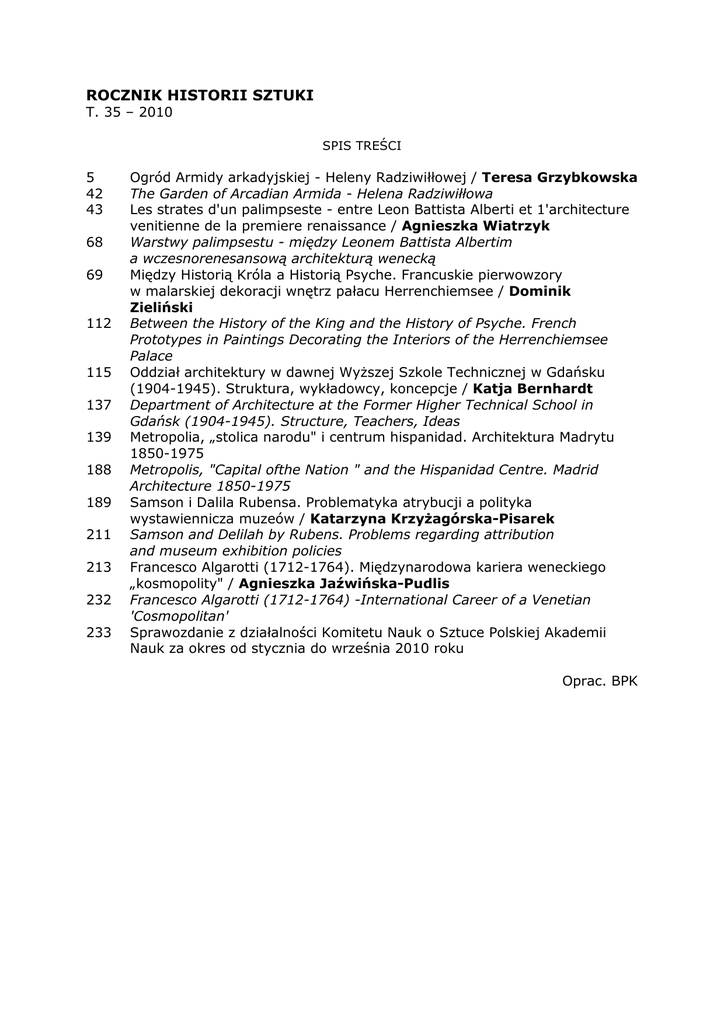 ROCZNIK HISTORII SZTUKI T. 35 – 2010 SPIS TREŚCI 5 42 43 68 69 112 115 137 139 188 189 211 213 232 233 Ogród Armidy arkadyjskiej - Heleny Radziwiłłowej / Teresa Grzybkowska The Garden of Arcadian Armida - Helena Radziwiłłowa Les strates d'un palimpseste - entre Leon Battista Alberti et 1'architecture venitienne de la premiere renaissance / Agnieszka Wiatrzyk Warstwy palimpsestu - między Leonem Battista Albertim a wczesnorenesansową architekturą wenecką Między Historią Króla a Historią Psyche. Francuskie pierwowzory w malarskiej dekoracji wnętrz pałacu Herrenchiemsee / Dominik Zieliński Between the History of the King and the History of Psyche. French Prototypes in Paintings Decorating the Interiors of the Herrenchiemsee Palace Oddział architektury w dawnej WyŜszej Szkole Technicznej w Gdańsku (1904-1945). Struktura, wykładowcy, koncepcje / Katja Bernhardt Department of Architecture at the Former Higher Technical School in Gdańsk (1904-1945). Structure, Teachers, Ideas Metropolia, „stolica narodu" i centrum hispanidad. Architektura Madrytu 1850-1975 Metropolis, "Capital ofthe Nation " and the Hispanidad Centre. Madrid Architecture 1850-1975 Samson i Dalila Rubensa. Problematyka atrybucji a polityka wystawiennicza muzeów / Katarzyna KrzyŜagórska-Pisarek Samson and Delilah by Rubens. Problems regarding attribution and museum exhibition policies Francesco Algarotti (1712-1764). Międzynarodowa kariera weneckiego „kosmopolity" / Agnieszka Jaźwińska-Pudlis Francesco Algarotti (1712-1764) -International Career of a Venetian 'Cosmopolitan' Sprawozdanie z działalności Komitetu Nauk o Sztuce Polskiej Akademii Nauk za okres od stycznia do września 2010 roku Oprac. BPK