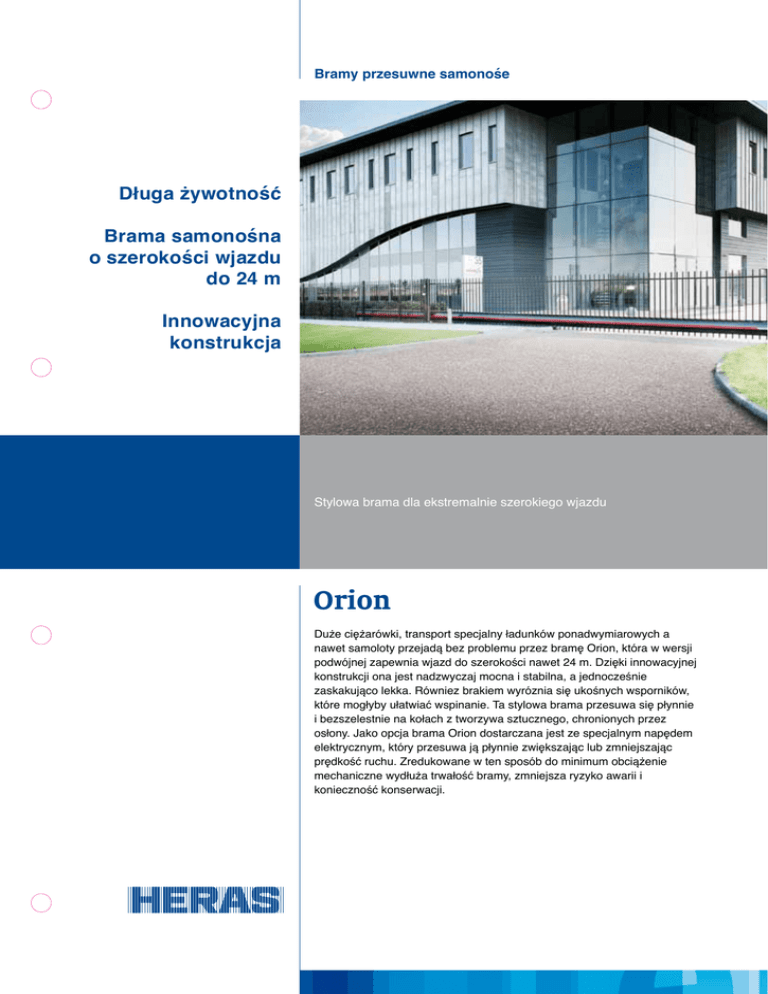 Bramy przesuwne samonośe Długa żywotność Brama samonośna o szerokości wjazdu do 24 m Innowacyjna konstrukcja Stylowa brama dla ekstremalnie szerokiego wjazdu Orion Duże ciężarówki, transport specjalny ładunków ponadwymiarowych a nawet samoloty przejadą bez problemu przez bramę Orion, która w wersji podwójnej zapewnia wjazd do szerokości nawet 24 m. Dzięki innowacyjnej konstrukcji ona jest nadzwyczaj mocna i stabilna, a jednocześnie zaskakująco lekka. Równiez brakiem wyróznia się ukośnych wsporników, które mogłyby ułatwiać wspinanie. Ta stylowa brama przesuwa się płynnie i bezszelestnie na kołach z tworzywa sztucznego, chronionych przez osłony. Jako opcja brama Orion dostarczana jest ze specjalnym napędem elektrycznym, który przesuwa ją płynnie zwiększając lub zmniejszając prędkość ruchu. Zredukowane w ten sposób do minimum obciążenie mechaniczne wydłuża trwałość bramy, zmniejsza ryzyko awarii i konieczność konserwacji. Fundament Szyna prowadząca Zamek Portal najazdowy Specyfikacja techniczna Typ Wysokość bramy Szerokość w świetle Zapotrzebowanie miejsca Orion 100/200 2.000 9.700 23.900 Orion 110/200 2.000 10.700 26.250 Brama pojedyncza Orion 100/250 Orion 110/250 Orion 120/200 Orion 120/250 Brama podwójna 2.500 2.500 2.000 2.500 9.700 23.900 10.700 26.250 11.750 28.650 11.750 28.650 Orion 100100/200 2.000 19.750 49.100 Orion 110100/200 2.000 20.750 51.500 Orion 100100/250 Orion 110100/250 Orion 110110/200 Orion 110110/250 Orion 120100/200 Orion 120100/250 Orion 120110/200 Orion 120110/250 Orion 120120/200 Orion 120120/250 2.500 2.500 2.000 2.500 2.000 2.500 2.000 2.500 2.000 2.500 19.750 49.100 20.750 51.500 21.750 53.850 21.750 53.850 21.750 53.850 21.750 53.850 22.750 56.200 22.750 56.200 23.800 58.600 23.800 58.600 Wymiary w mm Powłoki Przed malowaniem części ocynkowane i aluminiowe zostają najpierw dokładnie przygotowane. Następnie nanosi się na nie metodą elektrostatyczną lakier proszkowy. Tak pokryte elementy wygrzewa się w piecu w temperaturze 210 °C, w Wykonanie standardowe •wyniku Zabezpieczenie przed nagłym zamknięciem prowadnícy czego uzyskuje się trwałą powłokęi lub ochronną o słupka (w wersji obsługiwanej ręcznie) grubości średnio 80 μm i twardości 80 w skali Buchholza. • Napęd ręczny lub elektryczny • Możliwość połączenia z każdym rodzajem ogrodzenia • Dwie złączone, sprężone strunami belki dolne • Belka dolna jest wykonana ze stali cynkowanej ogniowo i pokrytej trwałą powłoką PCW • Koła toczne z tworzywa sztucznego zamontowane są na dwóch specjalnych słupkach prowadzących skrzydło bramy • Koła chronione są osłoną • Szczebelki są przeprowadzone przez belkę i mocowane drutem • Dostępne w wersjach Heracles, Atlas i Pegasus • Wysokość bramy 2 000 i 2 500 mm • Szerokość w świetle 9 700 - 23 800 mm Heras B.V. Heras International Hekdam 1 NL-5688 JE Oirschot The Netherlands www.heras.pl P.O. Box 30 NL-5688 ZG Oirschot The Netherlands T +48 22 844 20 88 [email protected] Oferta może podlegać zmianom technicznym. © Heras 216797 Kolorystyka • Wersja ocynkowana lub malowana proszkowo. Standardowe pokrycie powłoką w kolorach RAL 6005 (zielony mech), RAL 6009 (zielony jodłowy), RAL 6014 (oliwkowy żółty – kolor „Heras”), RAL 7016 (szary antracytowy), RAL 7030 (szary kamienny), RAL 9005 (czarny) i RAL 9010 (biały alpejski). • Kolory RAL 9006 i RAL 9007 są dostępne w kilku wariantach, dlatego przy zamówieniu (za dopłatą) należy koniecznie podać dodatkowy kod „wariantu” koloru. • Pozostałe kolory RAL na życzenie.