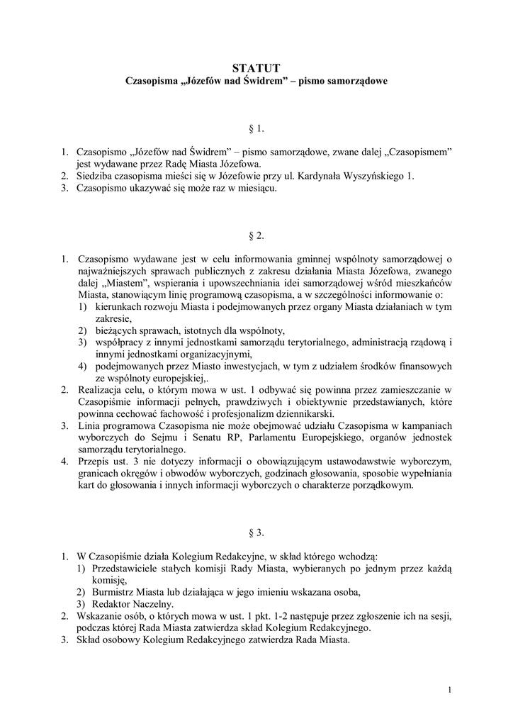 STATUT Czasopisma „Józefów nad Świdrem” – pismo samorządowe § 1. 1. Czasopismo „Józefów nad Świdrem” – pismo samorządowe, zwane dalej „Czasopismem” jest wydawane przez Radę Miasta Józefowa. 2. Siedziba czasopisma mieści się w Józefowie przy ul. Kardynała Wyszyńskiego 1. 3. Czasopismo ukazywać się może raz w miesiącu. § 2. 1. Czasopismo wydawane jest w celu informowania gminnej wspólnoty samorządowej o najważniejszych sprawach publicznych z zakresu działania Miasta Józefowa, zwanego dalej „Miastem”, wspierania i upowszechniania idei samorządowej wśród mieszkańców Miasta, stanowiącym linię programową czasopisma, a w szczególności informowanie o: 1) kierunkach rozwoju Miasta i podejmowanych przez organy Miasta działaniach w tym zakresie, 2) bieżących sprawach, istotnych dla wspólnoty, 3) współpracy z innymi jednostkami samorządu terytorialnego, administracją rządową i innymi jednostkami organizacyjnymi, 4) podejmowanych przez Miasto inwestycjach, w tym z udziałem środków finansowych ze wspólnoty europejskiej,. 2. Realizacja celu, o którym mowa w ust. 1 odbywać się powinna przez zamieszczanie w Czasopiśmie informacji pełnych, prawdziwych i obiektywnie przedstawianych, które powinna cechować fachowość i profesjonalizm dziennikarski. 3. Linia programowa Czasopisma nie może obejmować udziału Czasopisma w kampaniach wyborczych do Sejmu i Senatu RP, Parlamentu Europejskiego, organów jednostek samorządu terytorialnego. 4. Przepis ust. 3 nie dotyczy informacji o obowiązującym ustawodawstwie wyborczym, granicach okręgów i obwodów wyborczych, godzinach głosowania, sposobie wypełniania kart do głosowania i innych informacji wyborczych o charakterze porządkowym. § 3. 1. W Czasopiśmie działa Kolegium Redakcyjne, w skład którego wchodzą: 1) Przedstawiciele stałych komisji Rady Miasta, wybieranych po jednym przez każdą komisję, 2) Burmistrz Miasta lub działająca w jego imieniu wskazana osoba, 3) Redaktor Naczelny. 2. Wskazanie osób, o których mowa w ust. 1 pkt. 1-2 następuje przez zgłoszenie ich na sesji, podczas której Rada Miasta zatwierdza skład Kolegium Redakcyjnego. 3. Skład osobowy Kolegium Redakcyjnego zatwierdza Rada Miasta. 1 4. Do zakresu działania Kolegium Redakcyjnego należy: 1) realizacja linii programowej Czasopisma, celów i zadań, o których mowa w § 1 Statutu, 2) określanie kierunków informacji i publicystyki Czasopisma, 3) ustalanie i zatwierdzanie stałych rubryk Czasopisma, 4) wnioskowanie do Rady Miasta w sprawach o: a) zmiany w Statucie Czasopisma, b) powołanie Redaktora Naczelnego Czasopisma, 5) zatwierdzanie poszczególnych numerów Czasopisma. 5. Kolegium Redakcyjnemu przewodniczy Przewodniczący Kolegium Redakcyjnego, wyłaniany z grona Kolegium Redakcyjnego. 6. Do zadań przewodniczącego Kolegium Redakcyjnego czasopisma należy zwoływanie posiedzeń, organizowanie pracy i prowadzenie obrad Kolegium Redakcyjnego. 7. Kolegium Redakcyjne podejmuje decyzje bezwzględną większością głosów w obecności co najmniej trzech członków Kolegium Redakcyjnego. 8. Pod nieobecność Przewodniczącego Kolegium Redakcyjnego, jego obradom przewodniczy członek Kolegium redakcyjnego, wybrany spośród obecnych na posiedzeniu. § 4. 1. Czasopismem kieruje Redaktor Naczelny. 2. Redaktora Naczelnego powołuje i odwołuje Rada Miasta, na wniosek Kolegium Redakcyjnego, bądź podmiotów wymienionych w § 55 ust. 1 Statutu Miasta Józefowa. Powołanie następuje po uprzednim przeprowadzeniu konkursu ofert. Powołanie nie jest nawiązaniem stosunku zatrudnienia redaktora naczelnego. 3. Zasady postępowania konkursowego, warunki, jakie powinien spełnić kandydat na Redaktora Naczelnego i tryb wyłaniania kandydata na Redaktora Naczelnego określi regulamin postępowania konkursowego. 4. Burmistrz Miasta po zasięgnięciu opinii Kolegium Redakcyjnego: 1) ustala regulamin postępowania konkursowego, 2) przeprowadza konkurs ofert, 3) zatrudnia Redaktora Naczelnego Czasopisma, po uprzednim powołaniu go przez Radę Miasta, określając w umowie warunki, co do przedmiotu zatrudnienia, jak i warunki finansowe. § 5. 1. Do podstawowych zadań Redaktora Naczelnego Czasopisma należy: 1) kierowanie gazetą i reprezentowanie jej na zewnątrz, 2) przygotowywanie materiałów prasowych, 3) właściwe gospodarowanie mieniem gazety i przyznanymi na jej funkcjonowanie środkami finansowymi, 4) zwoływanie, co najmniej raz w miesiącu lub w miarę potrzeb spotkania zespołu redakcyjnego z udziałem wszystkich osób zatrudnionych w Czasopiśmie., 5) zatwierdzanie materiałów prasowych do publikacji, 2 6) wnioskowanie o zatrudnienie w Czasopiśmie dziennikarzy, wraz z propozycją warunków co do przedmiotu, jak i warunków zatrudnienia, 7) dbałość o poprawność języka publikowanych w Czasopiśmie materiałów prasowych oraz przeciwdziałanie jego wulgaryzacji, 8) egzekwowanie przez zatrudnionych w Czasopiśmie dziennikarzy przestrzegania prawa prasowego i zasad etyki dziennikarskiej. 2. Szczegółowy zakres obowiązków Redaktora Naczelnego określa Burmistrz Miasta w umowie, o której mowa w § 4 ust. 4 pkt. 3. 3. Redaktor Naczelny Czasopisma ponosi osobistą służbową i materialną odpowiedzialność za treść publikowanych w Czasopiśmie materiałów prasowych oraz za sprawy finansowe i redakcyjne. § 6. Działalność Czasopisma finansowana jest w ramach planu finansowego Urzędu Miasta i wpływów z reklam. § 7. Burmistrz Miasta określi organizację i zasady na jakich oparta będzie gospodarka środkami finansowymi przeznaczonymi na działalność Czasopisma, w szczególności dotyczące zatrudniania dziennikarzy, zawierania umów i ich treści, rozliczeń finansowych za wykonane materiały prasowe, druk i kolportaż Czasopisma. 3