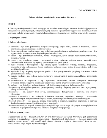 ZAŁĄCZNIK NR 1 Zakres wiedzy i umiejętności oraz wykaz literatury ETAP I I Obszary umiejętności: Uczeń posługuje się w miarę rozwiniętym zasobem środków językowych (leksykalnych, gramatycznych, ortograficznych), rozumie i przetwarza wypowiedzi pisemne, dobiera poprawne reakcje w typowych sytuacjach komunikacyjnych oraz tworzy krótkie wypowiedzi pisemne. II Wymagane treści: 1. Zakres leksykalny: 1) człowiek - np. dane personalne, wygląd zewnętrzny, części ciała, ubrania i akcesoria, cechy charakteru, uczucia i emocje, zainteresowania; 2) dom – np. miejsce zamieszkania, jego położenie, rodzaje domów, opis domu, pomieszczenia i ich wyposażenie, wynajmowanie, kupno i sprzedaż mieszkania; 3) szkoła – np. przedmioty nauczania, oceny i wymagania, życie szkoły, kształcenie pozaszkolne, system oświaty; 4) praca – np. popularne zawody i czynności z nimi związane, miejsca pracy, warunki pracy i zatrudnienia, ubieganie się o pracę, praca dorywcza, rynek pracy; 5) życie rodzinne i towarzyskie – np. okresy życia, członkowie rodziny, koledzy, przyjaciele, czynności życia codziennego, formy spędzania wolnego czasu, święta i uroczystości, styl życia, konflikty i problemy; 6) żywienie – np. artykuły spożywcze, posiłki i ich przygotowanie, przybory kuchenne, lokale gastronomiczne, diety; 7) zakupy i usługi – np. rodzaje sklepów, towary, sprzedawanie i kupowanie, reklama, korzystanie z usług; 8) podróżowanie i turystyka – np. wycieczki, zwiedzanie, środki transportu, orientacja w terenie, baza noclegowa, informacja turystyczna, nazwy krajów i kontynentów, wypadki; 9) kultura – np. dziedziny kultury, twórcy i ich dzieła, uczestnictwo w kulturze, media; 10) sport – np. dyscypliny sportowe, sprzęt sportowy, obiekty i imprezy sportowe, sport wyczynowy, sporty ekstremalne; 11) zdrowie – np. zdrowy tryb życia, samopoczucie, dolegliwości i choroby, ich objawy i leczenie; 12) nauka i technika – np. odkrycia i badania naukowe, wynalazki, obsługa i korzystanie z podstawowych urządzeń technicznych, awarie, technologie informacyjno-komunikacyjne; 13) świat przyrody – np. pogoda, klimat, świat roślin i zwierząt, krajobraz, zagrożenie i ochrona środowiska naturalnego, klęski żywiołowe, katastrofy; 14) elementy wiedzy o krajach obszaru języka angielskiego oraz o kraju ojczystym, z uwzględnieniem kontekstu międzykulturowego oraz tematyki integracji europejskiej; 2. Zakres gramatyczny: 1) czasownik: ‘to be’ – Present and Past (w tym there is/are/was/were); Have/have got; czasowniki regularne i nieregularne; formy czasownika - bezokolicznik (Infinitive) i Gerund; czasowniki modalne - must, mustn’t, will, would, shall, should, shouldn’t, ought to, have to/don’t have to, can, could, needn’t, may, might; tryb rozkazujący; 2) czasy gramatyczne (zdania twierdzące, pytające, przeczące): Present Simple, Present Continuous, Past Simple, Past Continuous, Present Perfect Simple, Present Perfect Continuous, Future Simple, Future Continuous, Past Perfect Simple, Past Perfect Continuous, to be going to; 3) question tags; 4) rzeczownik: liczba pojedyncza i mnoga (regularna, nieregularna), rzeczowniki policzalne i niepoliczalne; Genetive ‘s (l.poj. i l.mn.); 5) przedimek: nieokreślony, określony oraz brak przedimka; 6) określniki: any, some, many, much, a lot of, lots of, a couple of, (a) little, (a) few; 7) liczebnik: liczebniki główne i porządkowe; 8) przymiotnik i przysłówek: stopniowanie przymiotników i przysłówków, przymiotniki dzierżawcze; too, not enough, so, such; konstrukcje porównawcze; szyk przymiotników w zdaniu; przysłówki częstotliwości, czasu, miejsca, stopnia, sposobu; tworzenie przysłówków od przymiotników, przymiotniki złożone (np. blue-eyed); 9) przyimek: przyimki miejsca, czasu, ruchu, celu; wyrażenia przyimkowe; 10) spójnik: and, but, or, as, because, so, unless, while, when; although, though, however, despite; 11) zaimek: zaimki wskazujące; zaimki osobowe w formie podmiotu i w formie dopełnienia; zaimki nieokreślone; zaimki dzierżawcze; zaimki pytające oraz each other, one another, others, the other, another; 12) okresy warunkowe: 0 Conditional, 1st Conditional, 2nd Conditional; 13) zdania czasowe; 14) zdania przydawkowe: defining and non-defining relative clauses; 15) następstwo czasów i mowa zależna - Reported Speech; 16) strona bierna - Passive Voice; 17) słowotwórstwo: wyrazy złożone, najważniejsze przedrostki i przyrostki, tworzenie przymiotników, czasowników, rzeczowników, itp. 3. Zakres realioznawczy: The United Kingdom of Great Britain and Northern Ireland General information; Geography; Symbols and icons of the UK; Famous cities and places worth visiting. II ETAP I Obszary umiejętności: Uczeń posługuje się w miarę rozwiniętym zasobem środków językowych (leksykalnych, gramatycznych, ortograficznych), przetwarza wypowiedź pisemną, rozumie tekst pisany, poprawnie reaguje w typowych sytuacjach komunikacyjnych. II Wymagane treści: Takie same jak w etapie pierwszym oraz dodatkowo: 1. Zakres leksykalny: 1) zakupy i usługi – środki płatnicze, metody płacenia, usługi bankowe i ubezpieczenia; 2) zdrowie – uzależnienia, niepełnosprawni, ochrona zdrowia; 3) świat przyrody – przestrzeń kosmiczna; 4) państwo i społeczeństwo – struktura państwa, organizacje społeczne i międzynarodowe, konflikty wewnętrzne i międzynarodowe, konflikty i problemy społeczne, przestępczość, polityka społeczna, religie; 5) słownictwo związane ze sposobami chodzenia, patrzenia, mówienia, etc; 6) słownictwo związane z wydawaniem dźwięków, emitowaniem światła; 7) przysłowia. 2. Zakres gramatyczny: 1) czasownik: czasownik + bezokolicznik, czasownik + gerund, czasowniki posiłkowe z so i neither/ nor (inwersja), konstrukcje imiesłowowe, czasowniki modalne + have + imiesłów bierny; 2) rzeczownik: rodzaj rzeczownika, rzeczowniki złoż