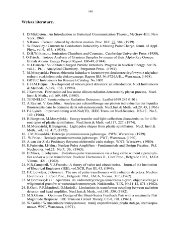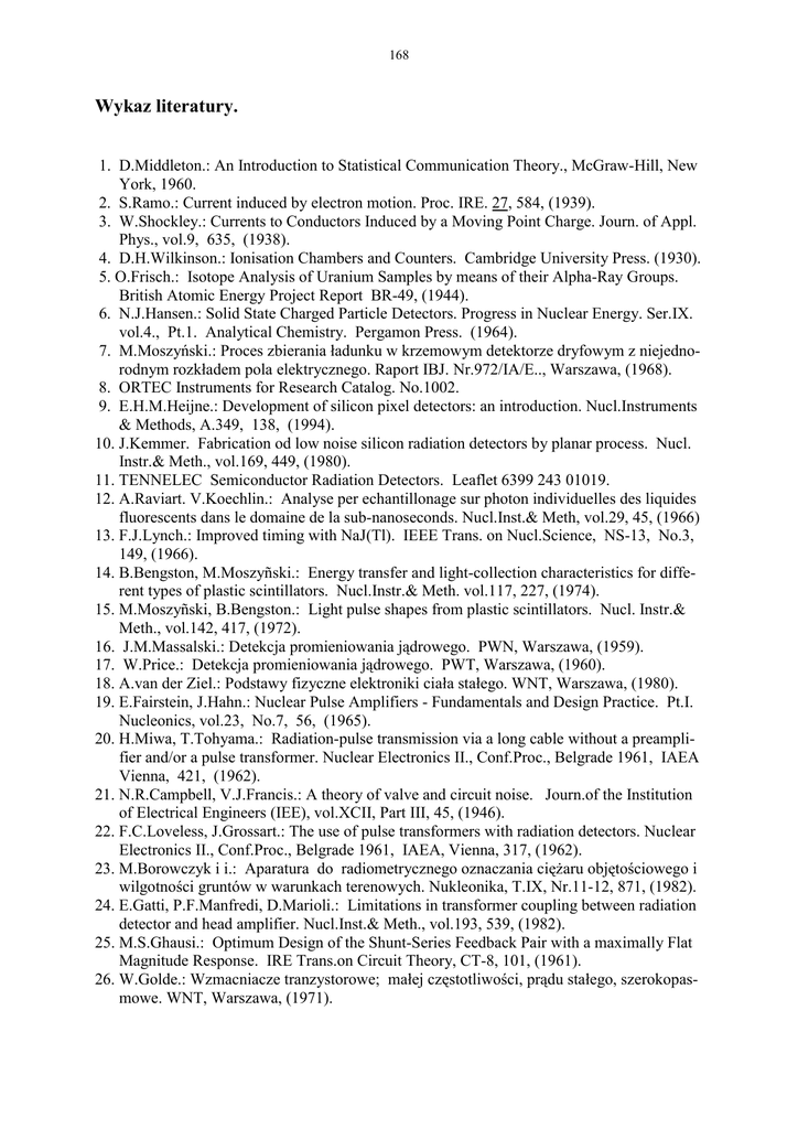 168 Wykaz literatury. 1. D.Middleton.: An Introduction to Statistical Communication Theory., McGraw-Hill, New York, 1960. 2. S.Ramo.: Current induced by electron motion. Proc. IRE. 27, 584, (1939). 3. W.Shockley.: Currents to Conductors Induced by a Moving Point Charge. Journ. of Appl. Phys., vol.9, 635, (1938). 4. D.H.Wilkinson.: Ionisation Chambers and Counters. Cambridge University Press. (1930). 5. O.Frisch.: Isotope Analysis of Uranium Samples by means of their Alpha-Ray Groups. British Atomic Energy Project Report BR-49, (1944). 6. N.J.Hansen.: Solid State Charged Particle Detectors. Progress in Nuclear Energy. Ser.IX. vol.4., Pt.1. Analytical Chemistry. Pergamon Press. (1964). 7. M.Moszyński.: Proces zbierania ładunku w krzemowym detektorze dryfowym z niejednorodnym rozkładem pola elektrycznego. Raport IBJ. Nr.972/IA/E.., Warszawa, (1968). 8. ORTEC Instruments for Research Catalog. No.1002. 9. E.H.M.Heijne.: Development of silicon pixel detectors: an introduction. Nucl.Instruments & Methods, A.349, 138, (1994). 10. J.Kemmer. Fabrication od low noise silicon radiation detectors by planar process. Nucl. Instr.& Meth., vol.169, 449, (1980). 11. TENNELEC Semiconductor Radiation Detectors. Leaflet 6399 243 01019. 12. A.Raviart. V.Koechlin.: Analyse per echantillonage sur photon individuelles des liquides fluorescents dans le domaine de la sub-nanoseconds. Nucl.Inst.& Meth, vol.29, 45, (1966) 13. F.J.Lynch.: Improved timing with NaJ(Tl). IEEE Trans. on Nucl.Science, NS-13, No.3, 149, (1966). 14. B.Bengston, M.Moszyñski.: Energy transfer and light-collection characteristics for different types of plastic scintillators. Nucl.Instr.& Meth. vol.117, 227, (1974). 15. M.Moszyñski, B.Bengston.: Light pulse shapes from plastic scintillators. Nucl. Instr.& Meth., vol.142, 417, (1972). 16. J.M.Massalski.: Detekcja promieniowania jądrowego. PWN, Warszawa, (1959). 17. W.Price.: Detekcja promieniowania jądrowego. PWT, Warszawa, (1960). 18. A.van der Ziel.: Podstawy fizyczne elektroniki ciała stałego. WNT, Warszawa, (1980). 19. E.Fairstein, J.Hahn.: Nuclear Pulse Amplifiers - Fundamentals and Design Practice. Pt.I. Nucleonics, vol.23, No.7, 56, (1965). 20. H.Miwa, T.Tohyama.: Radiation-pulse transmission via a long cable without a preamplifier and/or a pulse transformer. Nuclear Electronics II., Conf.Proc., Belgrade 1961, IAEA Vienna, 421, (1962). 21. N.R.Campbell, V.J.Francis.: A theory of valve and circuit noise. Journ.of the Institution of Electrical Engineers (IEE), vol.XCII, Part III, 45, (1946). 22. F.C.Loveless, J.Grossart.: The use of pulse transformers with radiation detectors. Nuclear Electronics II., Conf.Proc., Belgrade 1961, IAEA, Vienna, 317, (1962). 23. M.Borowczyk i i.: Aparatura do radiometrycznego oznaczania ciężaru objętościowego i wilgotności gruntów w warunkach terenowych. Nukleonika, T.IX, Nr.11-12, 871, (1982). 24. E.Gatti, P.F.Manfredi, D.Marioli.: Limitations in transformer coupling between radiation detector and head amplifier. Nucl.Inst.& Meth., vol.193, 539, (1982). 25. M.S.Ghausi.: Optimum Design of the Shunt-Series Feedback Pair with a maximally Flat Magnitude Response. IRE Trans.on Circuit Theory, CT-8, 101, (1961). 26. W.Golde.: Wzmacniacze tranzystorowe; małej częstotliwości, prądu stałego, szerokopasmowe. WNT, Warszawa, (1971). 169 27. J.B.S.Waugh, R.W.Nicholson.: Transistor Amplifier for Fast Proportional Counting. Nucleonics, vol.18., No.7., 70, (1960). 28. W³.D¹browski, J.De Wit.: Silicon strip front-end using a low-noise analog CMOS process. Nucl.Inst.& Methods in Physics Research, A 326, 82, (1993). 29. J.Fischer, A.Hrisoho, V.Radeka, P.Rehak.: Proportional chambers for very high counting rates based on gas mixtures of CF4 with hydrocarbons. Nucl.Instr.& Meth. in Physics Research, A 238, 249, (1985). 30. Alan Rudge.: Comparison of charge collection in semiconductor detectors and timing resolution, using a sub/nanosecond transimpedance amplifier. Nucl.Instr.& Meth. in Physics Research, A 360, 169, (1995). 31. H.Greinacher.: Über die akustische Beobachtung und galvanometrische Registrierung Elementarstrahlen und Einzelionen. Zeitschrift für Physik, vol.23, 361, (1924). 32. H.Greinacher.: Eine neue Methode zur Messung der Elementarstrahlen. Zeitschrift für Physik, vol.36, 364, (1926). 33. Hai Huang Chiang.: Basic Nuclear Electronics, New York, (1969). 34. А.Е.Воронков, Л.Н.Кораблев, И.Д.Мурин, И.В.Штрахин.: Быстродействующий могоканальный амплитудный анализатор. ВИНИТИ, Изд.АН СССР, (1957). 35. Instrukcja obsługi: Wzmacniacz liniowy Typ WI-1. Konstrukcyjno-prototypowa Spółdzielnia Pracy „EUREKA”, Warszawa, (1962). 36. Instrukcja obsługi: Wzmacniacz wejściowy Typ WW-1 Mod.B. Zakłady Wyrobów Elektrotechnicznych „ELTRA”, Bydgoszcz, (1963). 37. A.R.Pealman.: Some Properties and Circuit Applications of Super-Alpha Composed Transistor. IRE Trans.on Electron Devices, ED-2, No.1. (1955) 38. Ю.Т.Загорский, Д.Б.Левченко, В.М.Носов.: Измерительные усилители на транзисторах. Москва, (1971). 39. J.Pawłowski.: Podstawowe układy elektroniczne. Wzmacniacze i generatory. WKŁ, Warszawa, (1971). 40. Instrukcja obsługi: Sonda scyntylacyjna uniwersalna Typ SSU-70. Zjednoczone Zakłady Urządzeń Jądrowych „POLON”, Warszawa, (1978). 41. T.Dąbek, K.Korbel.: Sondy detekcyjne do pracy w systemie jednokablowego zasilania detektora i transmisji sygnału. Nukleonika, T.X., Nr.9-10, 619, (1965) 42. W.E.Wilson, A.W.Wakefield.: High Voltage-Powered Transistorized Preamplifier. Nuclear Electronics II, Conf.Proc., IAEA, Vienna, 385, (1962) 43. K.W.Pałka i i.: Czterokanałowy zestaw pomiarowy z licznikiem scyntylacyjnym NaJ(Tl) do profilowania płytkich otworów wiertniczych. Zeszyty Naukowe AGH Nr.646, Matematyka - Fizyka - Chemia, Zeszyt 36, (1978). 44. Poradnik inżyniera elek