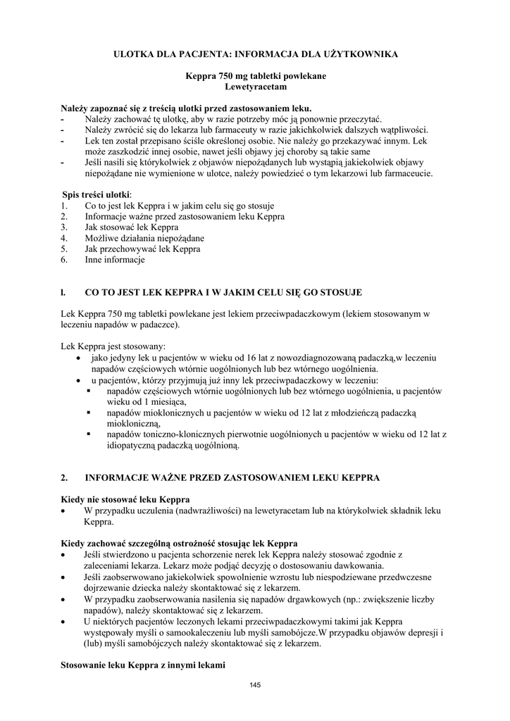 ULOTKA DLA PACJENTA: INFORMACJA DLA UŻYTKOWNIKA Keppra 750 mg tabletki powlekane Lewetyracetam Należy zapoznać się z treścią ulotki przed zastosowaniem leku. Należy zachować tę ulotkę, aby w razie potrzeby móc ją ponownie przeczytać. Należy zwrócić się do lekarza lub farmaceuty w razie jakichkolwiek dalszych wątpliwości. Lek ten został przepisano ściśle określonej osobie. Nie należy go przekazywać innym. Lek może zaszkodzić innej osobie, nawet jeśli objawy jej choroby są takie same Jeśli nasili się którykolwiek z objawów niepożądanych lub wystąpią jakiekolwiek objawy niepożądane nie wymienione w ulotce, należy powiedzieć o tym lekarzowi lub farmaceucie. Spis treści ulotki: 1. Co to jest lek Keppra i w jakim celu się go stosuje 2. Informacje ważne przed zastosowaniem leku Keppra 3. Jak stosować lek Keppra 4. Możliwe działania niepożądane 5. Jak przechowywać lek Keppra 6. Inne informacje l. CO TO JEST LEK KEPPRA I W JAKIM CELU SIĘ GO STOSUJE Lek Keppra 750 mg tabletki powlekane jest lekiem przeciwpadaczkowym (lekiem stosowanym w leczeniu napadów w padaczce). Lek Keppra jest stosowany: • jako jedyny lek u pacjentów w wieku od 16 lat z nowozdiagnozowaną padaczką,w leczeniu napadów częściowych wtórnie uogólnionych lub bez wtórnego uogólnienia. • u pacjentów, którzy przyjmują już inny lek przeciwpadaczkowy w leczeniu: napadów częściowych wtórnie uogólnionych lub bez wtórnego uogólnienia, u pacjentów wieku od 1 miesiąca, napadów mioklonicznych u pacjentów w wieku od 12 lat z młodzieńczą padaczką miokloniczną, napadów toniczno-klonicznych pierwotnie uogólnionych u pacjentów w wieku od 12 lat z idiopatyczną padaczką uogólnioną. 2. INFORMACJE WAŻNE PRZED ZASTOSOWANIEM LEKU KEPPRA Kiedy nie stosować leku Keppra • W przypadku uczulenia (nadwrażliwości) na lewetyracetam lub na którykolwiek składnik leku Keppra. Kiedy zachować szczególną ostrożność stosując lek Keppra • Jeśli stwierdzono u pacjenta schorzenie nerek lek Keppra należy stosować zgodnie z zaleceniami lekarza. Lekarz może podjąć decyzję o dostosowaniu dawkowania. • Jeśli zaobserwowano jakiekolwiek spowolnienie wzrostu lub niespodziewane przedwczesne dojrzewanie dziecka należy skontaktować się z lekarzem. • W przypadku zaobserwowania nasilenia się napadów drgawkowych (np.: zwiększenie liczby napadów), należy skontaktować się z lekarzem. • U niektórych pacjentów leczonych lekami przeciwpadaczkowymi takimi jak Keppra występowały myśli o samookaleczeniu lub myśli samobójcze.W przypadku objawów depresji i (lub) myśli samobójczych należy skontaktować się z lekarzem. Stosowanie leku Keppra z innymi lekami 145 Należy powiedzieć lekarzowi o wszystkich przyjmowanych ostatnio lekach, również tych, które wydawane są bez recepty. Stosowanie leku Keppra z jedzeniem i piciem Lek Keppra można przyjmować z posiłkiem lub bez posiłku. Ze względów bezpieczeństwa podczas przyjmowania leku Keppra nie należy pić alkoholu. Ciąża i karmienie piersią Przed zastosowaniem jakiegokolwiek leku należy poradzić się lekarza lub farmaceuty. Należy poinformować lekarza jeżeli pacjentka jest lub może być w ciąży. Lek Keppra nie powinien być stosowany w ciąży, jeżeli nie jest to bezwzględnie konieczne. Potencjalne ryzyko dla płodu nie jest znane. W badaniach na zwierzętach lek Keppra stosowany w dawkach większych niż stosowane w celu kontroli napadów drgawkowych, wykazał niepożądany wpływ na rozrodczość. Podczas leczenia nie zaleca się karmienia piersią. Prowadzenie pojazdów i obsługiwanie maszyn: Lek Keppra może zaburzać zdolność prowadzenia pojazdów i obsługiwania jakichkolwiek narzędzi lub maszyn, gdyż stosowanie leku Keppra może powodować senność. Jest to bardziej prawdopodobne na początku leczenia lub po zwiększeniu dawki leku. Nie zaleca sie prowadzenia pojazdów i obsługi maszyn dopóki nie jest znany wpływ leku na zdolność pacjenta do wykonywania tych czynności. Ważne informacje o niektórych składnikach leku Keppra Keppra 750 mg zawiera żółcień pomarańczową lak glinowy FCF (E110). Substancja barwiąca żółcień pomarańczowa lak glinowy FCF (E110) może wywoływać reakcję alergiczną. 3. JAK STOSOWAĆ LEK KEPPRA Lek Keppra należy zawsze stosować zgodnie z zaleceniami lekarza. W razie wątpliwości należy skontaktować się z lekarzem. Lek Keppra musi być przyjmowany dwa razy na dobę, rano i wieczorem, mniej więcej o tej samej porze każdego dnia. Należy przyjmować liczbę tabletek zgodną z zaleceniemi lekarza. Monoterapia Dawka u dorosłych i młodzieży (w wieku od 16 lat): Zazwyczaj stosowana dawka: od 1000 mg i 3000 mg na dobę. Jeżeli pacjent przyjmuje lek po raz pierwszy, lekarz zaleci mniejszą dawkę przez 2 tygodnie przed zaleceniem najmniejszej zazwyczaj stosowanej dawki. Przykładowo, jeśli dawka dobowa wynosi 3000 mg, należy przyjmować 2 tabletki rano i 2 tabletki wieczorem. Leczenie wspomagające Dawka u dorosłych i młodzieży (w wieku od 12 do 17 lat) o masie ciała 50 kg lub powyżej: Zazwyczaj stosowana Dawka: od 1000 mg do 3000 mg na dobę. Przykładowo, jeśli dawka dobowa wynosi 1500 mg, należy przyjmować 1 tabletkę rano i 1 tabletkę wieczorem. Dawka u niemowląt i dzieci (w wieku od 6 do 23 miesięcy), dzieci (w wieku od 2 do 11 lat) i młodzieży (od 12 do 17 lat) o masie ciała poniżej 50 kg: Lekarz zaleci najbardziej odpowiednią postać leku Keppra w zależności od masy ciała i dawki. Keppra roztwór doustny 100 mg/ml i Keppra tabletki powlekane 250 mg są postaciami bardziej odpowiednimi do stosowania u niemowląt i małych dzieci. 146 Dawka u niemowląt (w wieku od 1 do poniżej 6 miesięcy): Dla niemowląt najbardziej odpowiednią postacią leku Keppra jest 100 mg/ml roztwór doustny. Sposób podawania: Tabletki należy połykać popijając wystarczającą ilością płynu (np. szklanką wody). Cza